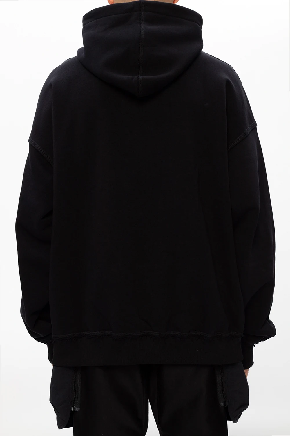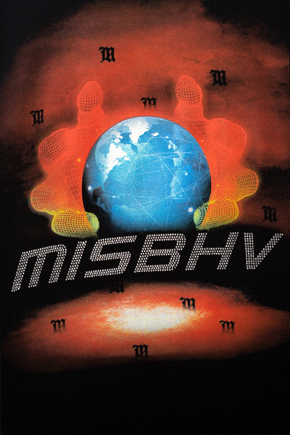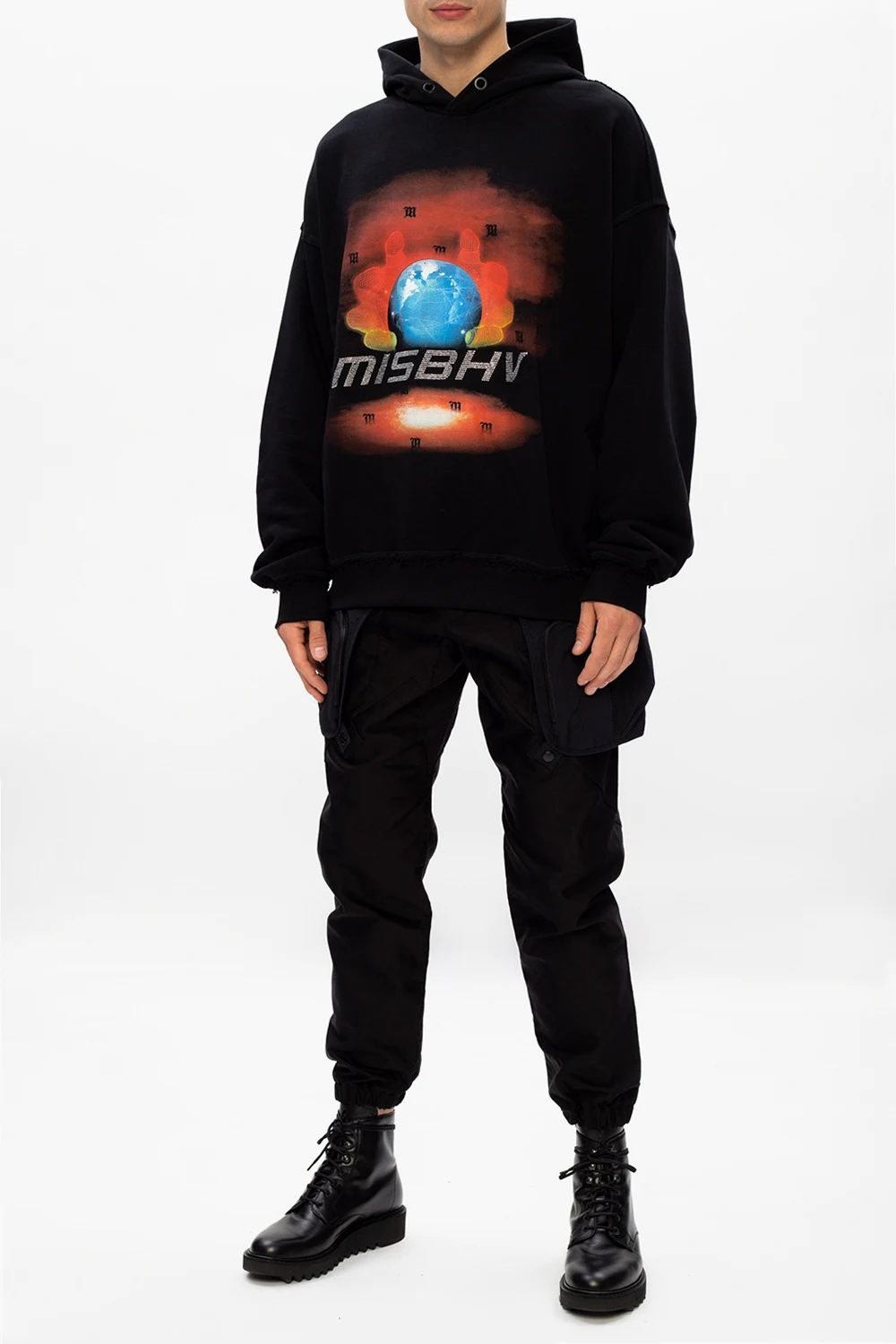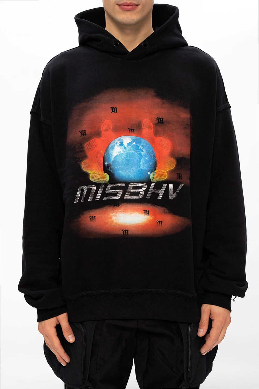 Black \'Globe\' hoodie from MISBHV. Crafted from cotton jersey, this style is complete with raw edges, rib trims and a colourful graphic print, enhanced by silver-tone glitter logo.