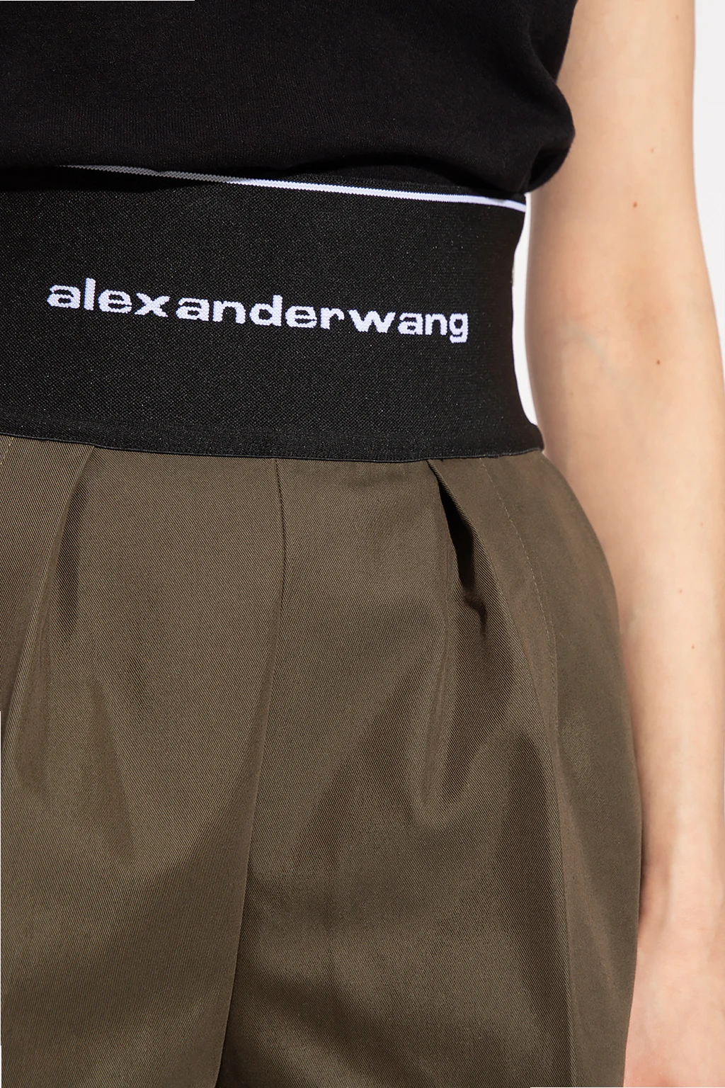 Dark green pleat-front shorts from Alexander Wang. Made of cotton, this pair features a side zip, an elastic black waistband embroidered with a white logo, two front pocket, one back pocket and slightly tapered legs.