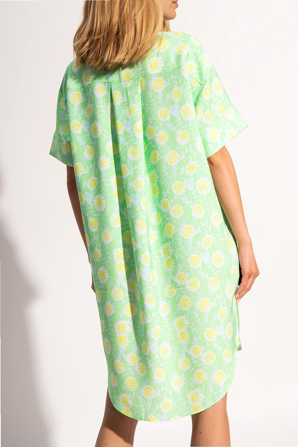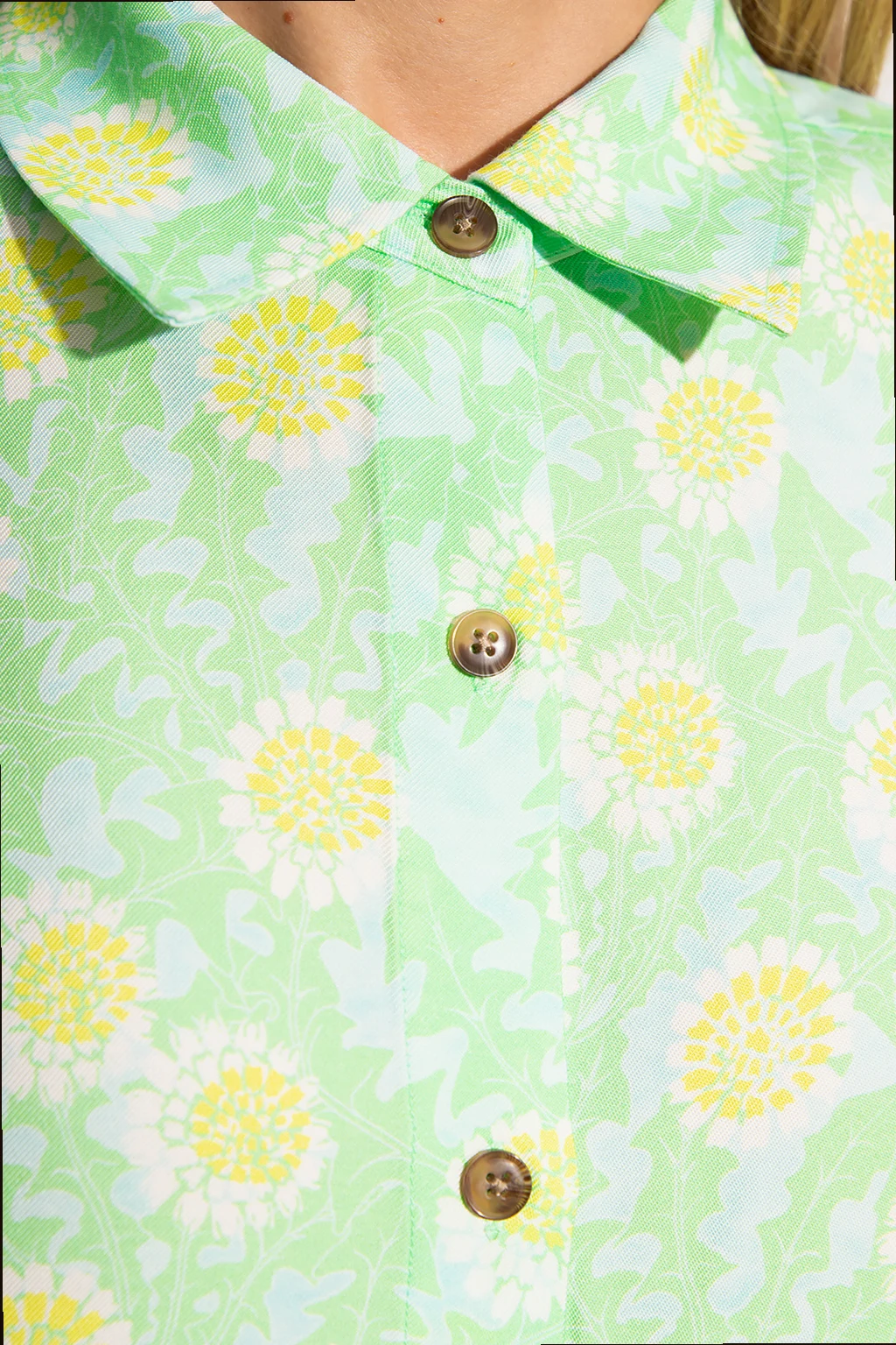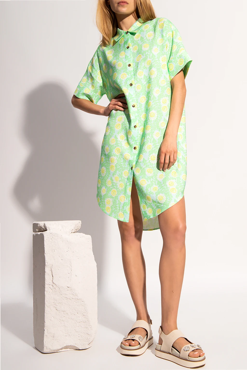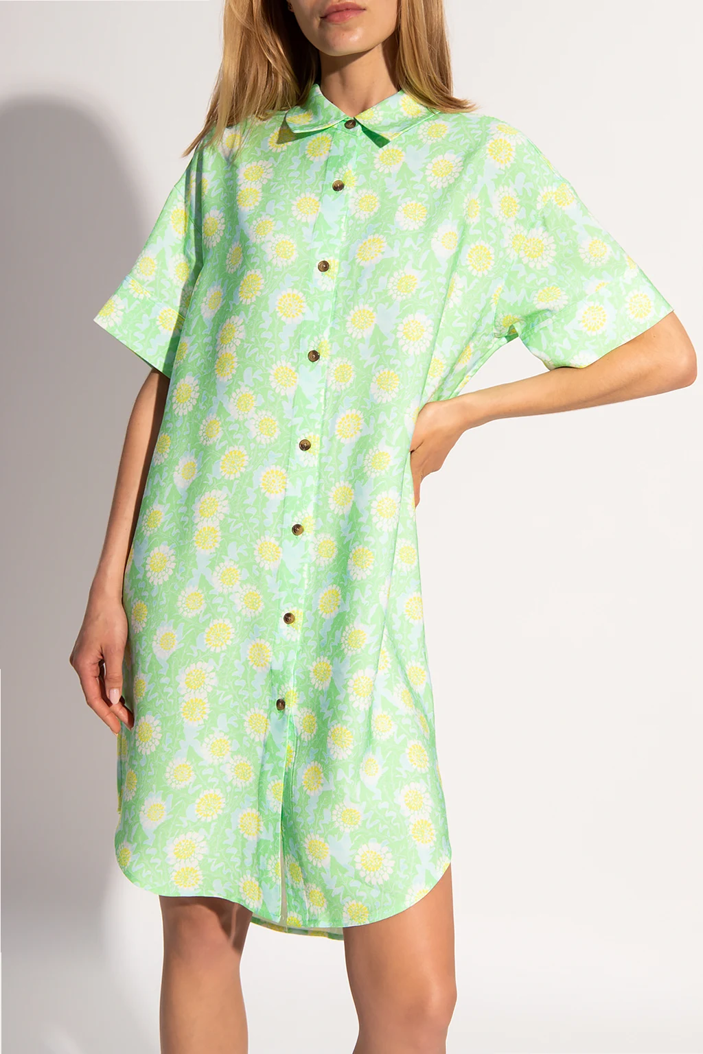 Green dress from Holzweiler. Fastened with buttons, this short sleeve design is decorated with a floral pattern in white, green and blue.
