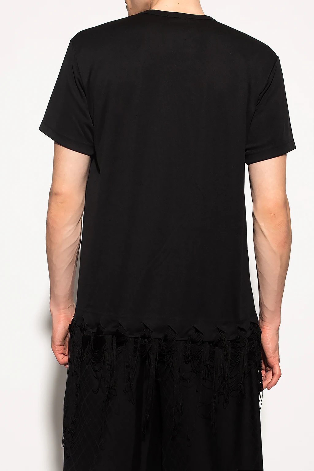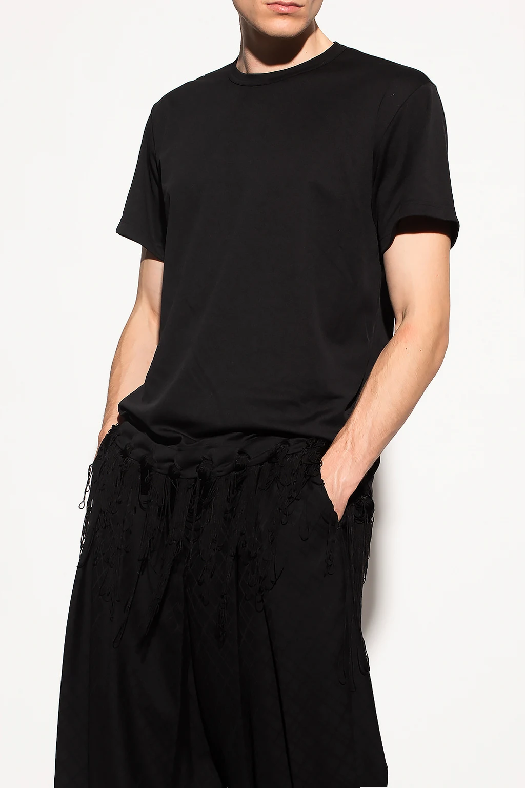 Black crewneck T-shirt from Comme Des Garçons Homme Plus. Made of cotton, this short sleeve design is enriched by woven details and fringes.