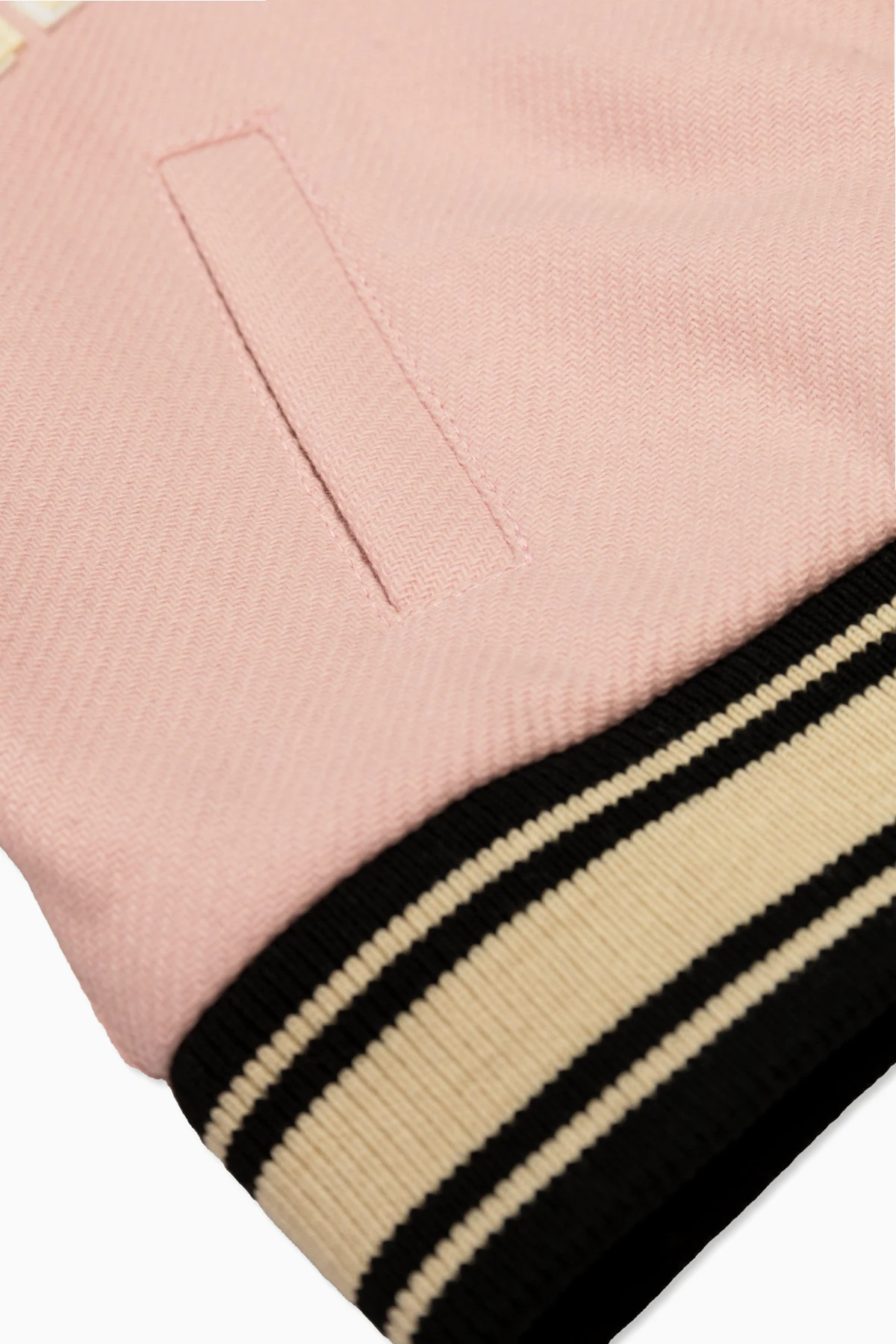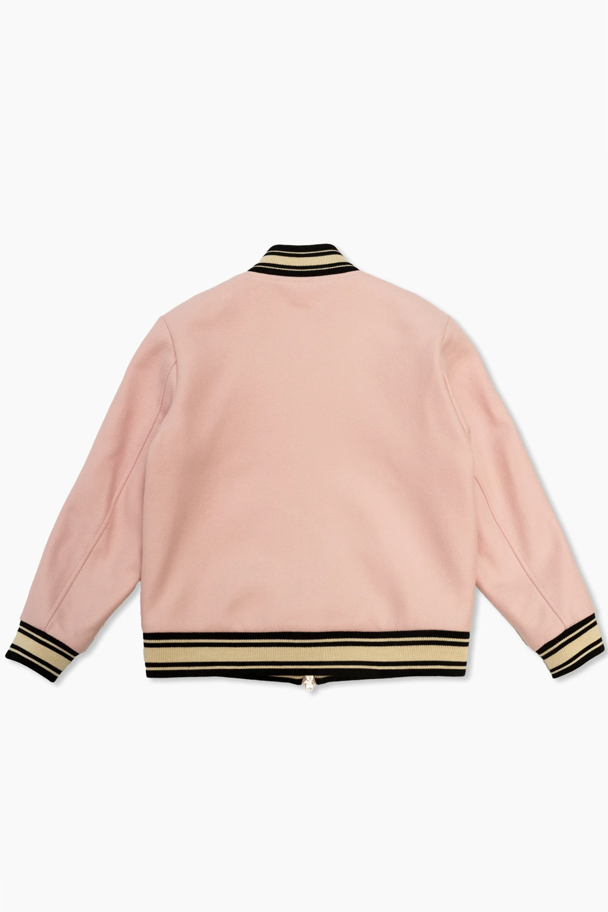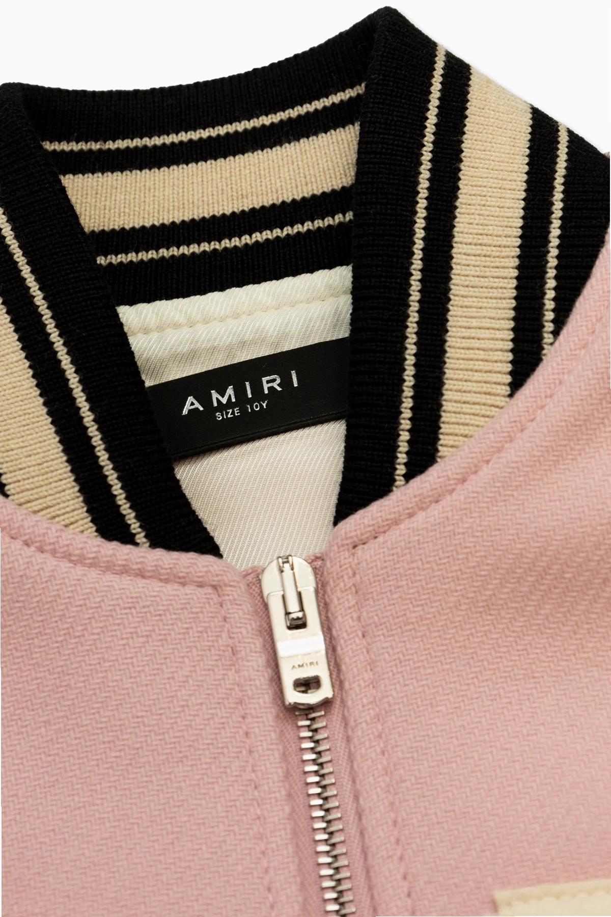 Introducing the epitome of chic and sporty elegance - the Amiri Kids Bomber Jacket. Crafted with a keen eye for detail, this jacket exhibits a harmonious blend of style and functionality. Its vibrant pink hue is beautifully offset by the striking contrast of black and cream striped ribbing at the cuffs and hem, adding a dash of sophistication to the classic bomber silhouette. The jacket\'s front dazzles with bold, light-colored letters from the designer\'s name, creating a compelling visual contrast against the jacket\'s backdrop. Practicality meets style with two seamlessly integrated front pockets, while the back of the jacket remains sleek and unadorned, emphasizing the design\'s minimalist elegance. A subtle, discreet metal plaque, possibly a nod to the designer\'s logo, adorns the lower hem, adding a touch of exclusivity. Made from a luxurious blend of 75% wool and 25% polyamide for the outer layer, and a 100% viscose lining, this jacket promises not only high-quality aesthetics but also comfort and durability. Additionally, the jacket features a dual-direction zipper for easy wear and leather inserts that elevate its overall appeal. Why Purchase This Product? Premium Materials: High-quality wool blend exterior and viscose lining. Exquisite Design Details: Contrasting striped ribbing, designer lettering, and leather inserts. Functionality: Dual-direction zipper and water-repellent properties. Exclusive Branding: Discreet designer logo for an added touch of luxury.