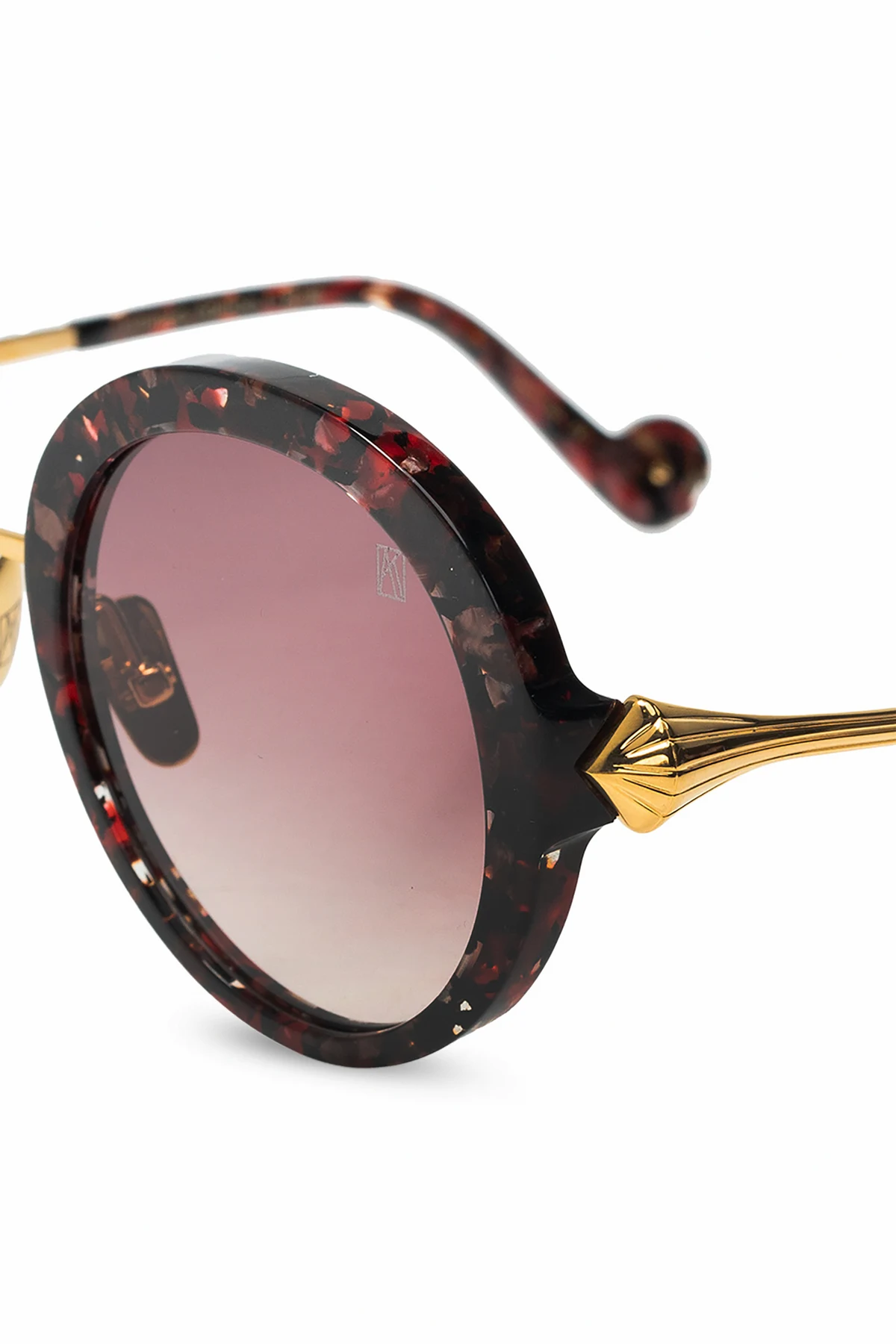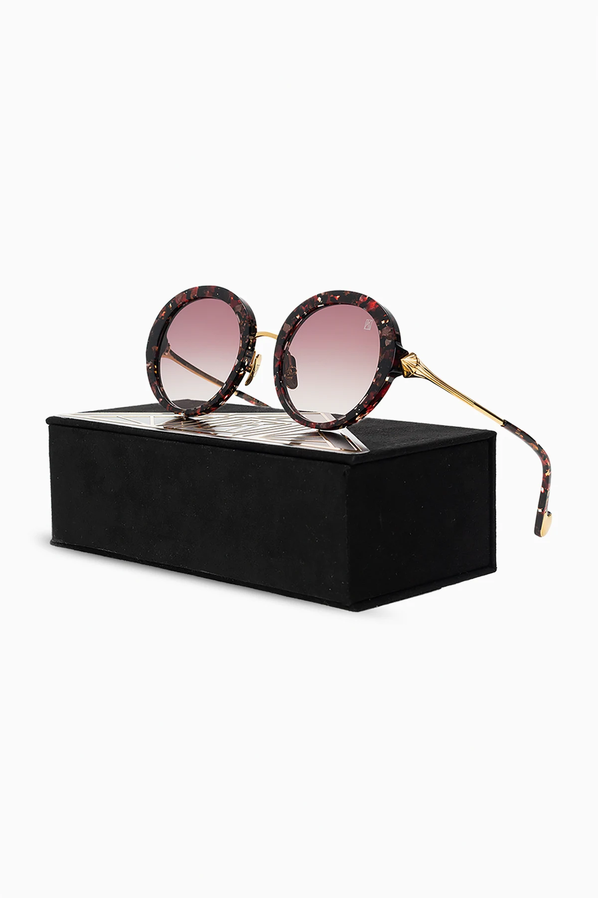 Red and black sunglasses from Anna Karin Karlsson. Plated with 24 carat gold, this pair features a logo print and dark purple certificated lenses with protection against UVA/UVB rays. Protective case included.