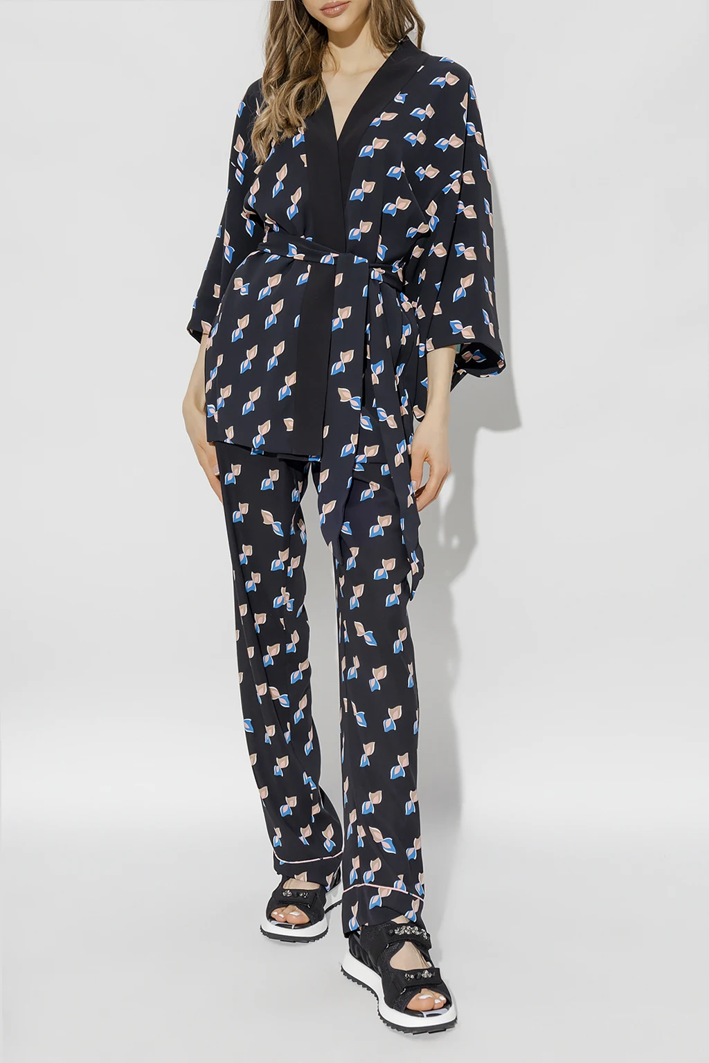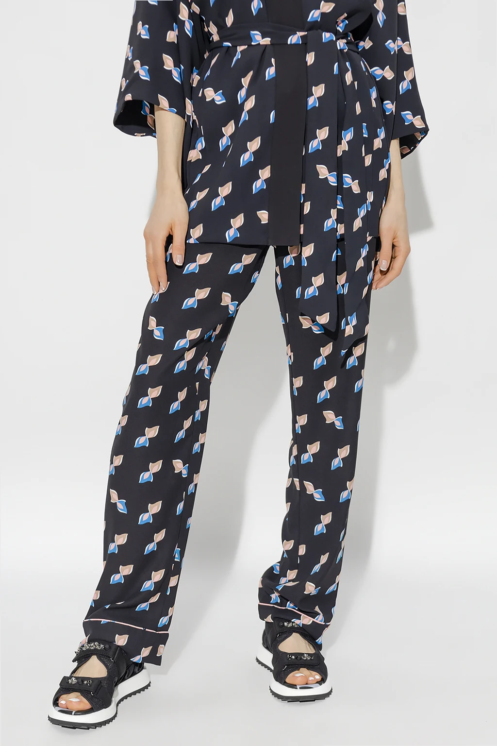 Black ‘Veronica’ pyjama style trousers from Diane Von Furstenberg. This pair features an elastic drawstring waistband, multicolored geometric pattern and two slip pockets.