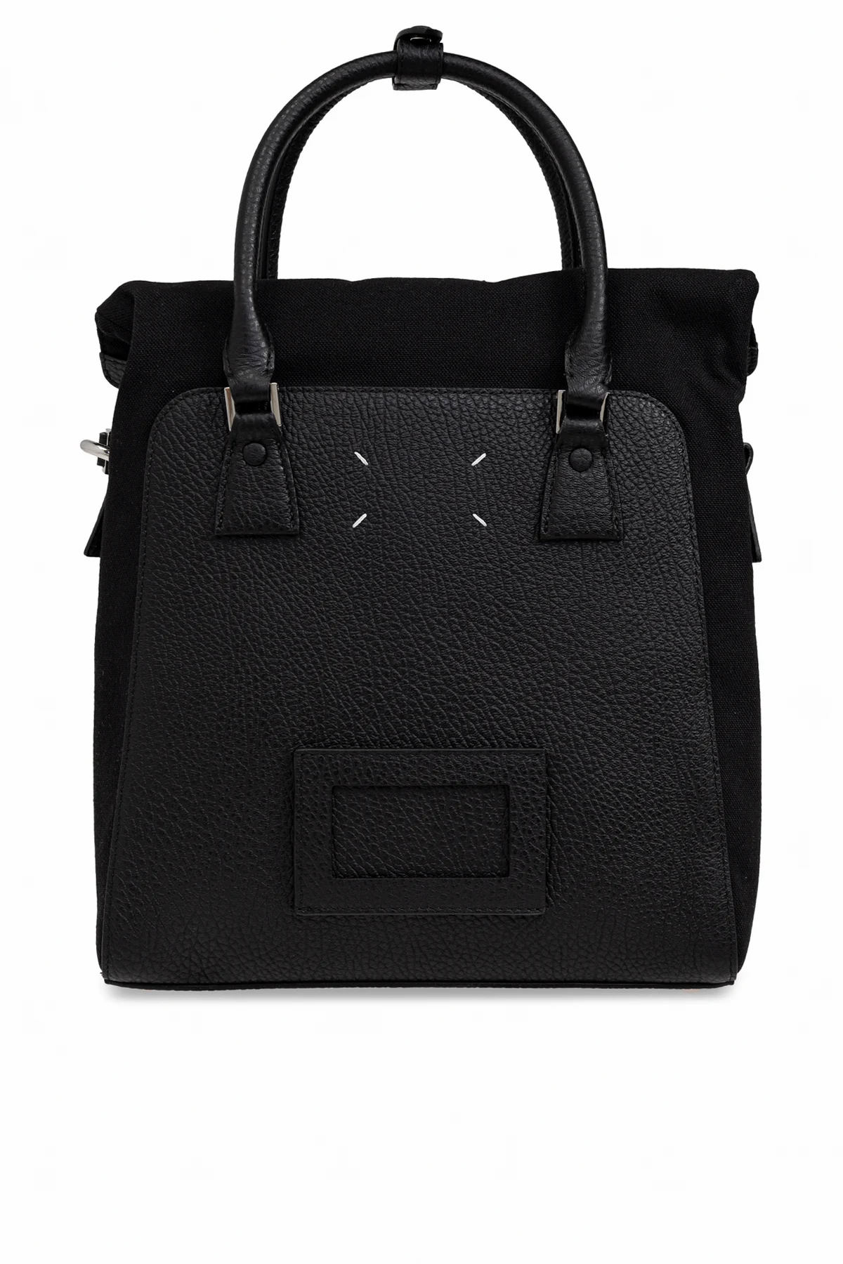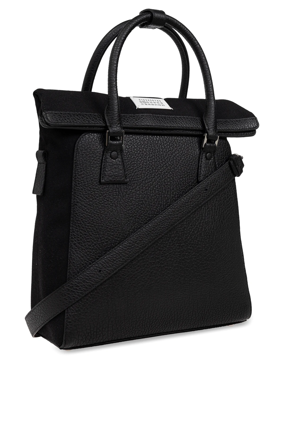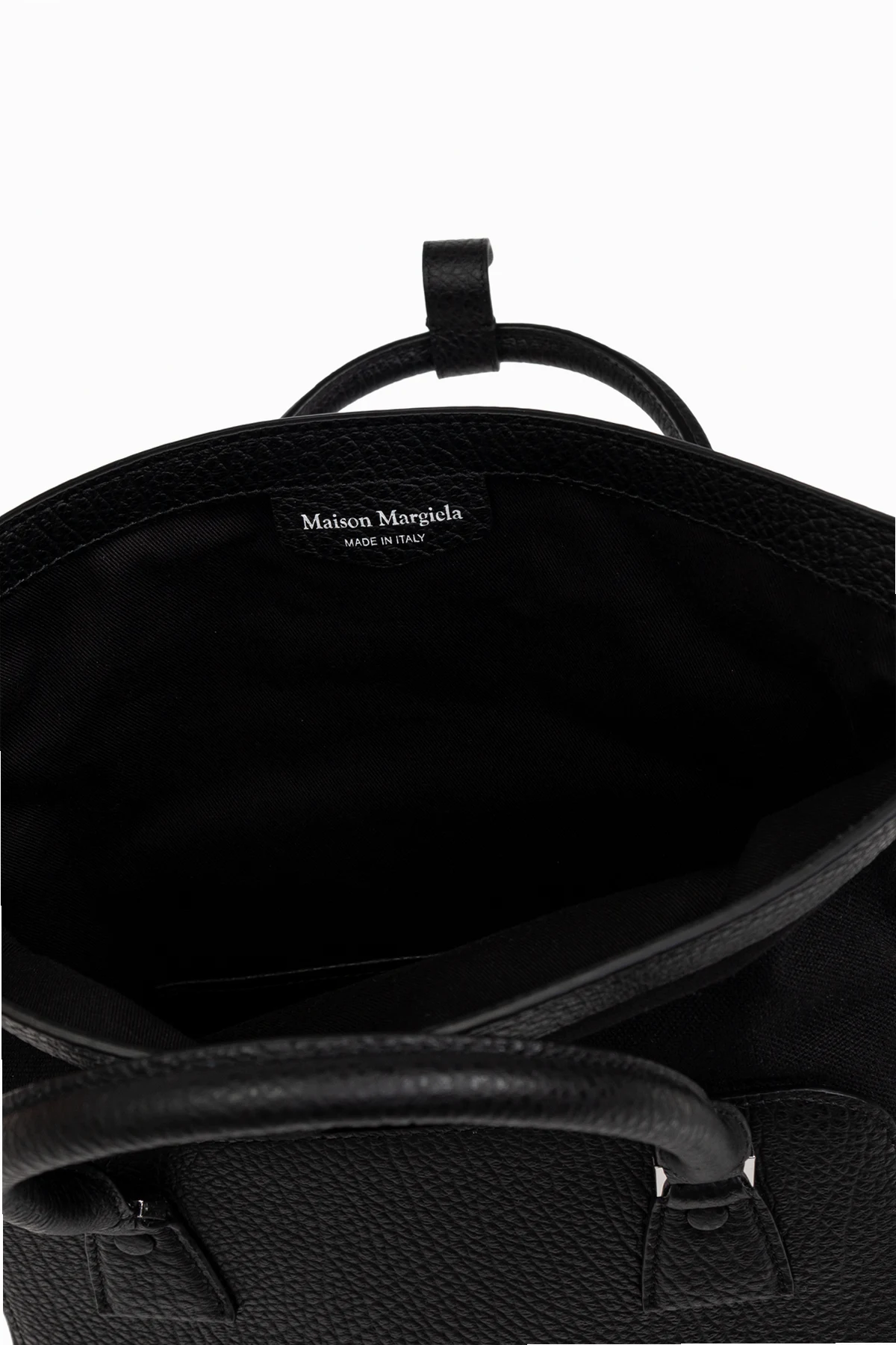 Introducing the ‘5AC’ Bag by the illustrious Maison Margiela, a paragon of contemporary sophistication. This exquisite accessory, crafted from premium leather with a distinct texture, embodies the perfect union of functionality and elegant minimalism. The bag\'s rectangular silhouette with gracefully rounded edges ensures a capacious and reliable companion for everyday use. Adorned with two robust handles and a versatile, adjustable shoulder strap, it offers multiple wearing options to suit your style. A signature label with numerical codes graces the front, a nod to the brand’s iconic identity. Within, the spacious interior is lined with branded fabric, featuring a practical slip pocket, and proudly displaying the Maison Margiela logo and \"Made in Italy\" inscription, affirming its luxurious origin. Why Choose This Product? Expertly crafted from high-quality leather. Timeless black hue for universal elegance. Functional design with ample storage and adjustable strap. Distinctive Maison Margiela branding and Italian craftsmanship.