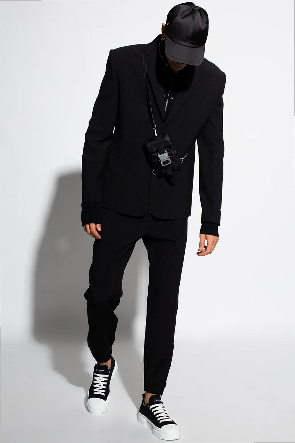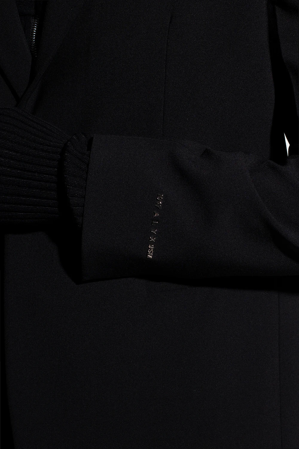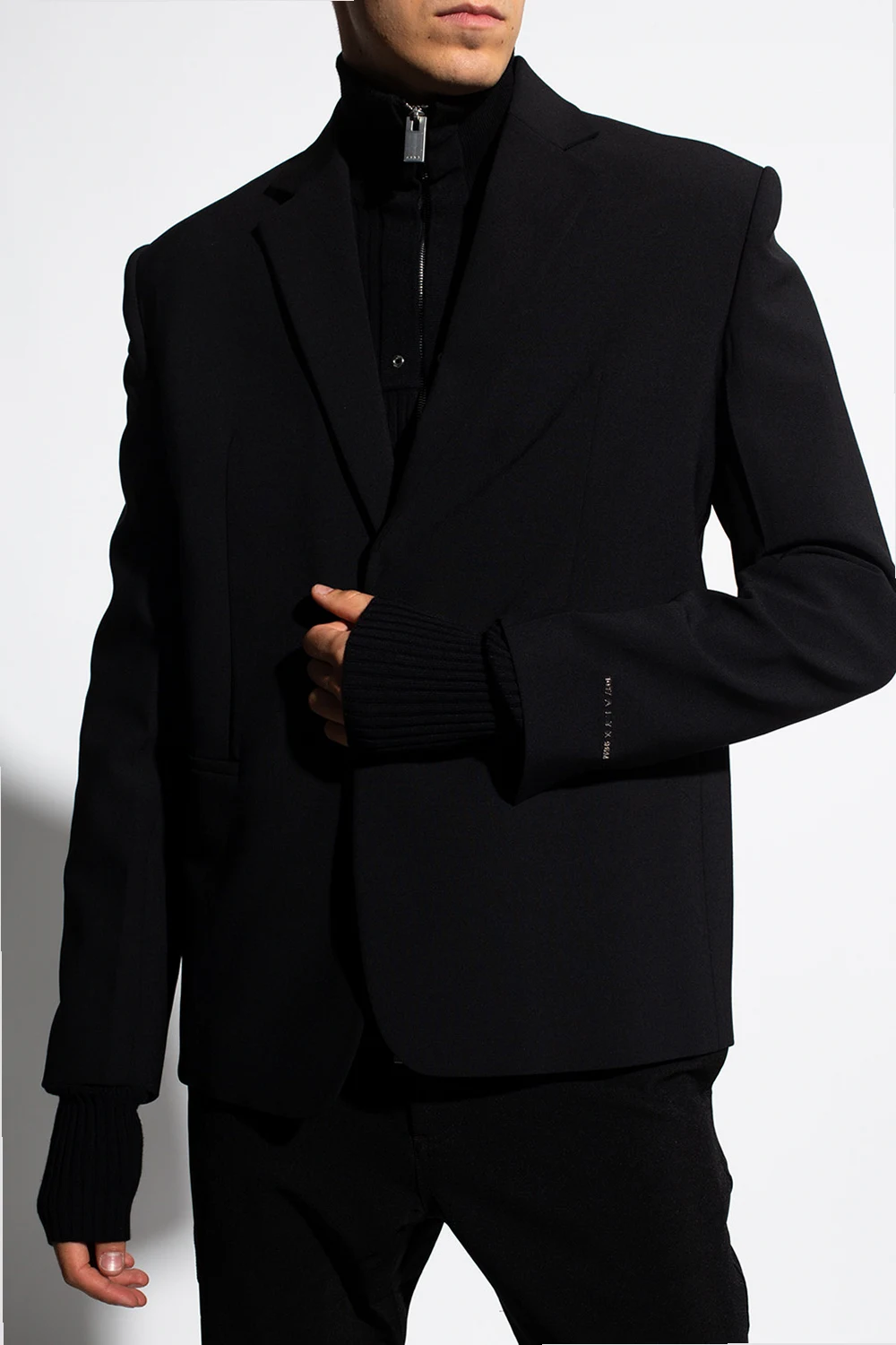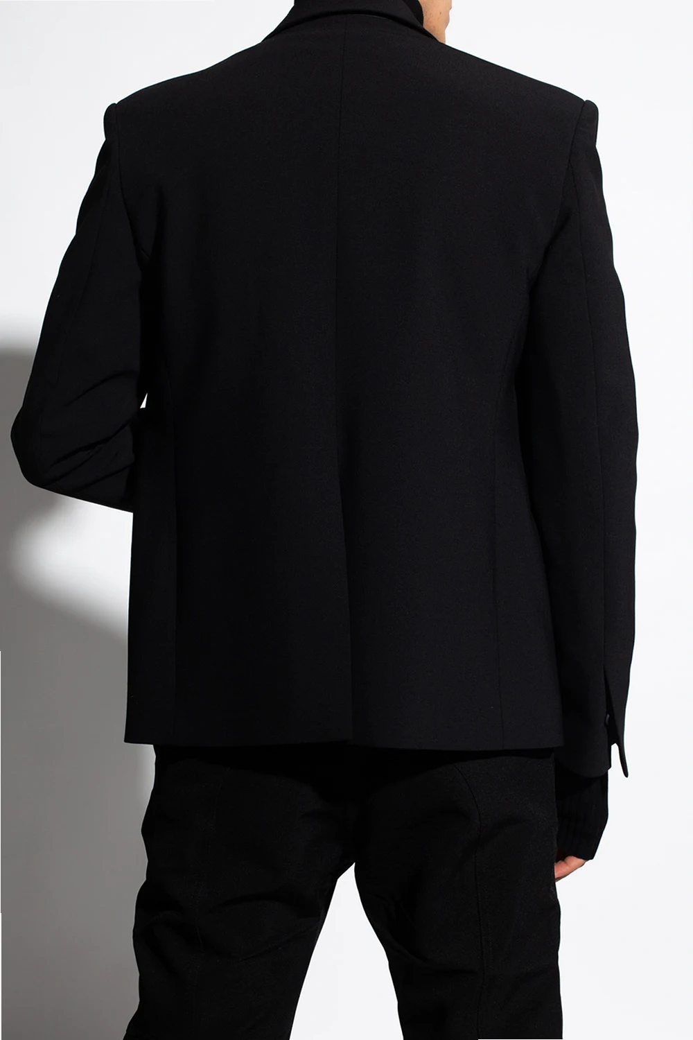 Black blazer from 1017 ALYX 9SM. Fastened with buttons, this garment features padded shoulders, notch lapels, two slip pockets, single rear vent and button cuffs.