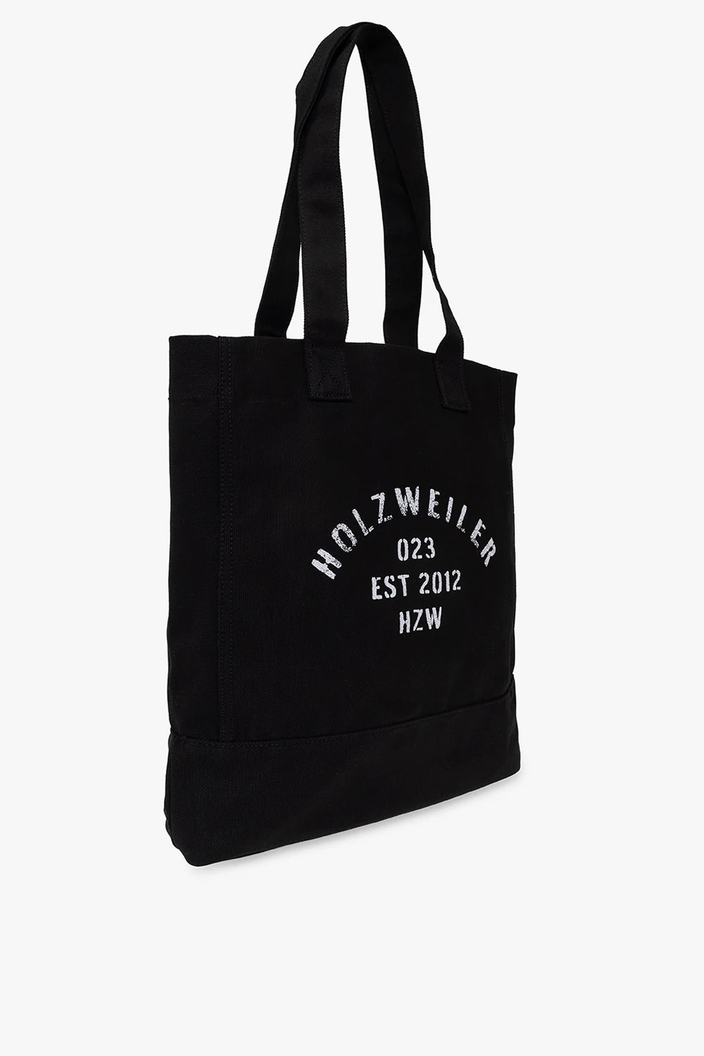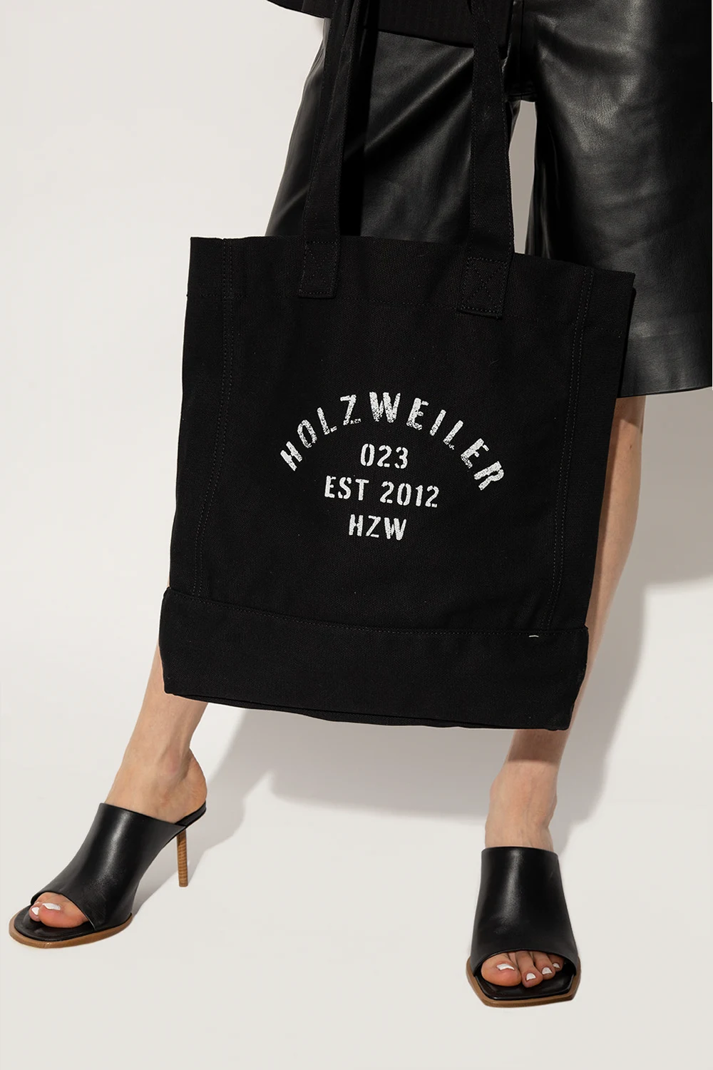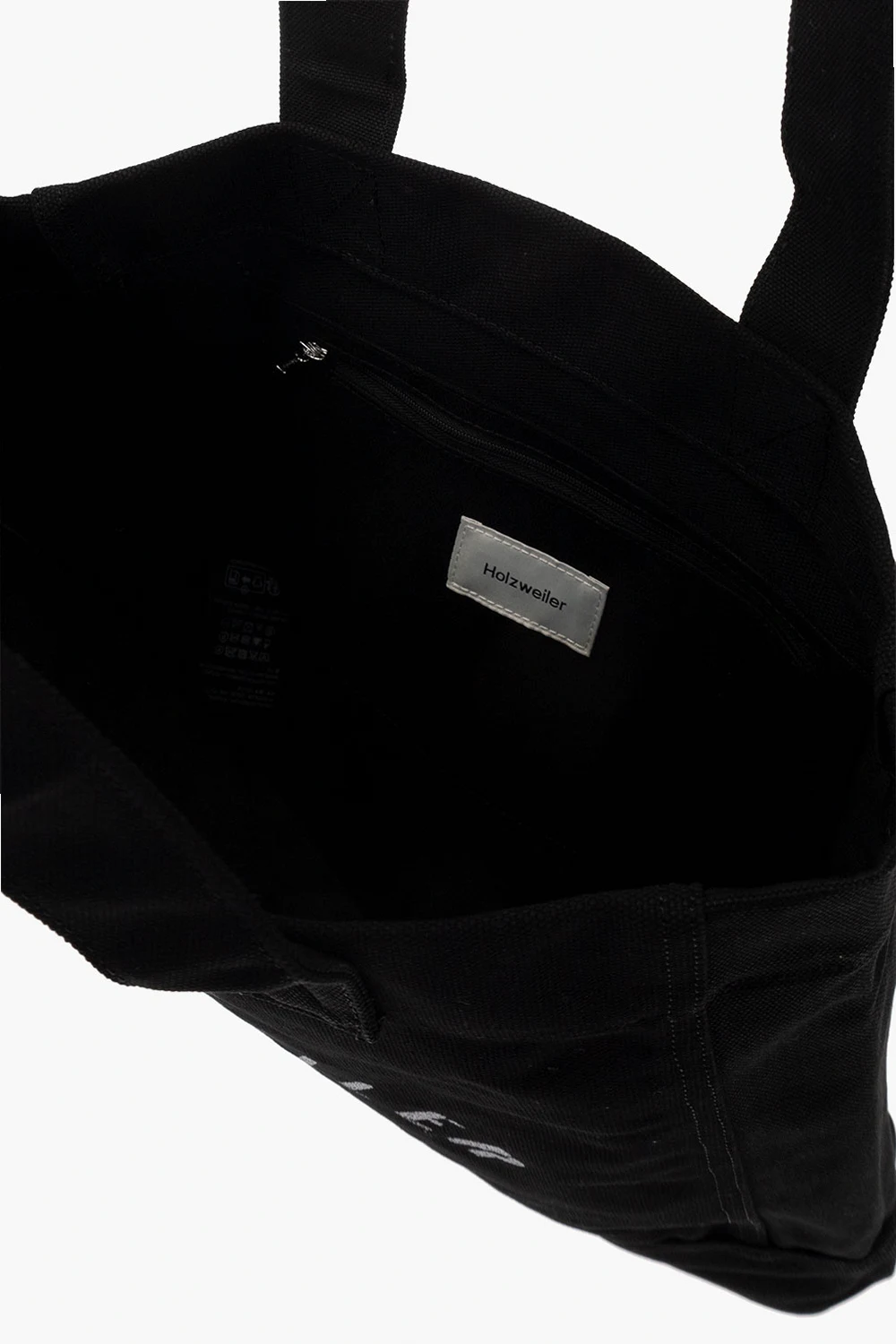 Black \'Alta\' shopper bag from Holzweiler. Crafted from cotton canvas, this design showcases a printed white logo, two half-round handles, black metal hardware and one internal compartment with a zip pocket.