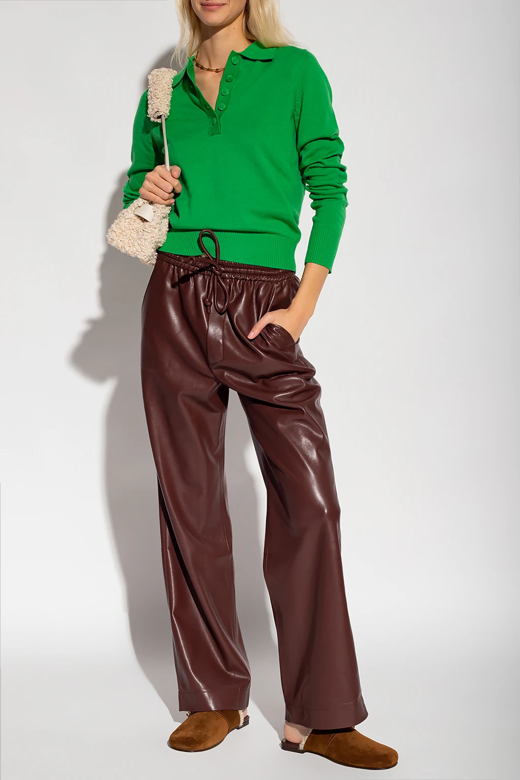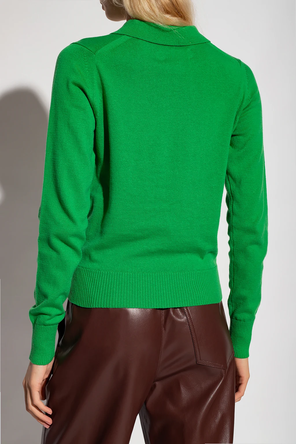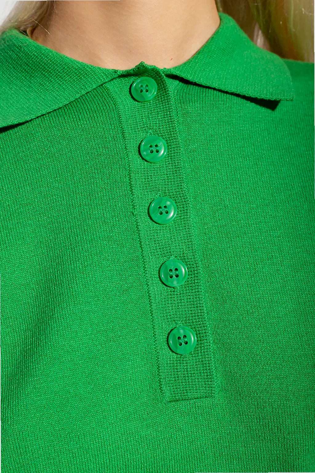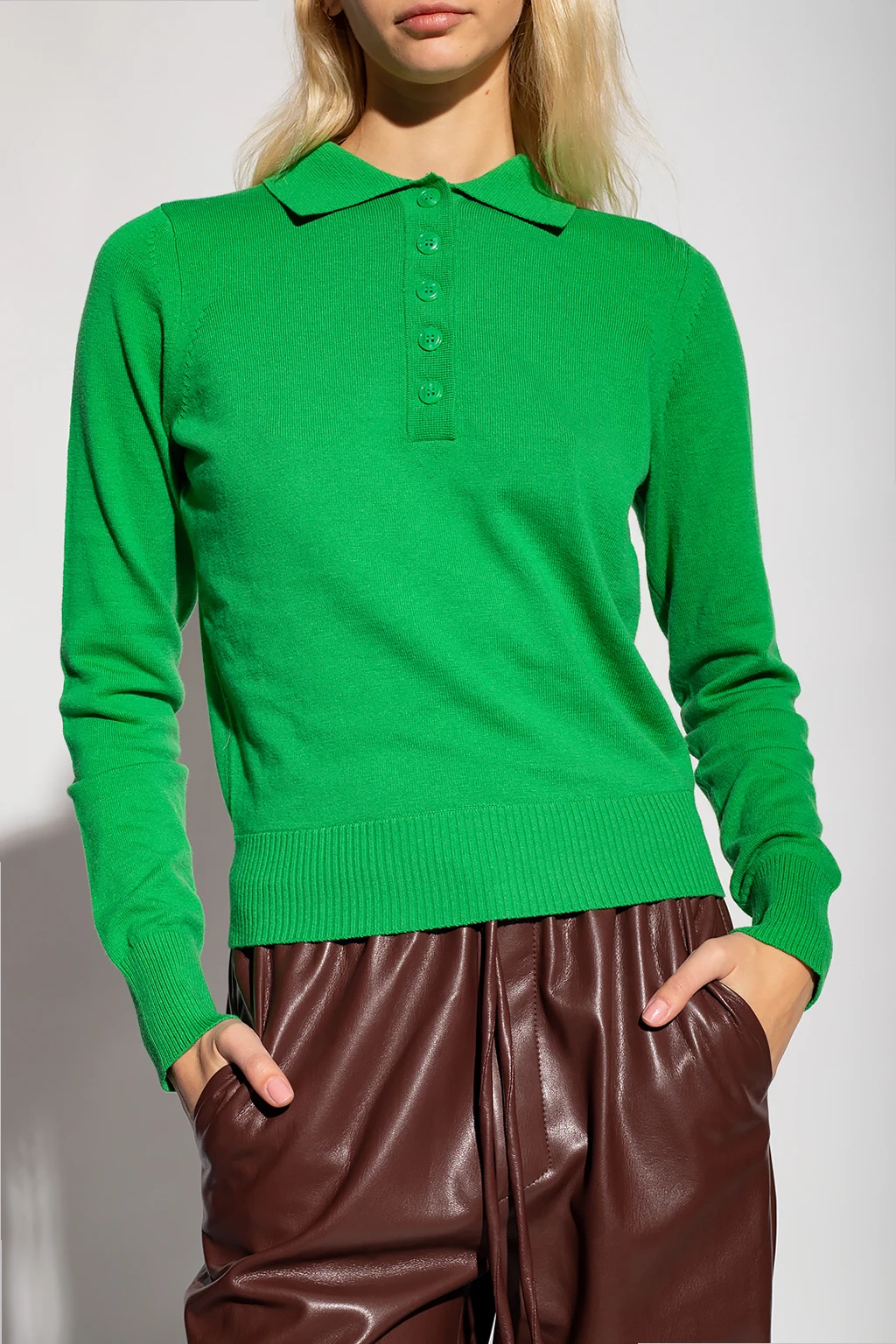 Green \'Thea’ top from Samsoe Samsoe. Crafted from a wool and cotton blend, this style features long sleeves and a collar with button closures.