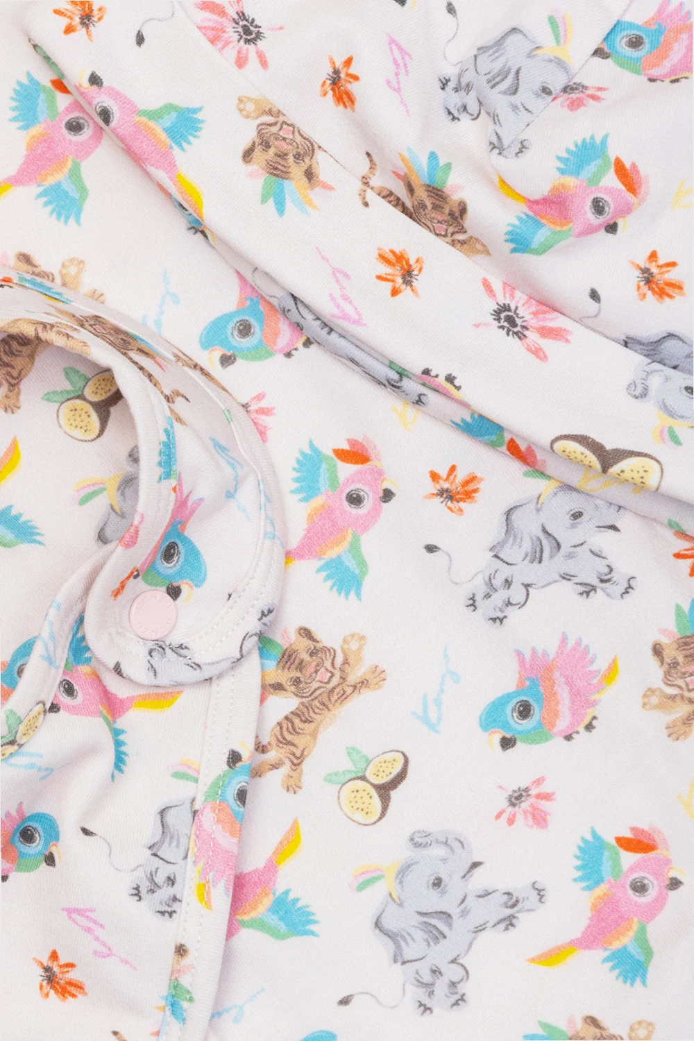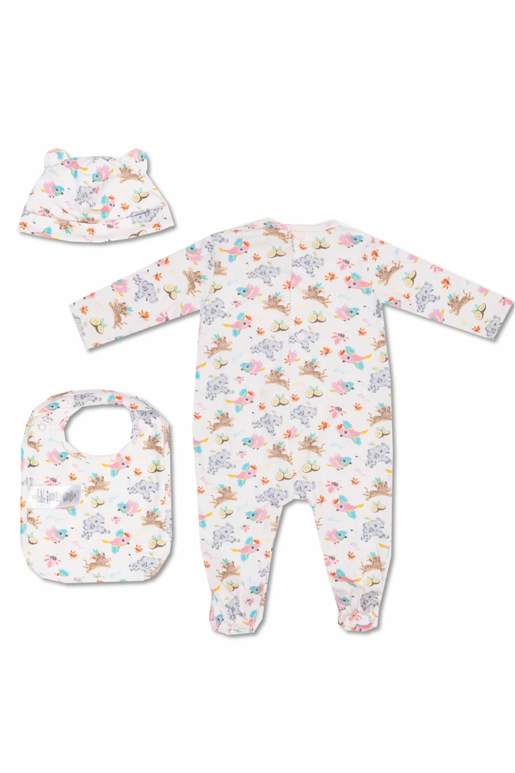 Light pink romper suit, bib and hat set from Kenzo Kids. Made of cotton, each item showcases a colourful animal motif.