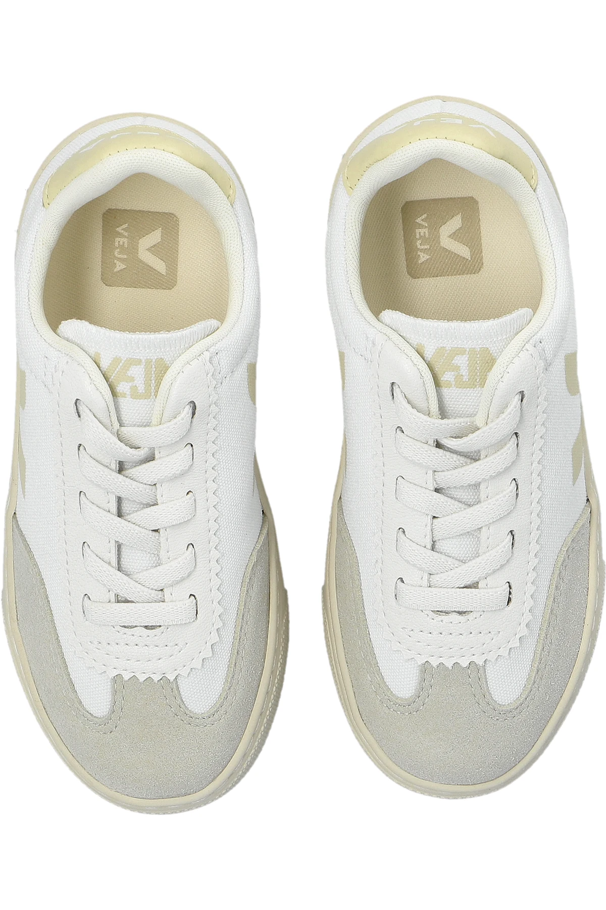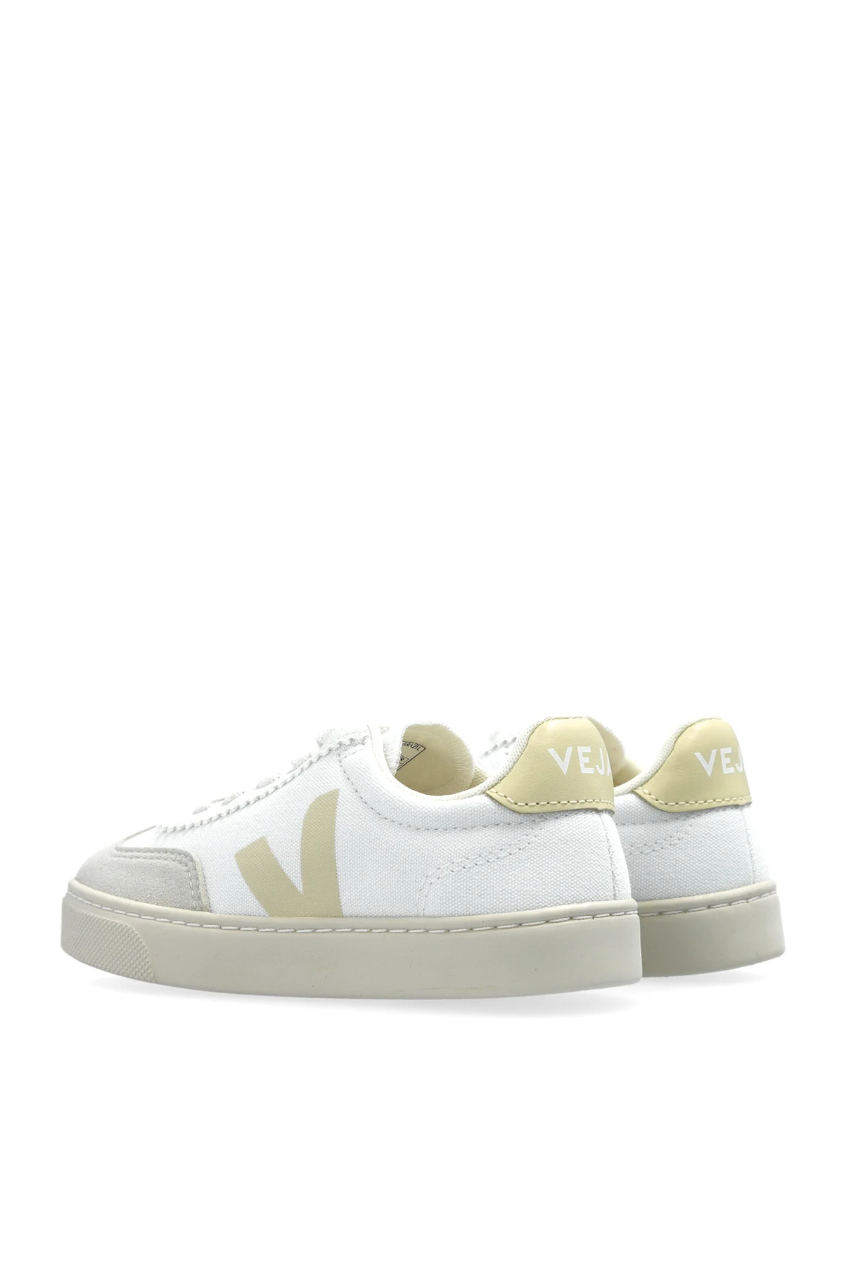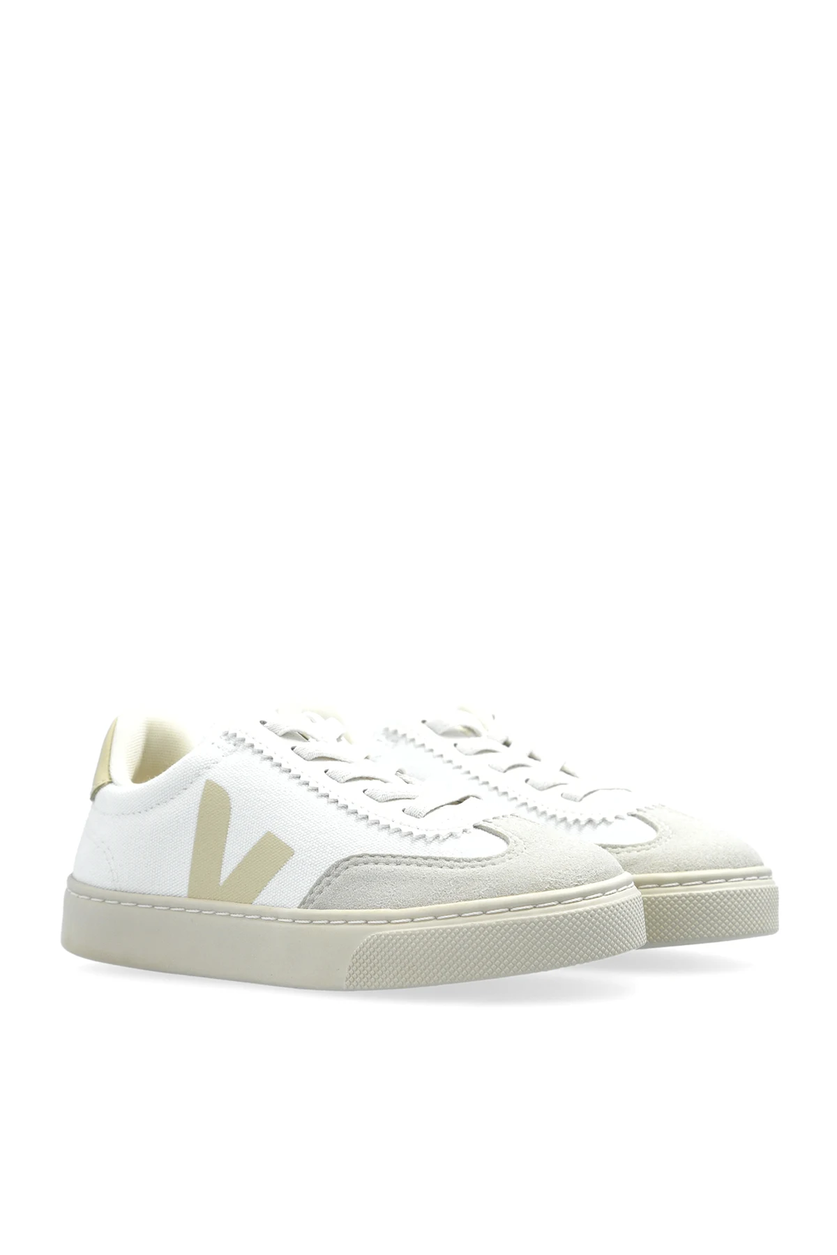 Introducing the SMALL VOLLEY CANVAS children\'s sneakers by Veja Kids, a paragon of minimalist elegance and sustainable craftsmanship. These immaculate white sneakers, adorned with the iconic \"V\" logo, embody a classic sneaker silhouette with a rounded toe, crafted meticulously from premium canvas complemented by suede accents on the toe and heel. A beige Veja emblem graces the heel and interior, while the creamy rubber sole provides a subtle contrast, harmonizing with the pristine white laces. The brand\'s dedication to sustainability is evident in its use of vegetable-tanned leather, organic cotton, and natural rubber, all sourced responsibly from Brazil. Why Choose This Product? Timeless design with subtle and playful details. Eco-friendly materials promoting environmental consciousness. Exceptional quality and comfort for young feet. Transparent and ethical manufacturing process.