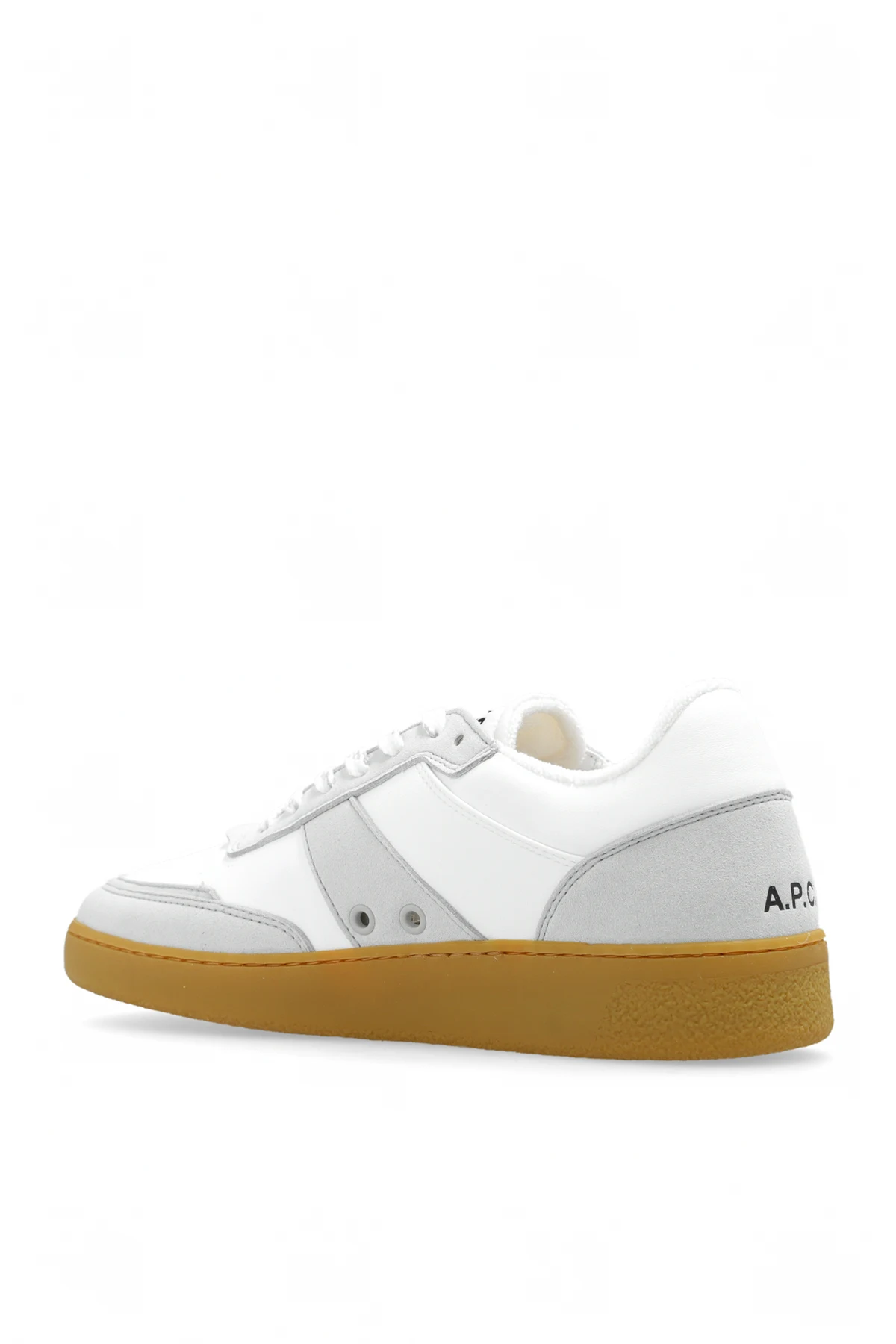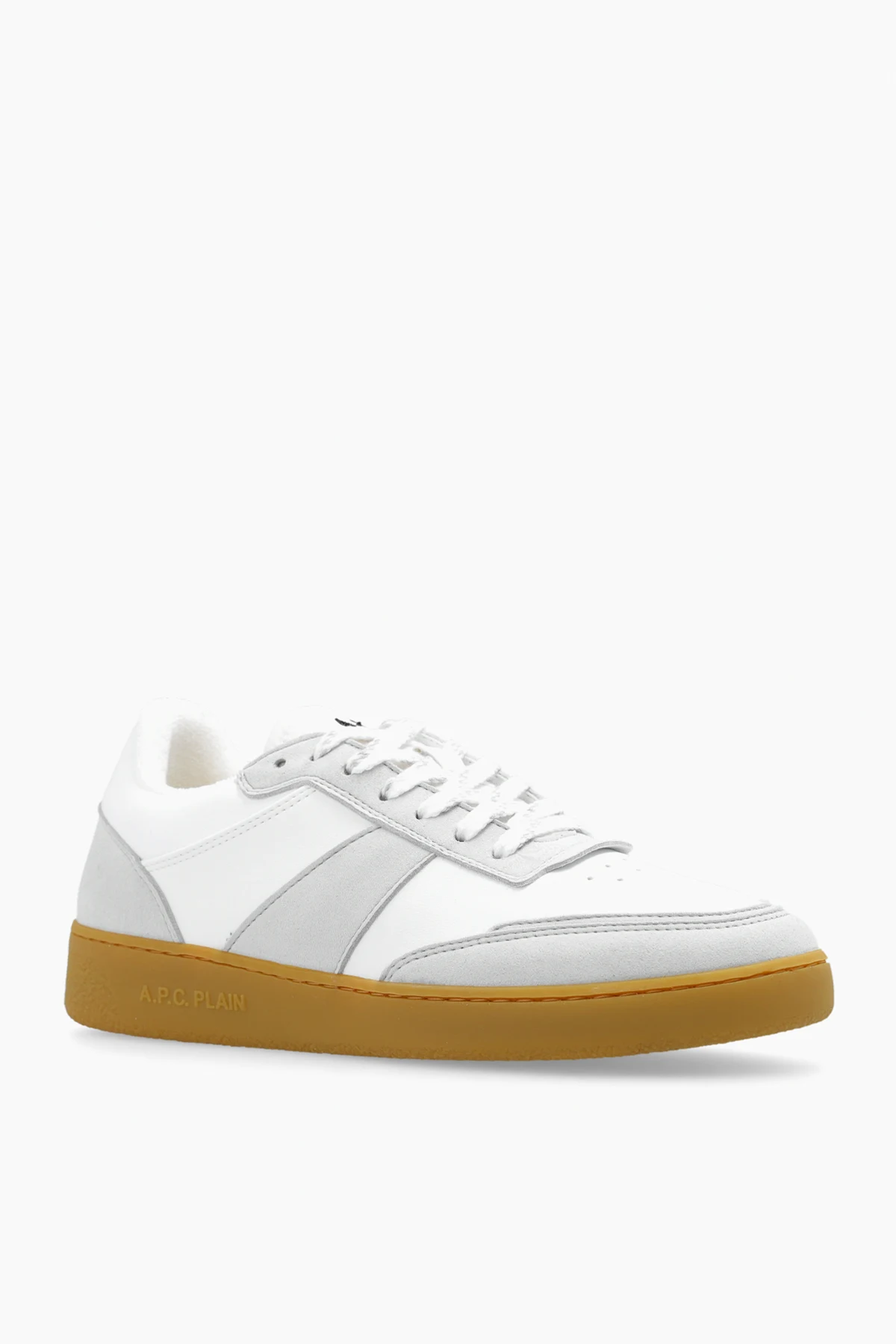 White and light grey ‘Plain’ sneakers from A.P.C. Made of faux leather, this lace-up pair features a black logo, perforations on the front and brown rubber sole.