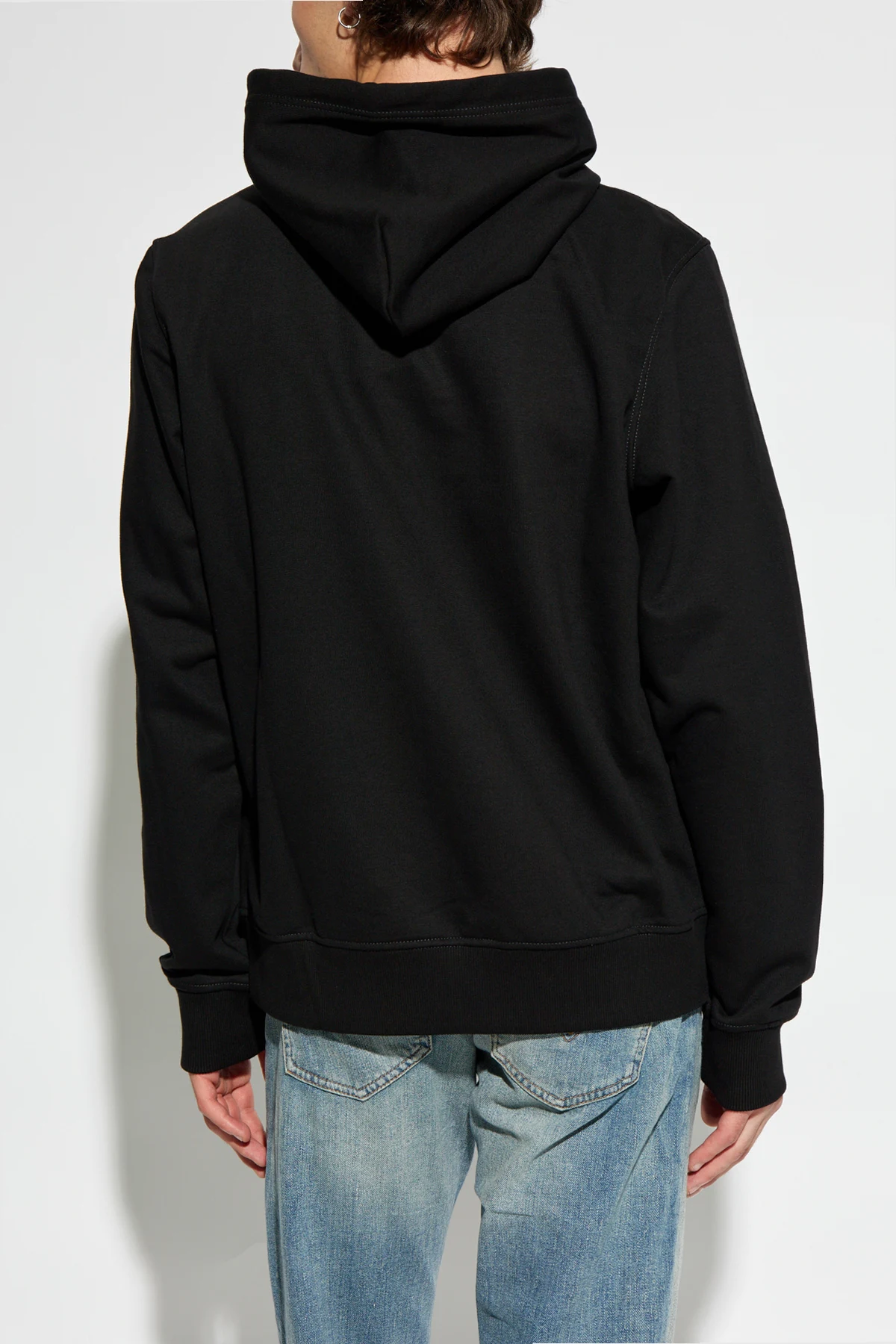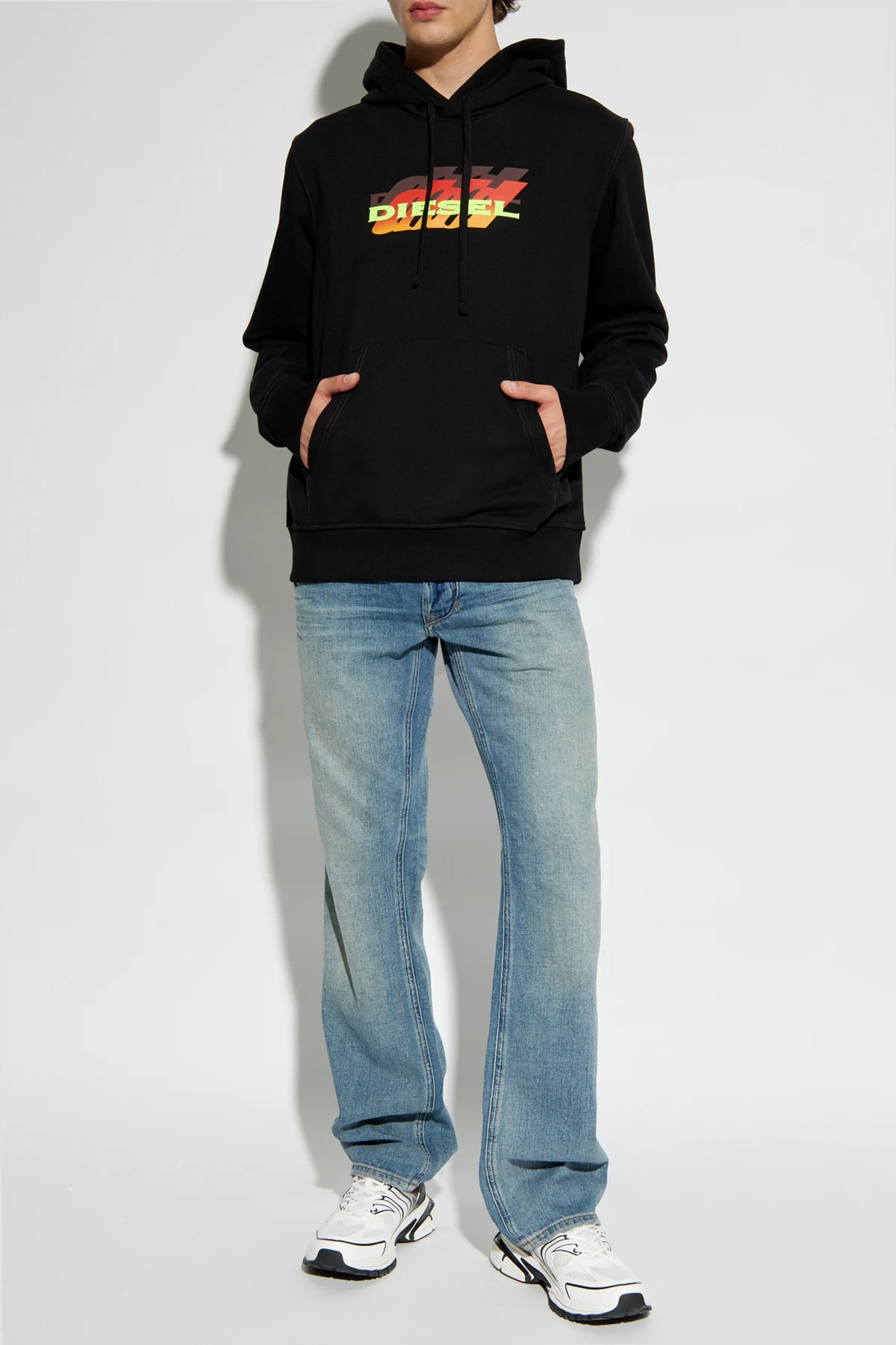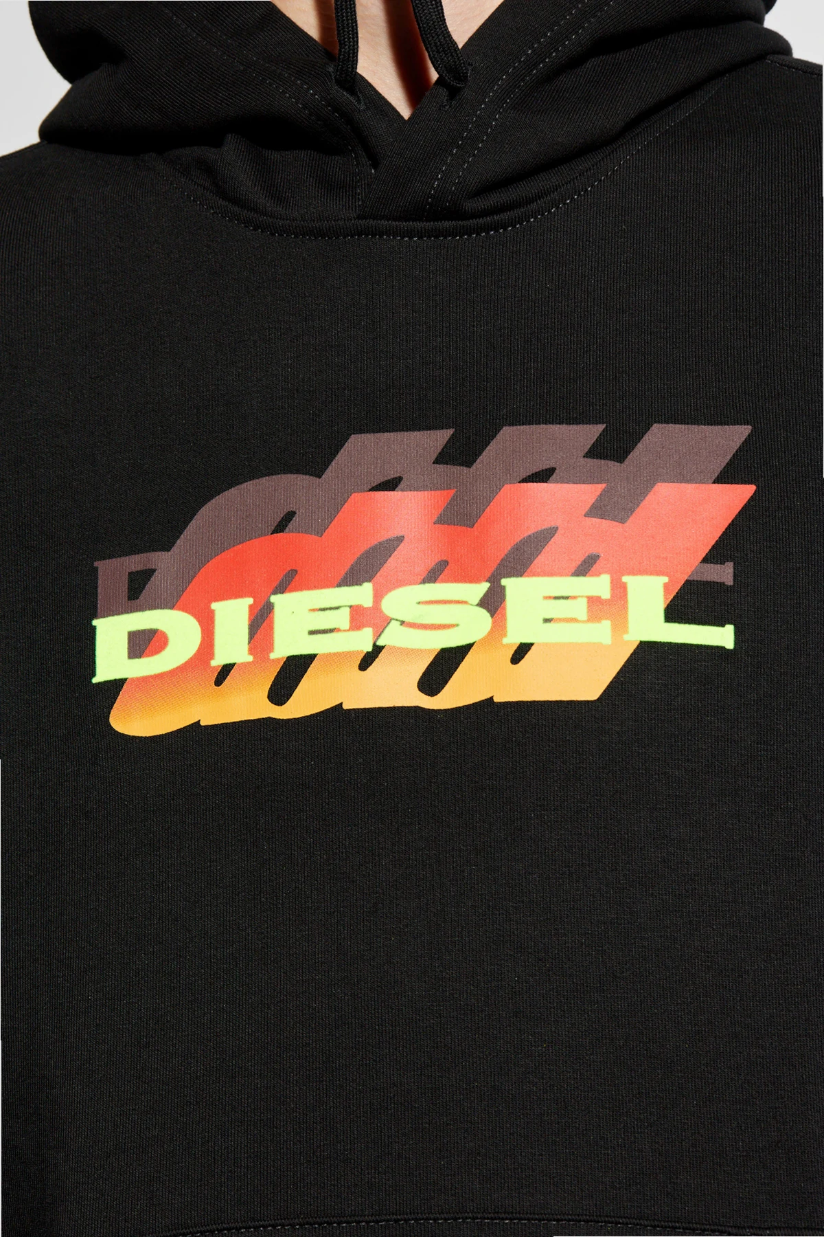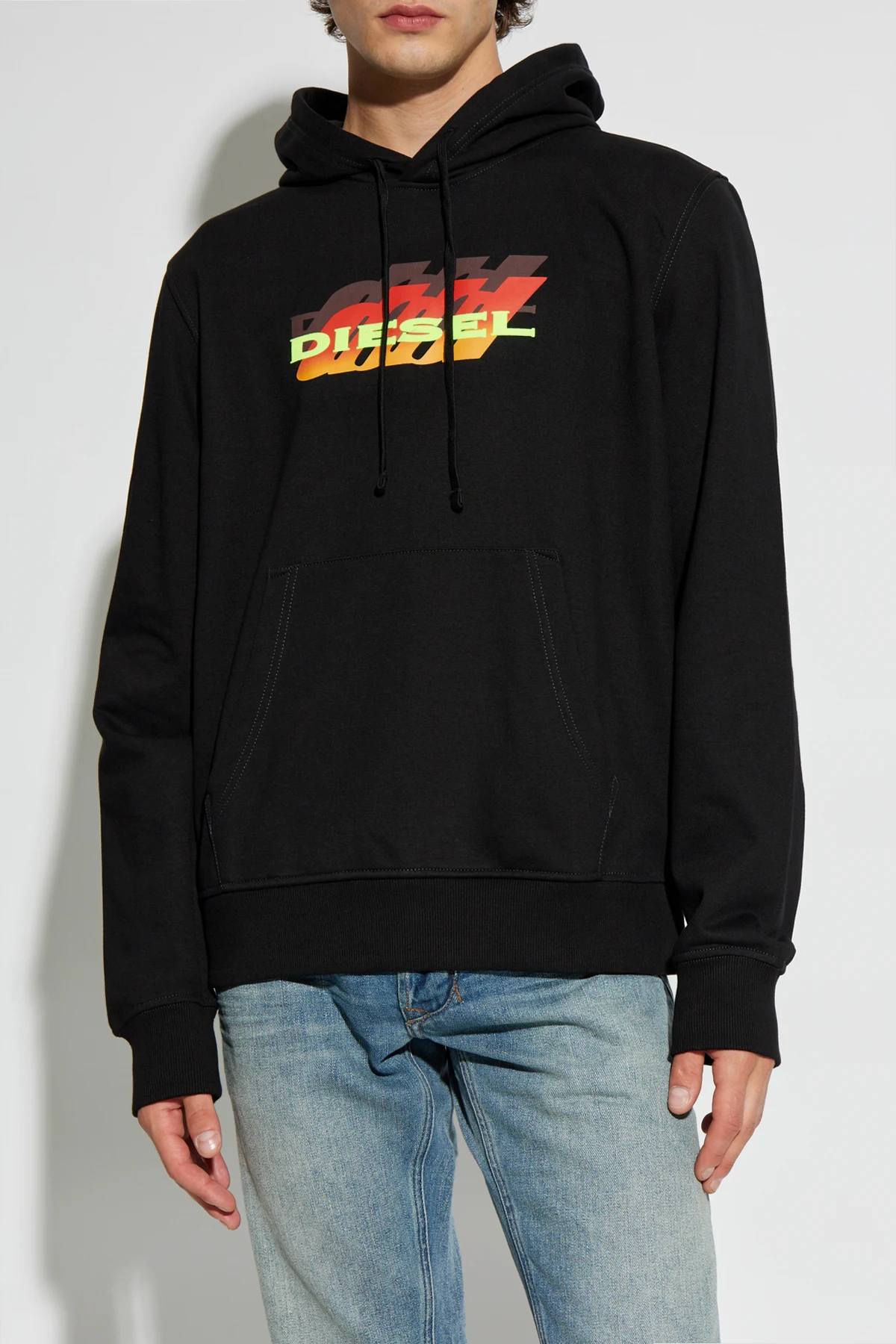 Introducing the epitome of urban elegance, the \'S-GINN-HOOD-K41\' Hoodie by Diesel. This pullover hoodie, rendered in a sophisticated black, is a masterpiece of contemporary casual wear. Crafted from a luxurious blend of cotton and polyester, its fabric promises both comfort and durability, making it an ideal addition to the premium wardrobe. The hoodie features classic elements such as long sleeves, ribbed hem and cuffs, and a kangaroo pocket, ensuring a timeless appeal. However, it is the distinctive, vibrant multi-colored logo print on the front that sets this piece apart. Using a gradient that transitions from yellow through orange to red, with touches of green and blue, the print creates an illusion of three-dimensionality that is both eye-catching and stylish. The hood, equipped with an adjustable drawstring, is free of unnecessary embellishments, highlighting the hoodie\'s sleek design, while meticulously crafted seams underscore its quality. Displayed both on the model and in detailed close-ups, this hoodie maintains its modern, urban aesthetic without any back print, ensuring a clean and polished look. Its smooth and uniform material is a testament to the high-quality fabric befitting a premium brand like Diesel. Why Purchase This Product? Luxurious fabric blend for ultimate comfort and longevity. Eye-catching, multi-colored front logo print adds a unique and stylish touch. Classic design elements combined with modern aesthetics. Exquisite craftsmanship evident in the fine details and clean finishes. Perfect for adding a touch of sophistication to your casual, urban wardrobe.