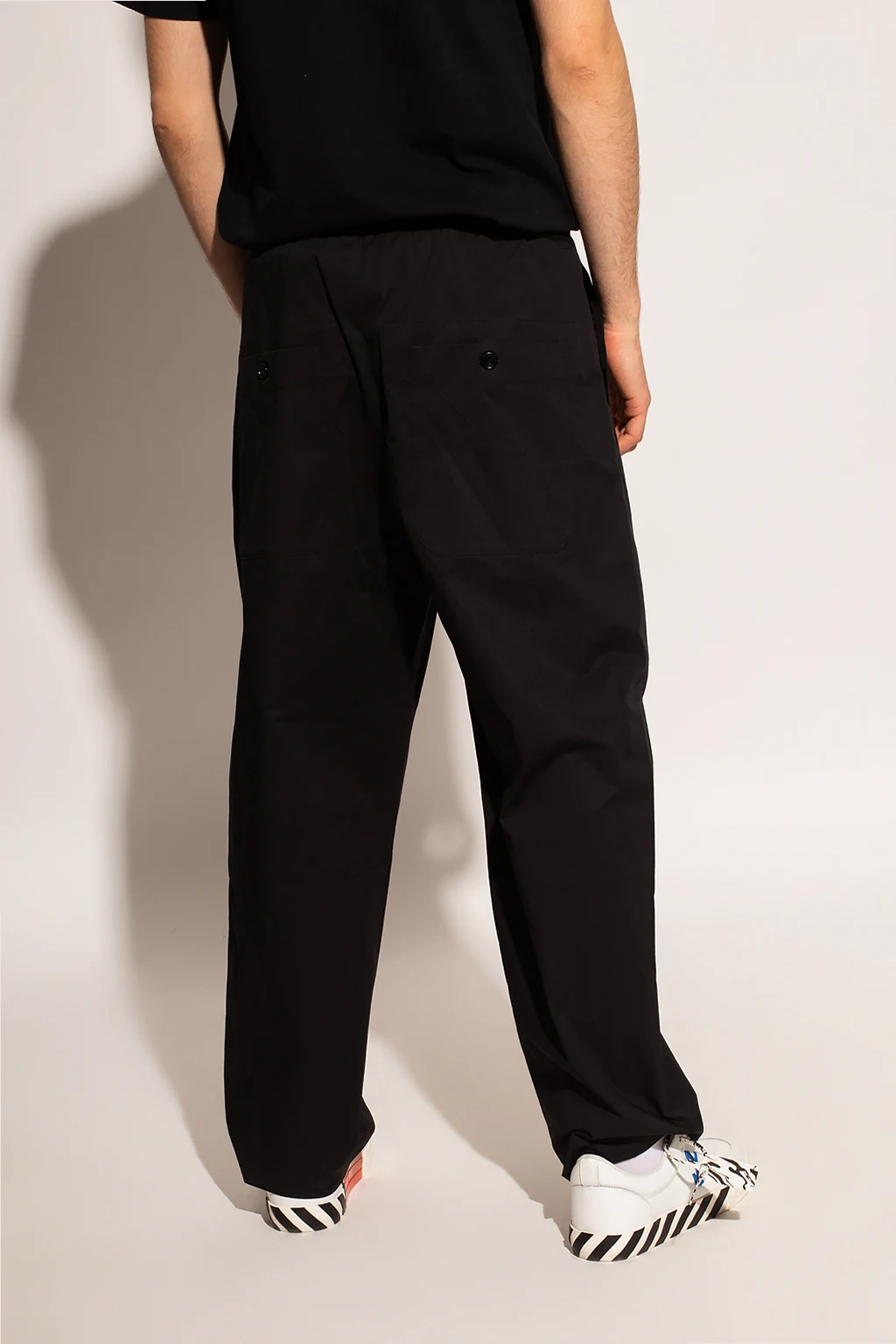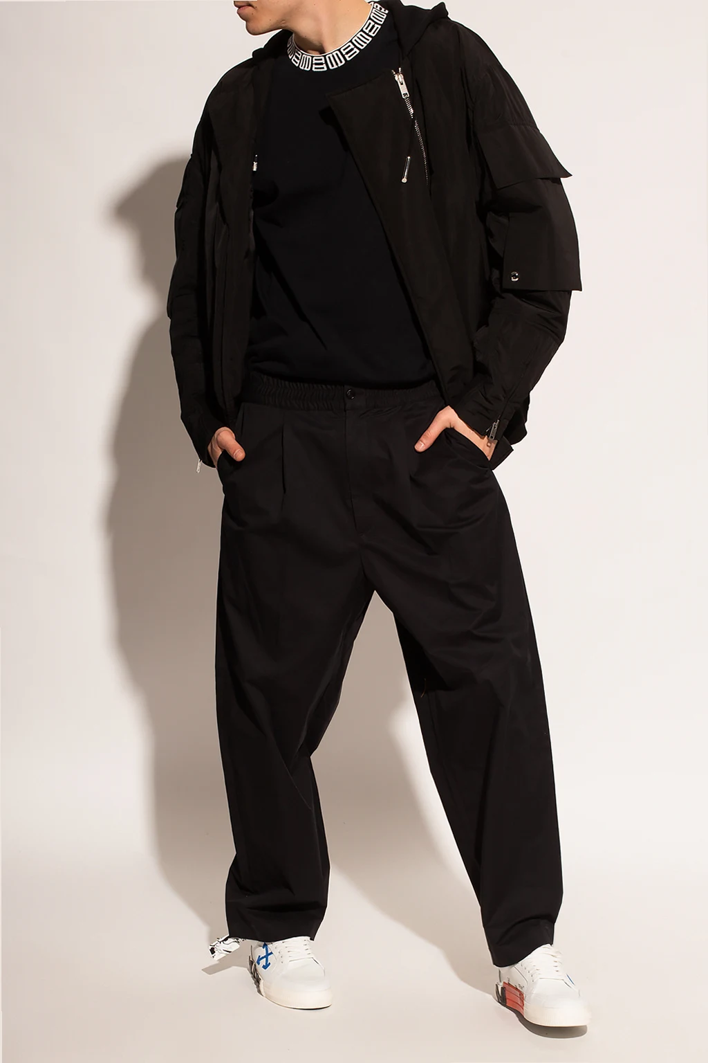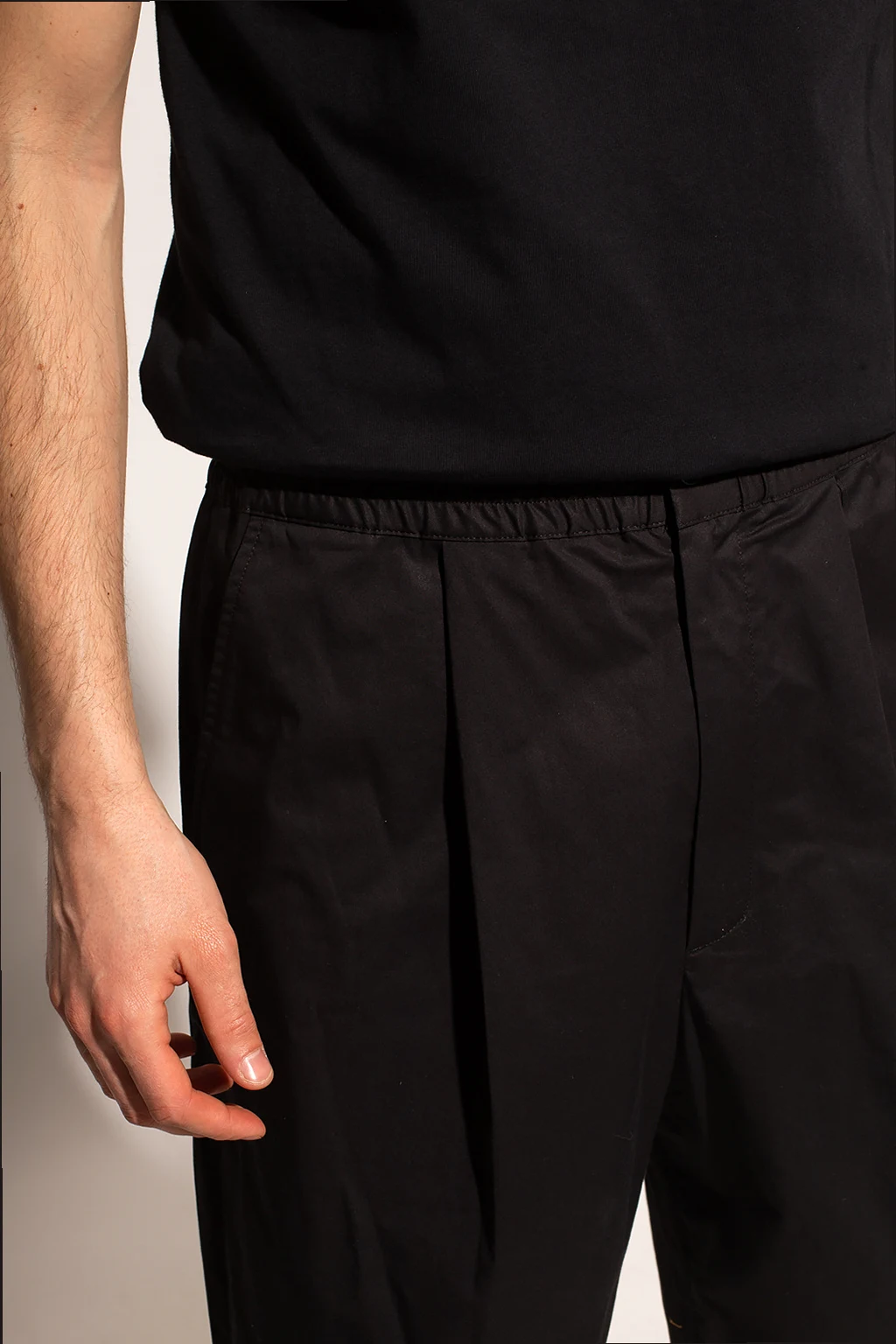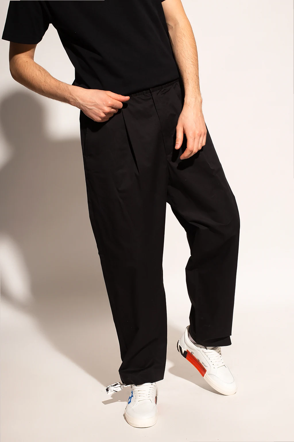 Black pleat-front trousers from Ambush. Made of cotton with gathers, this pair falls to tapered legs and features a zip fly with a button, two side seam pockets and two back button pockets.