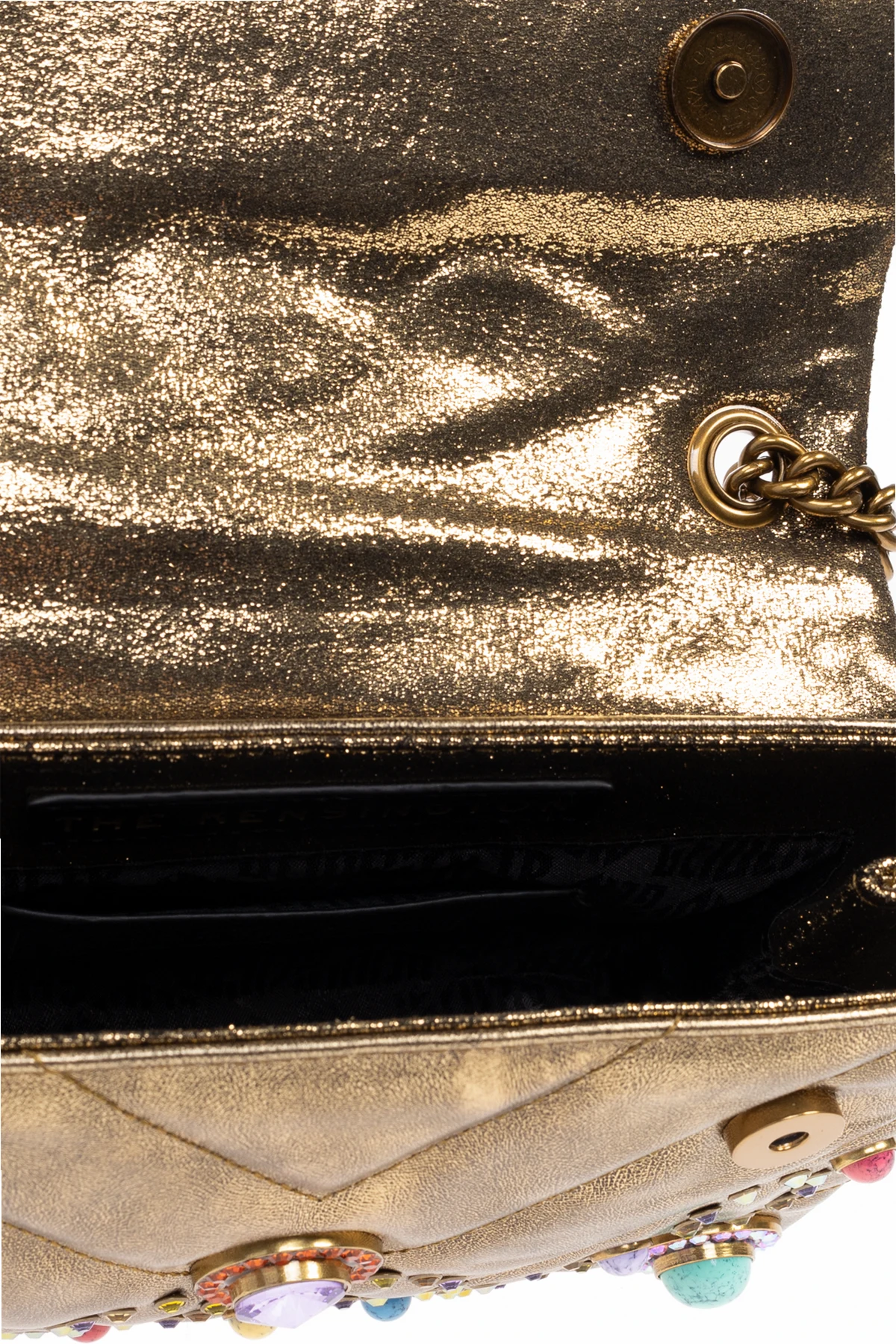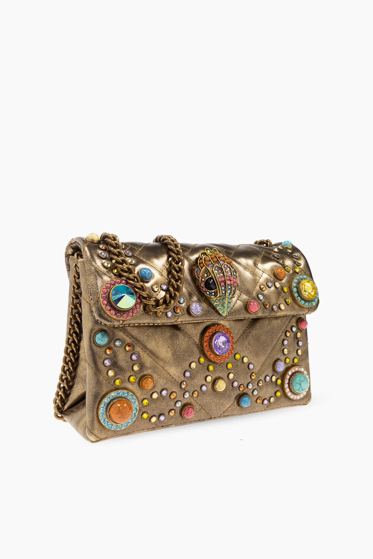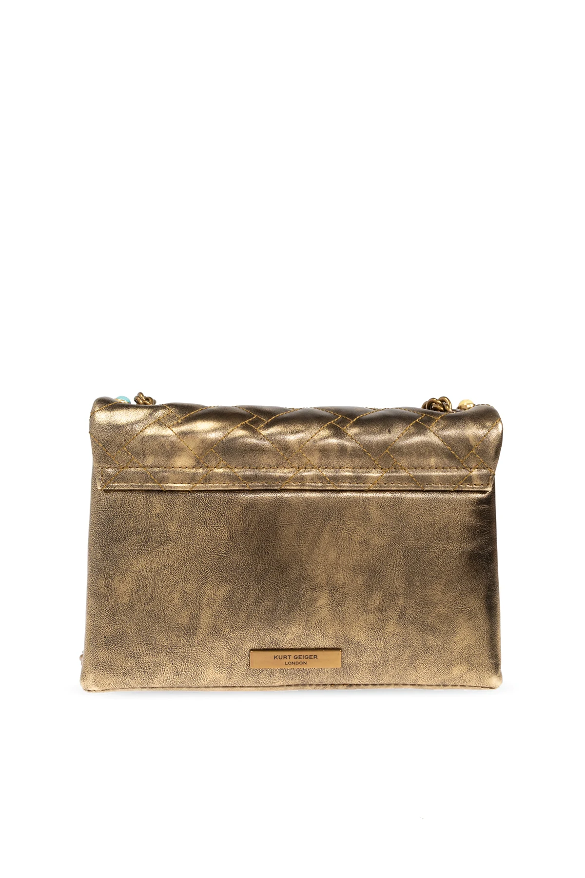 Introducing the Kensington Medium Shoulder Bag, a paragon of opulence from the esteemed designer Kurt Geiger. This exquisite piece is a celebration of sophistication, boasting a dark gold hue that emanates elegance and luxury. Designed with a classic rectangular silhouette, this bag features a magnetic flap closure adorned with vibrant crystals and intricate appliqués, creating a striking pattern. The centerpiece of this masterpiece is a jewel-like embellishment, further accentuating its allure. Crafted from sumptuous leather with a metallic finish, the bag is complemented by a gold-tone chain strap for shoulder wear. The interior, equally refined, includes a compartment and a convenient card slot, secured by a magnetic fastening. To complete its exclusivity, a designer logo plaque embellishes the back, heralding its prestigious origin. A quintessential accessory for evening ensembles, this bag merges elegance with a bold style. Why Choose This Product? Exquisite Craftsmanship - Made from premium leather with a luxurious finish. Distinctive Design - Features ornate embellishments and a central jewel-like accent. Practical Elegance - Includes a spacious interior and card slot for functionality. Prestigious Heritage - Created by the renowned designer Kurt Geiger.