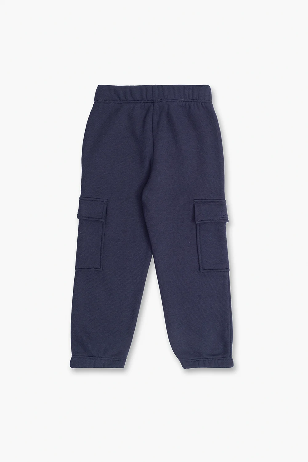 Navy cargo sweatpants from Lacoste Kids. Made of an organic cotton blend, this pair features an elastic waistband, light green logo patch, two slip pockets, two flap pockets with velcro and ribbed cuffs.