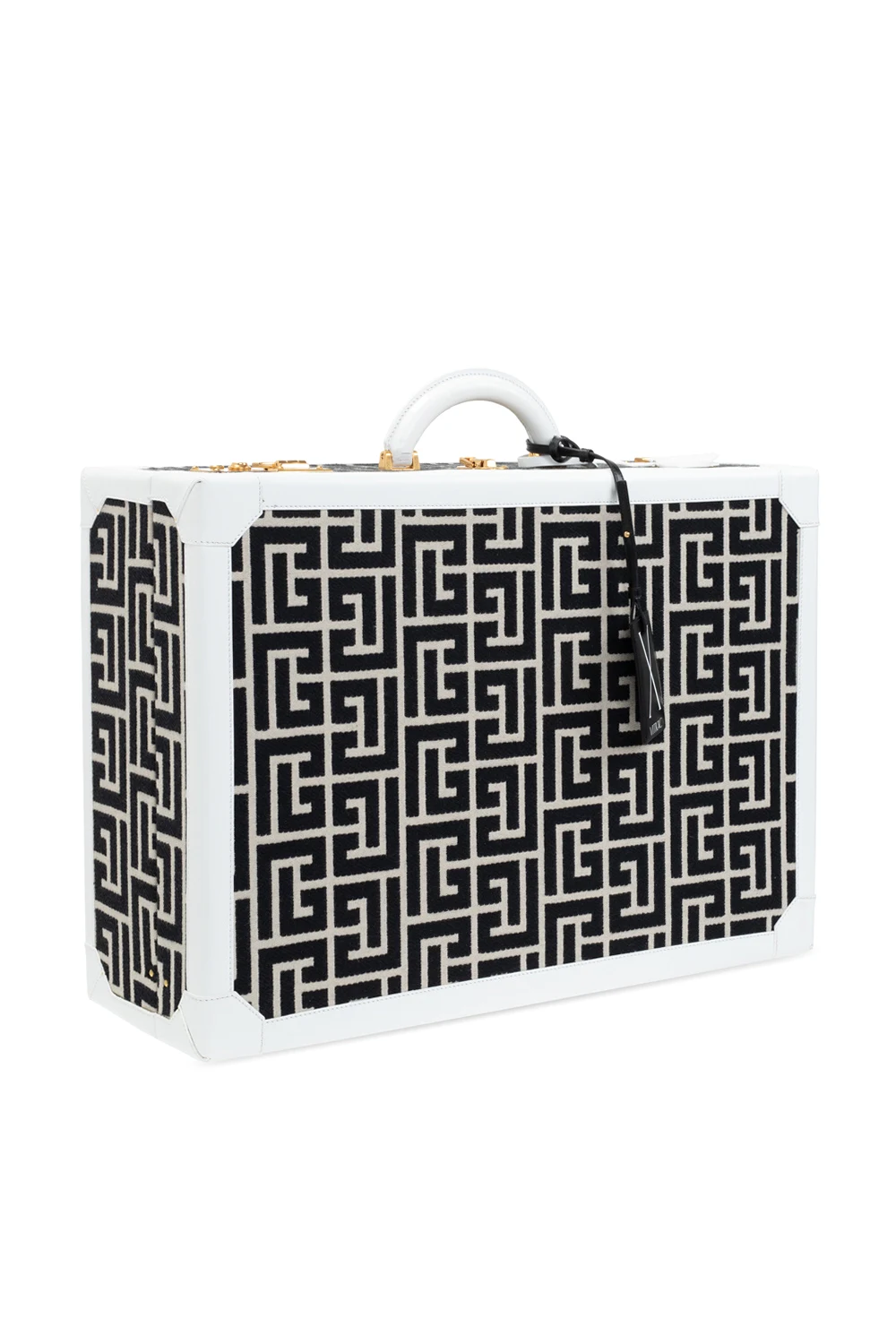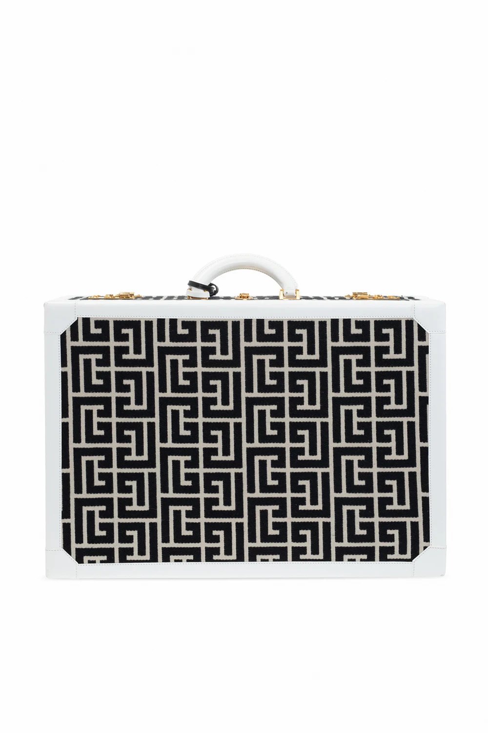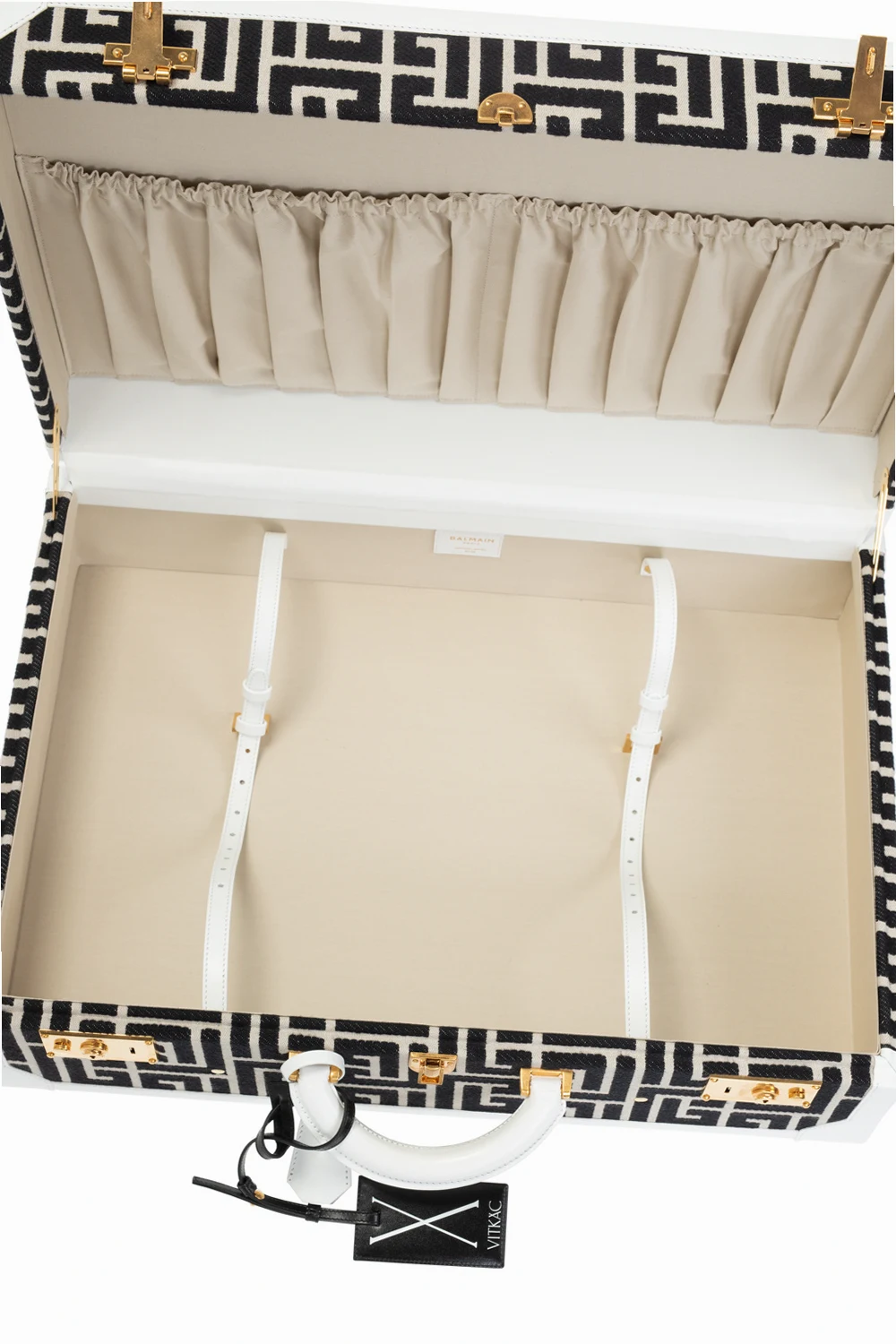 White, cream and black suitcase from Balmain, ‘Exclusive for Vitkac’ edition. Crafted from logo-embroidered canvas with leather trims, this model fastens with snaps and a key. It is complete with gold-tone metal hardware, two internal compartments and two slip pockets. Item designed to celebrate the 10th anniversary of VITKAC.