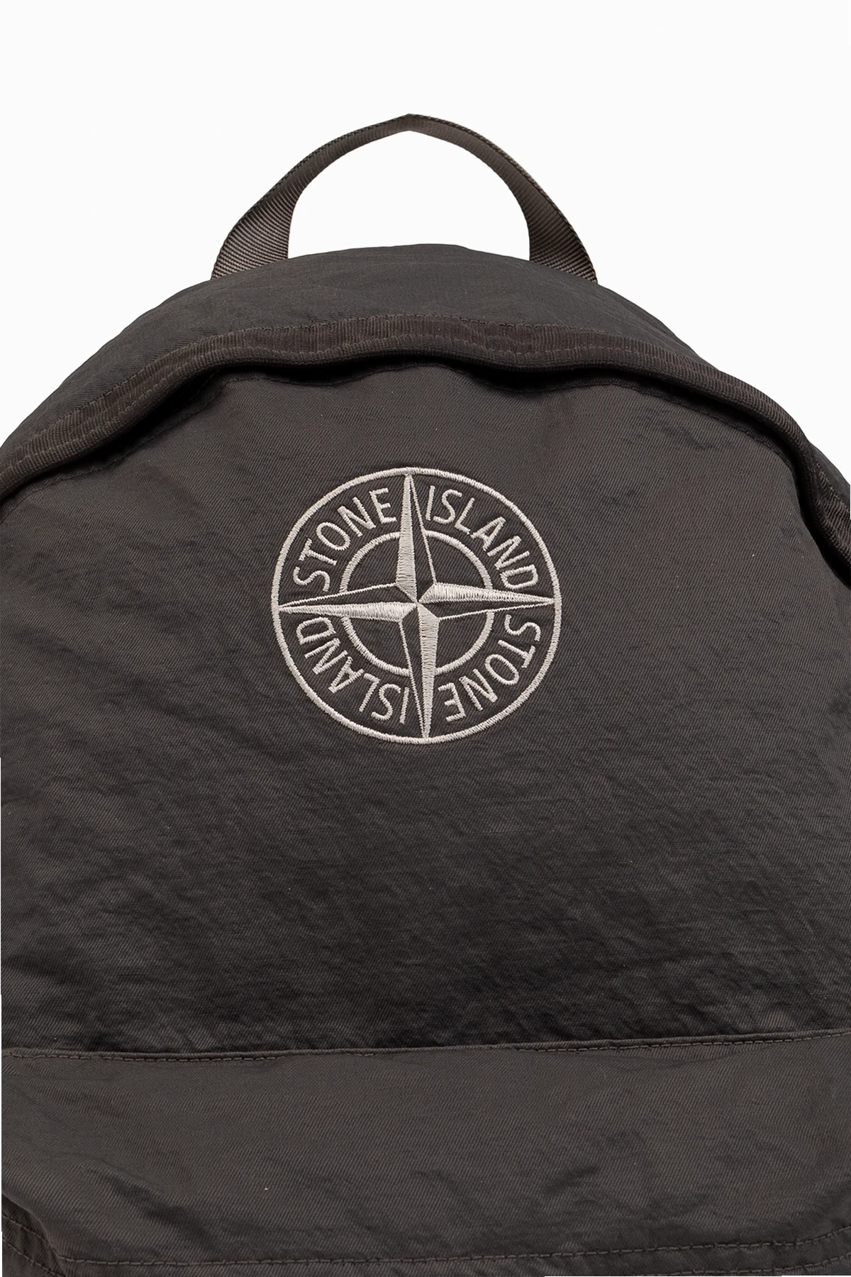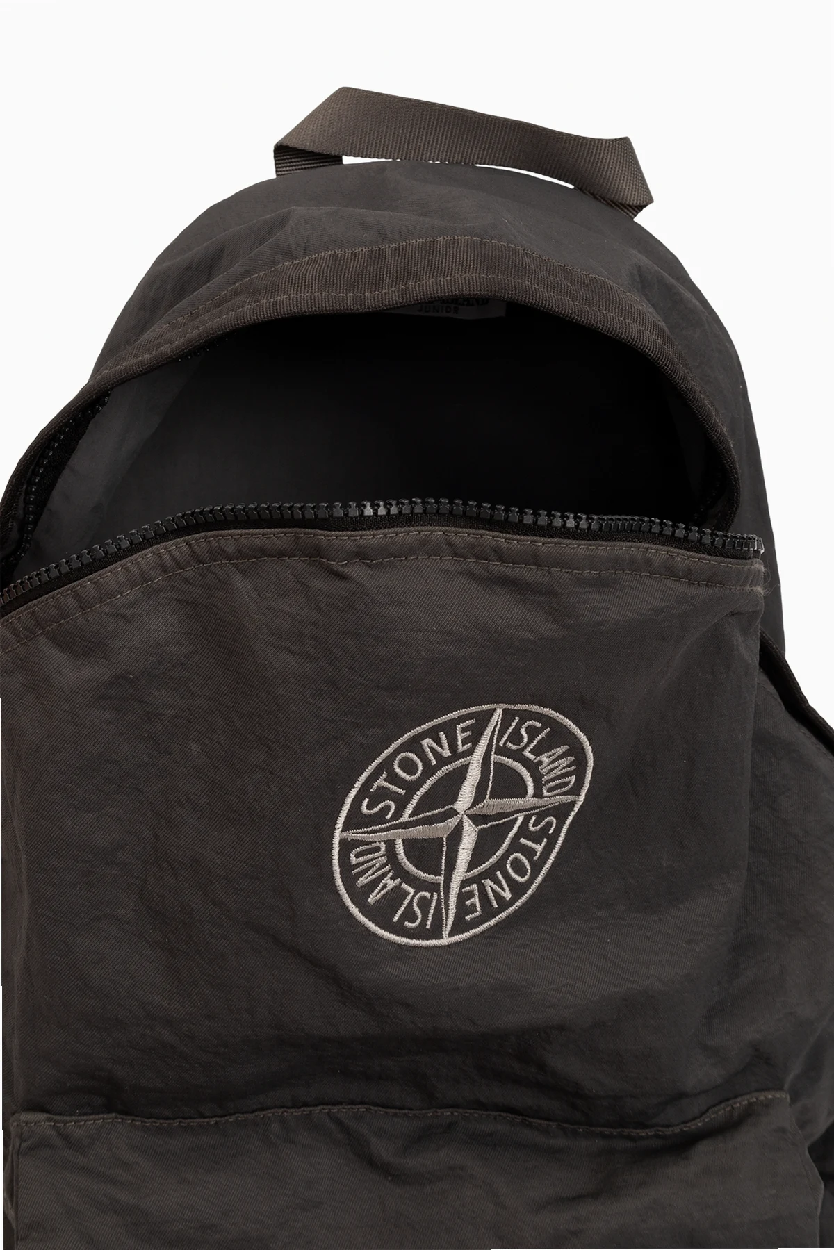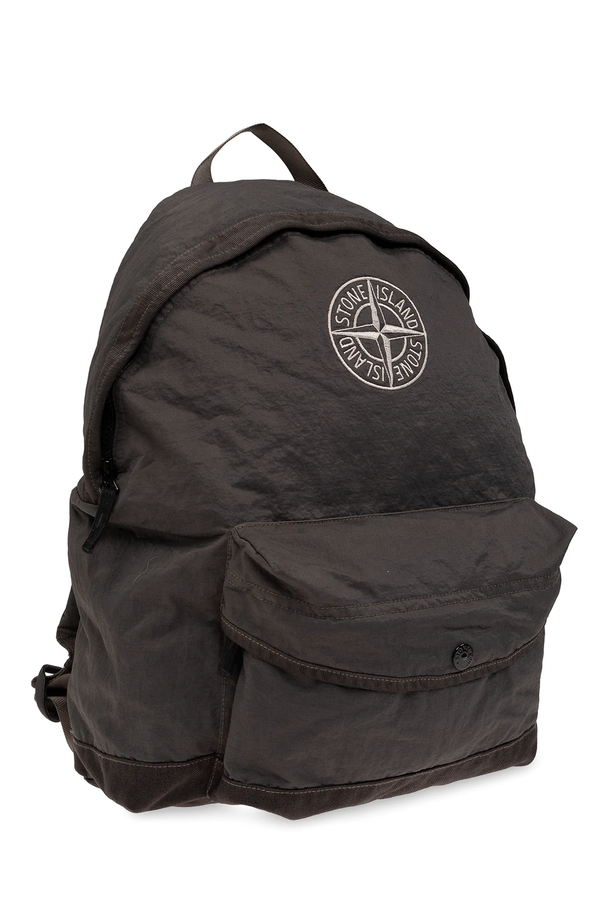 Dark grey backpack from Stone Island. Fastened with a zip, this model features a white logo embroidery, a half-round handle, zipped front pocket, adjustable shoulder straps and one internal compartment.