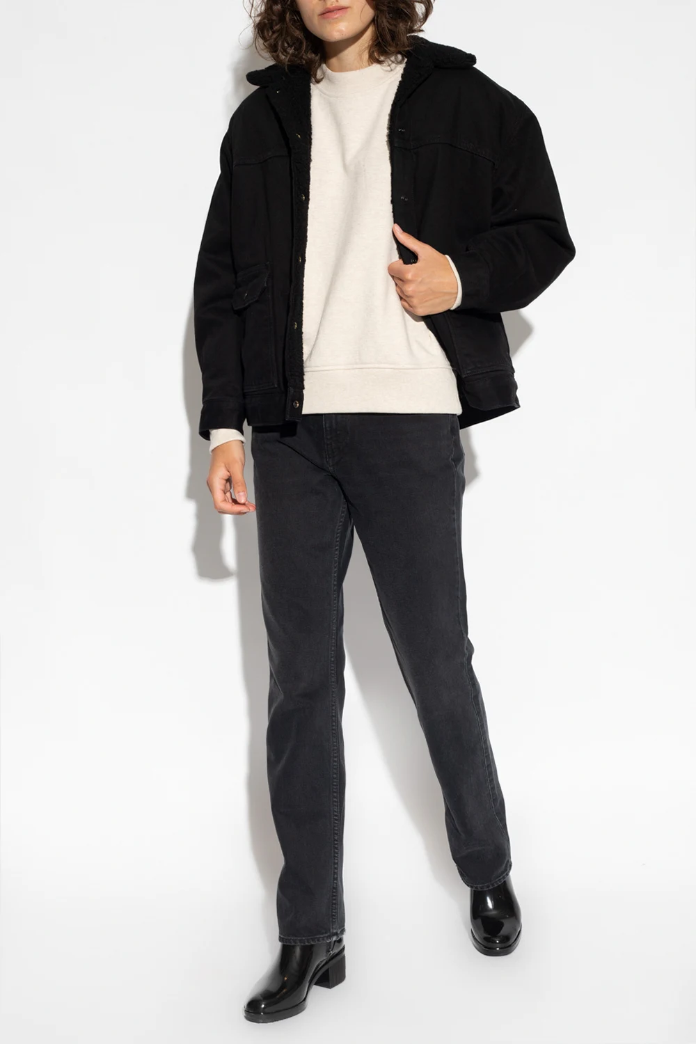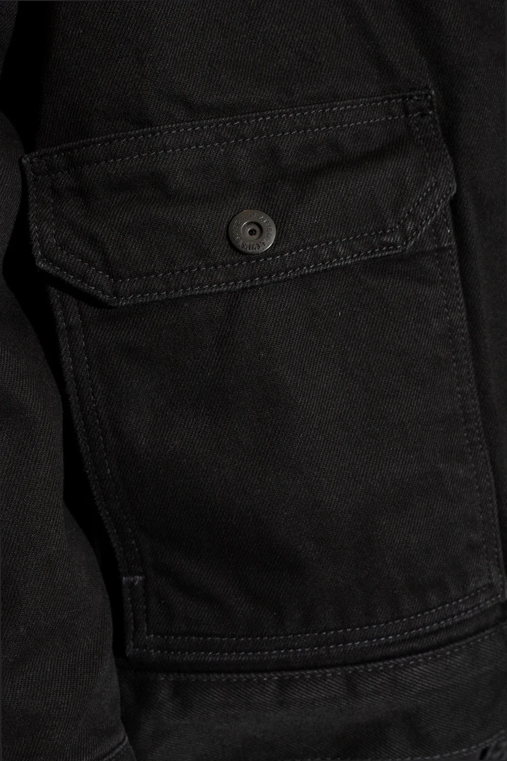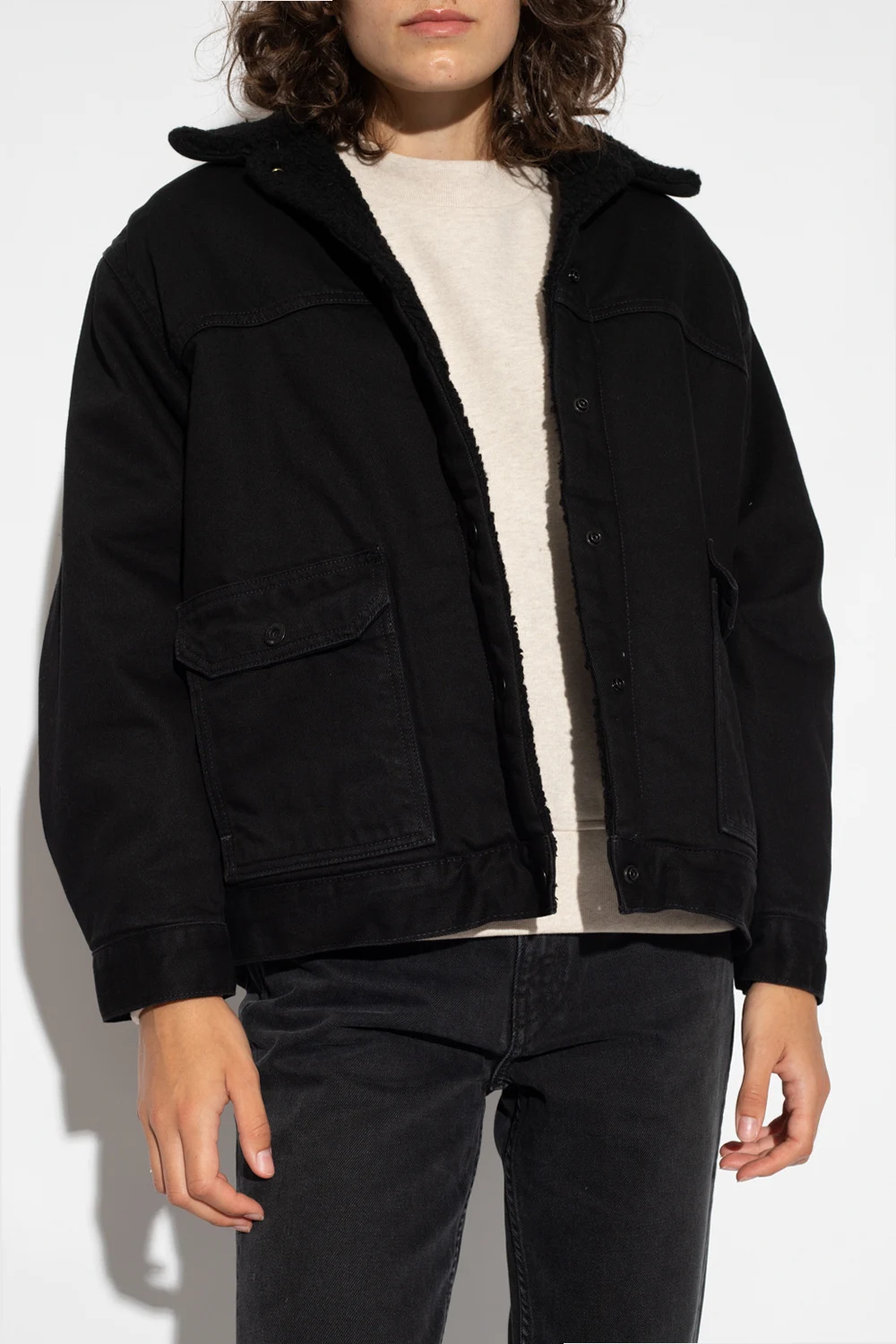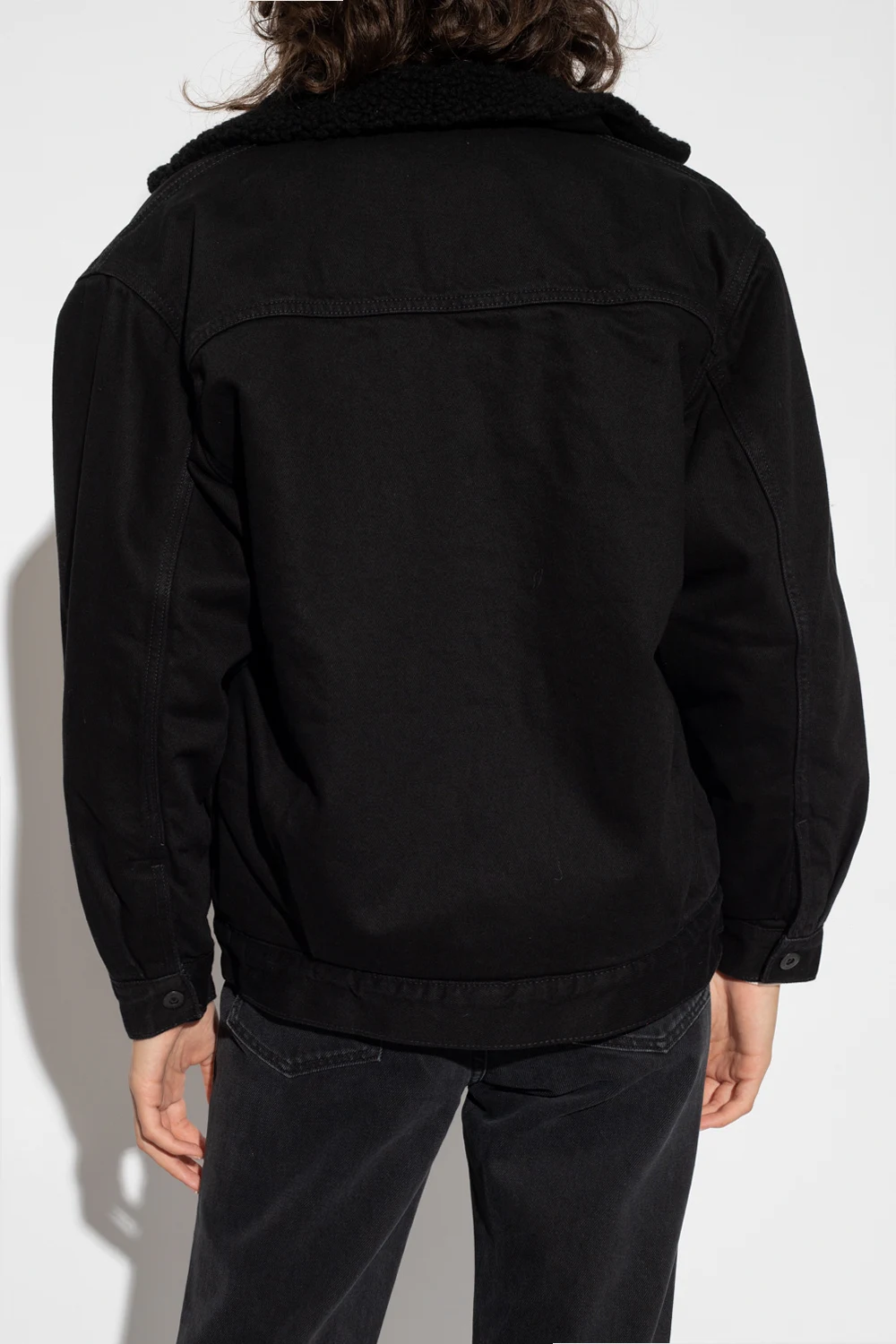 Black ‘Trucker’ insulated denim jacket from Levi’s, the ‘Made & Crafted® collection. Made of organic cotton, this garment features snap fastenings, faux fur collar, two slip pockets, two snap-fastened flap pockets and long sleeves with banded cuffs.