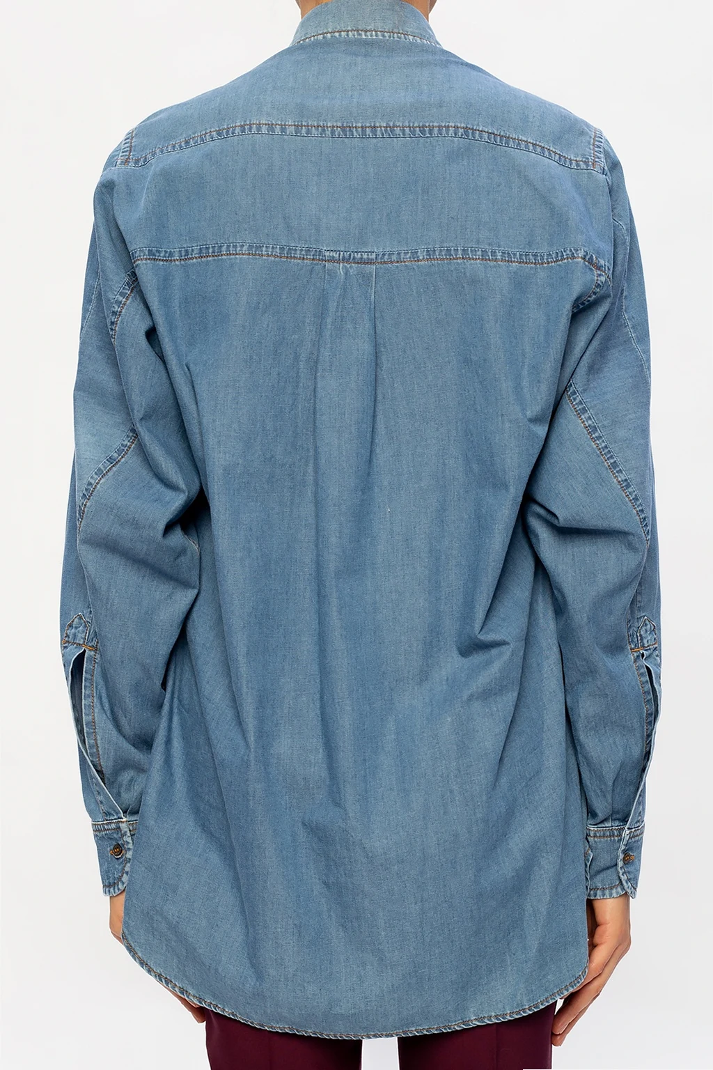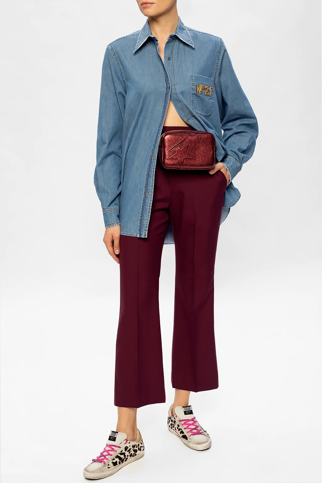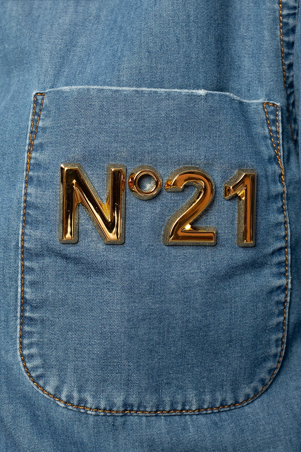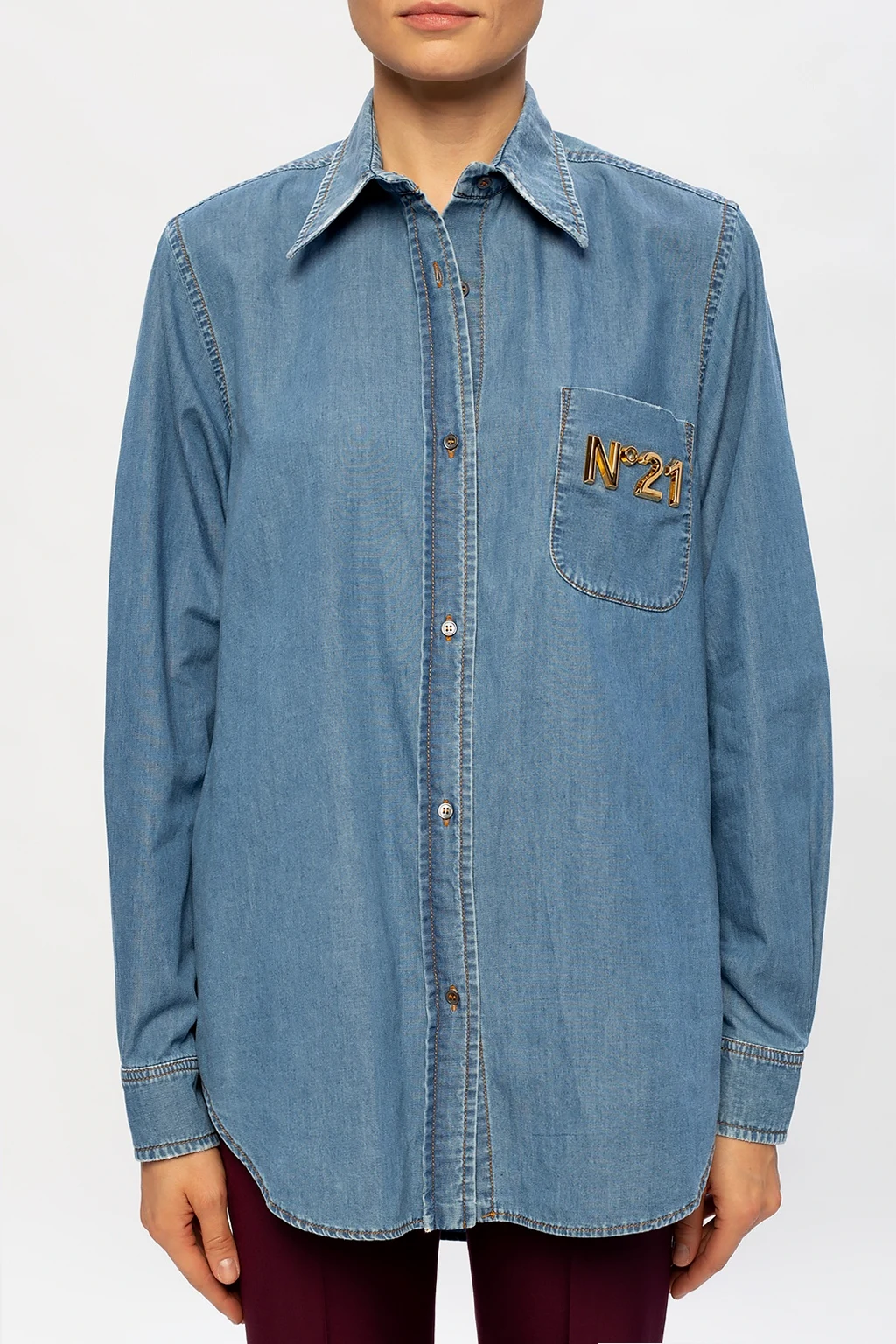 Blue shirt from N21. Enhanced with a gold-tone metal logo hardware, this cotton-crafted style fastens via buttons and is complete with contrasting orange stitching details.