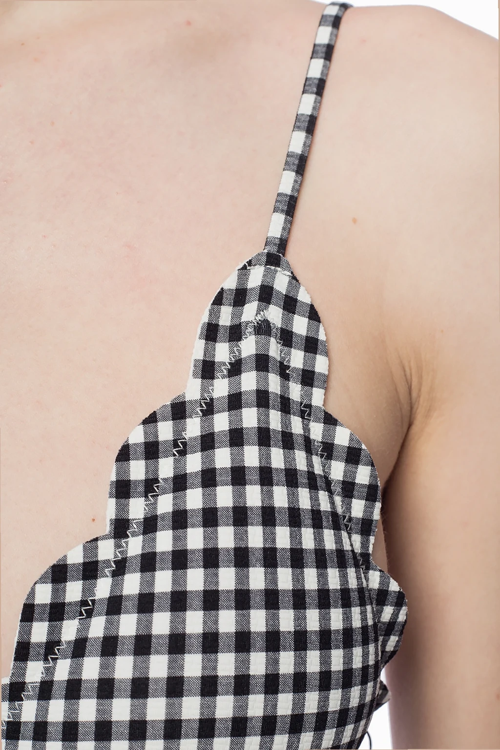 White one-piece swimsuit on straps from Marysia. Tie fastening at the back. Decorated with cut-out details and an embroidered check pattern in black. V-neck. Includes a case.