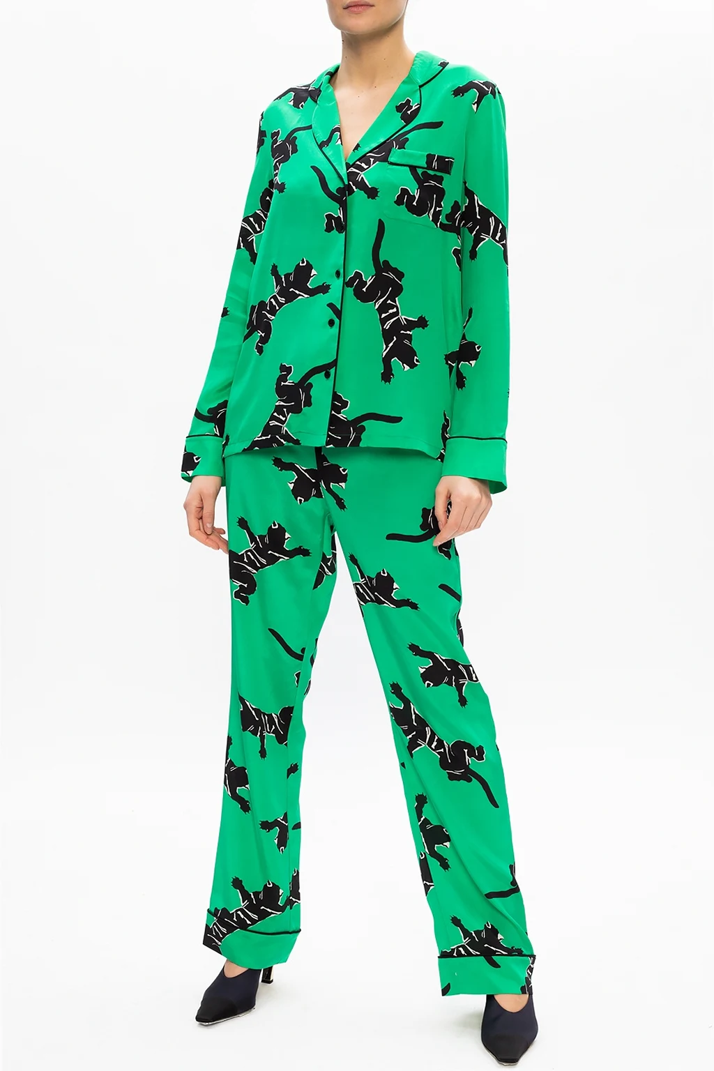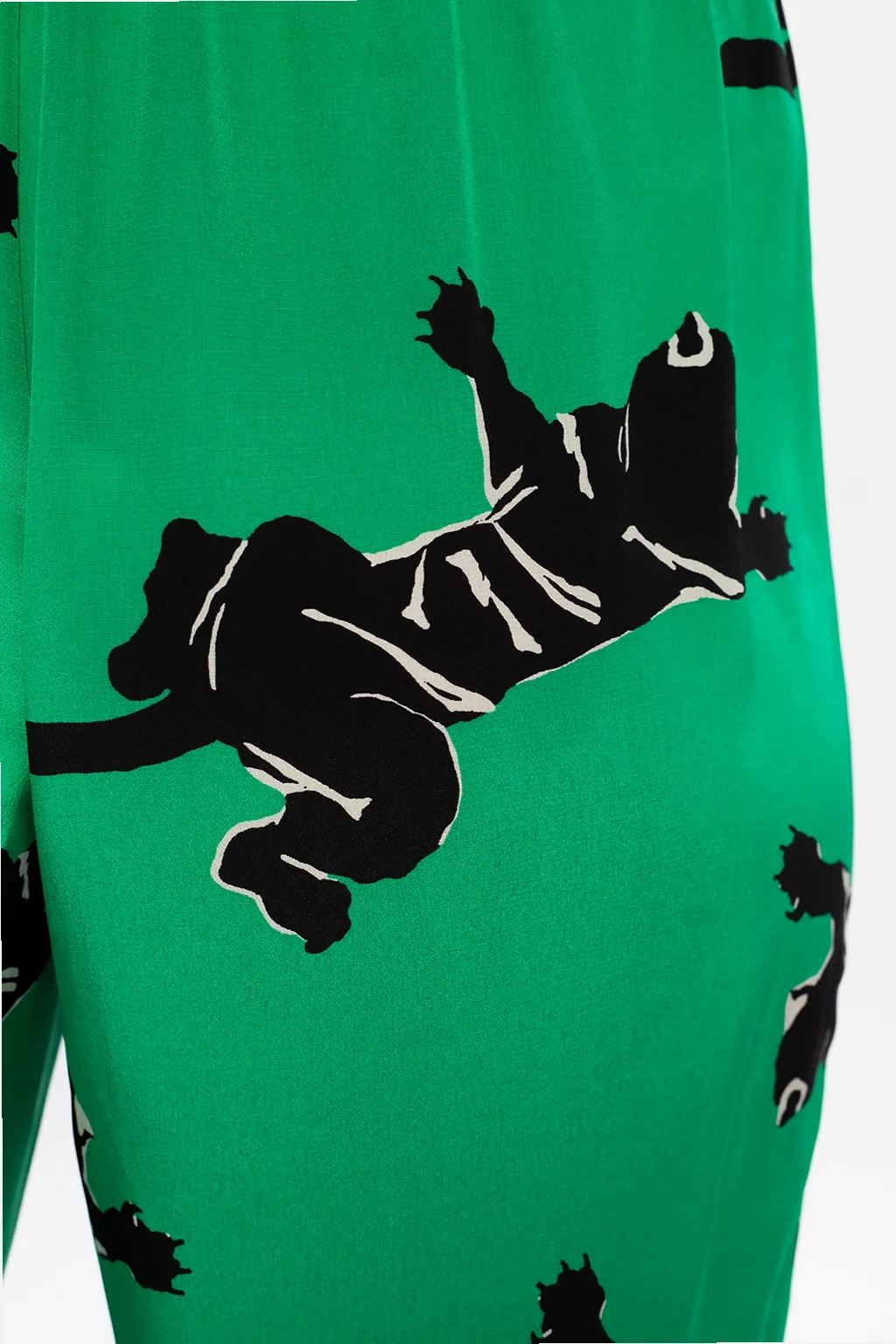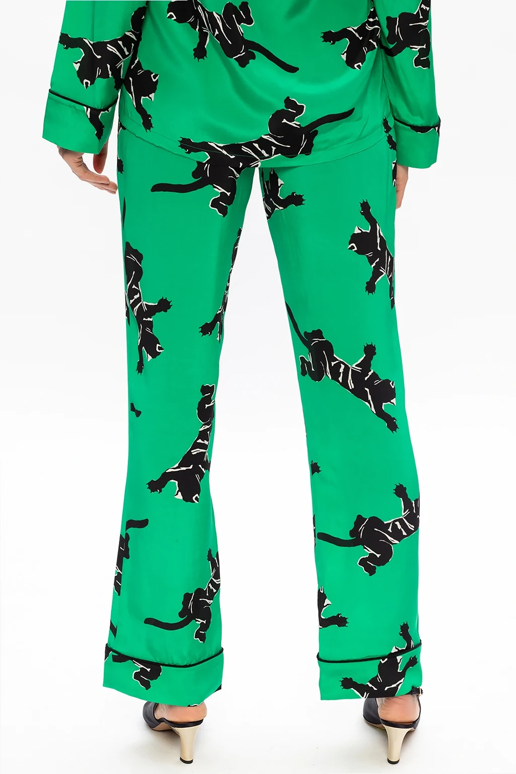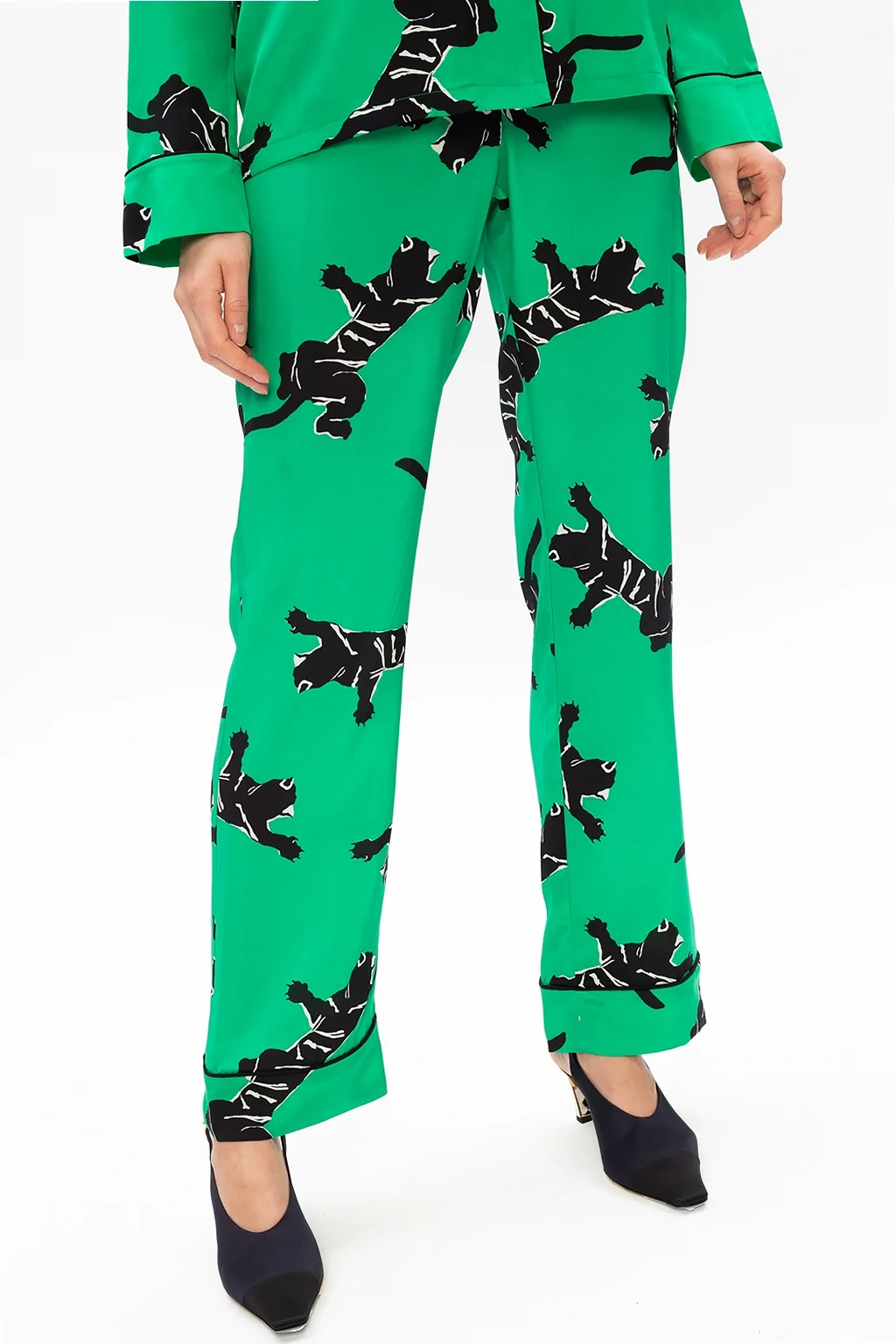 Green trousers from Diane von Furstenberg. Made of silk, this straight leg design features a black and white animal motif and an elastic waistband with drawstring fastening.