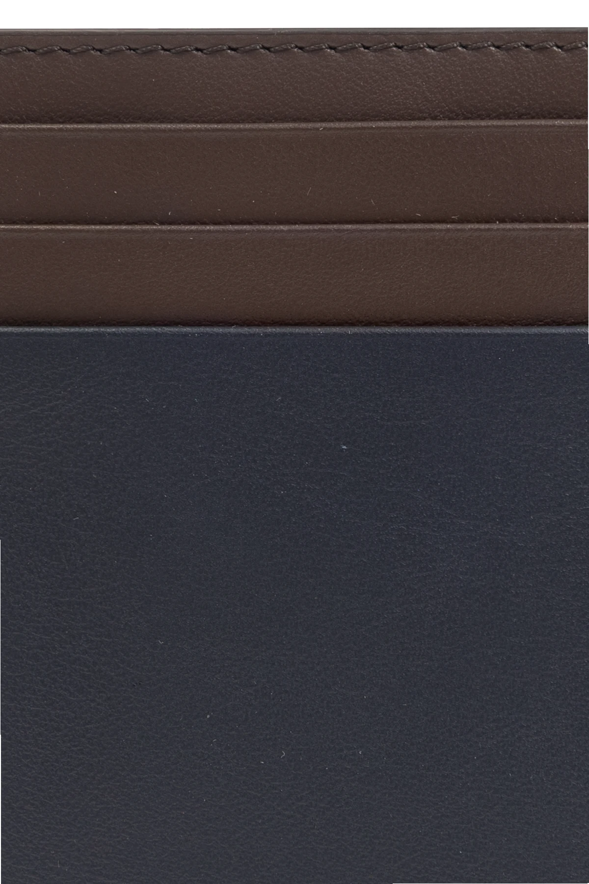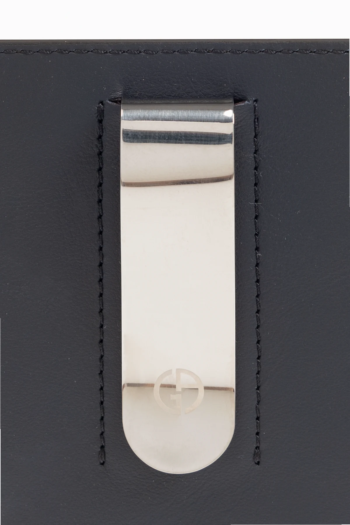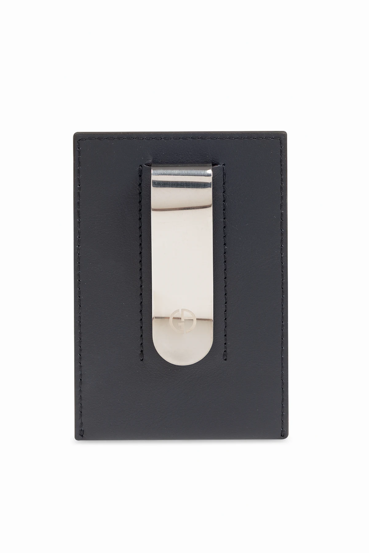 Navy blue and brown card case from Giorgio Armani. Made of smooth leather, this item showcases a printed logo on the front, three card slots and a bill clip on the back.
