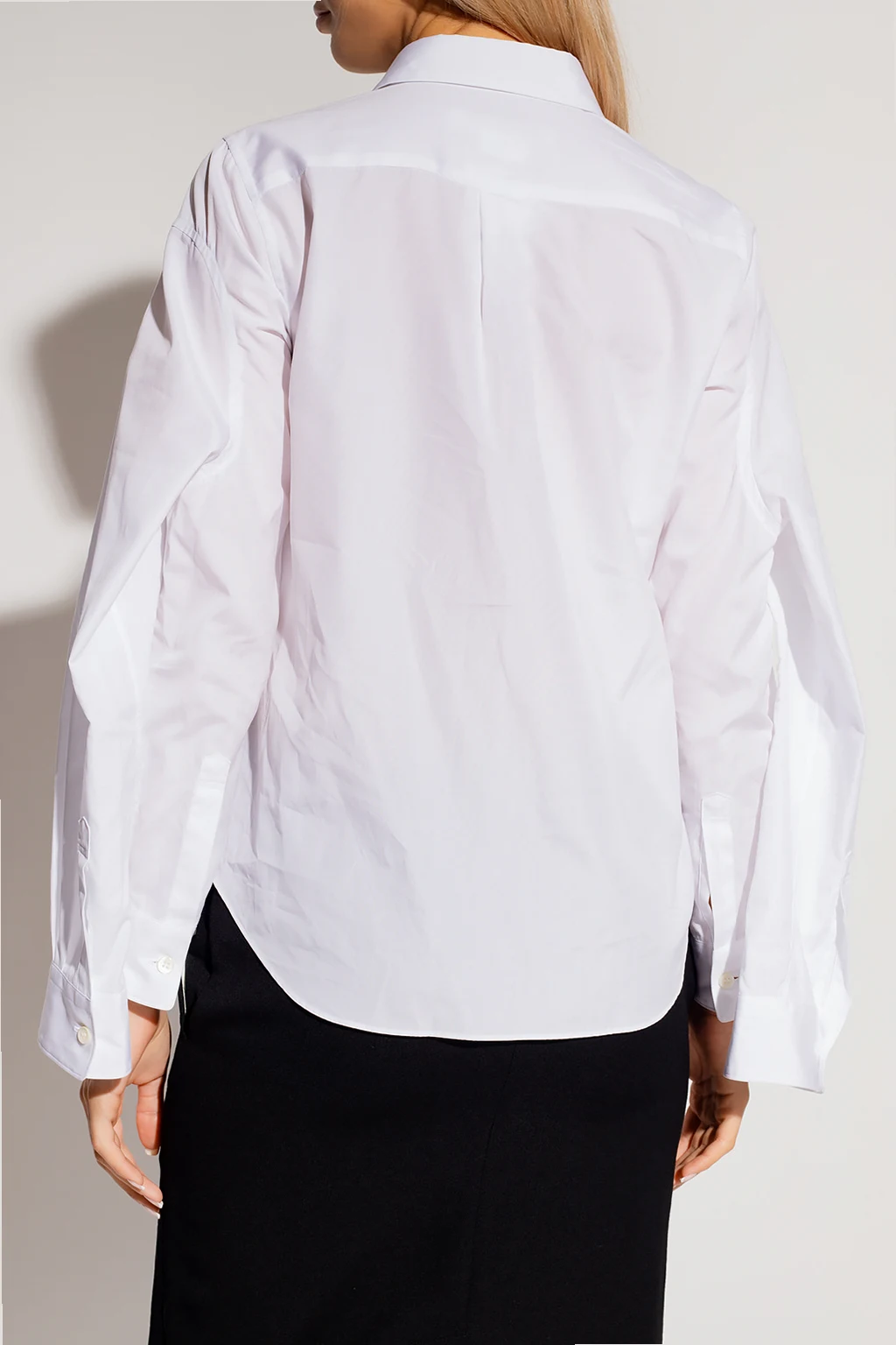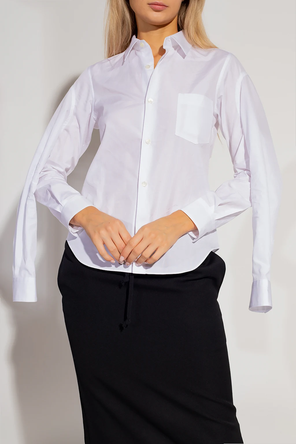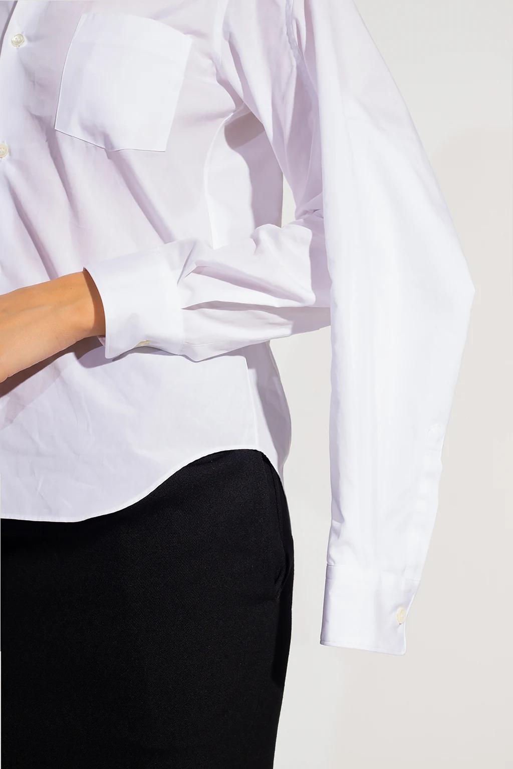 White shirt from Comme des Garcons. Crafted from cotton, this style features button fastenings, a slip chest pocket and long sleeves with button cuffs.