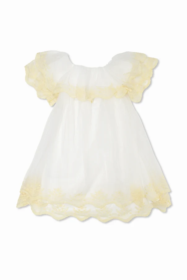 Imbued with ethereal charm, this exquisite white tulle dress by Chloé Kids is a celebration of refined innocence and youthful grace. Crafted from softly translucent tulle and lined with a gentle fabric, it ensures both lightness and impeccable comfort. The thoughtfully tailored trapeze silhouette flows effortlessly, enhanced by voluminous ruffled sleeves that seamlessly blend into a sophisticated, flared body—granting every girl freedom of movement and wearability.