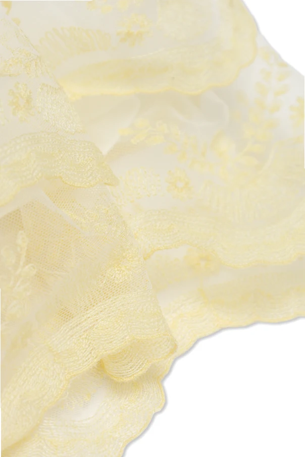 The dress is further distinguished by delicate, pale yellow embroidery—floral and ornamental motifs—that encircle the neckline, cascade along the ruffled sleeves, and accentuate the hem. Each stitch speaks to artful precision, accentuating the dress’s unique and exclusive allure.