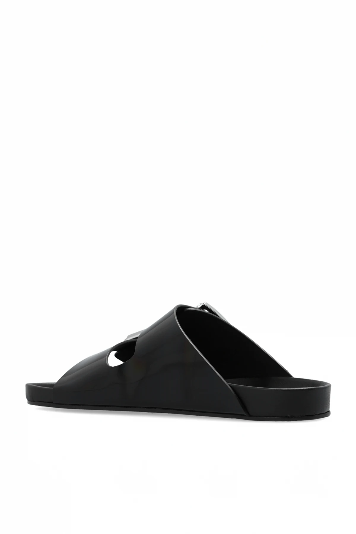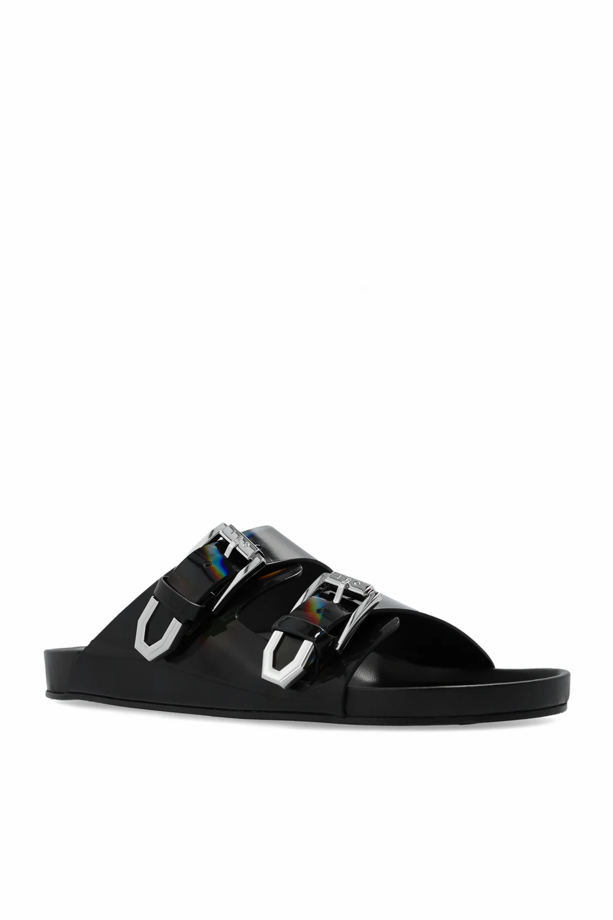 Black ‘Billie’ slides from Iro. This pair features a holographic finish and adjustable straps with silver-tone logo-engraved buckles.