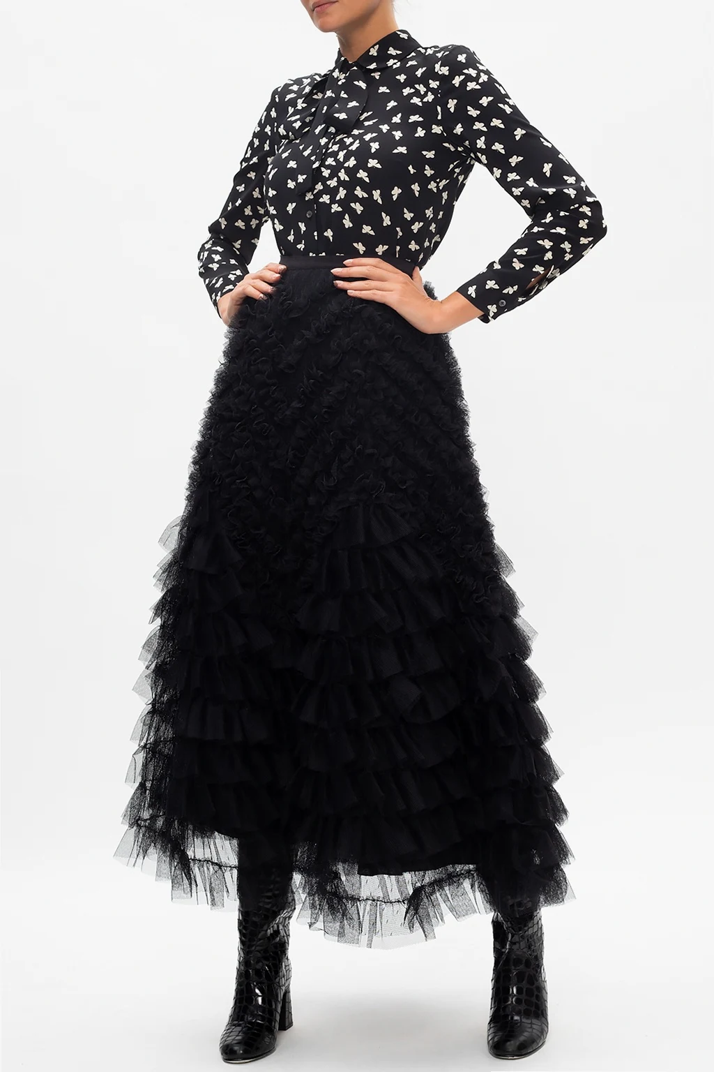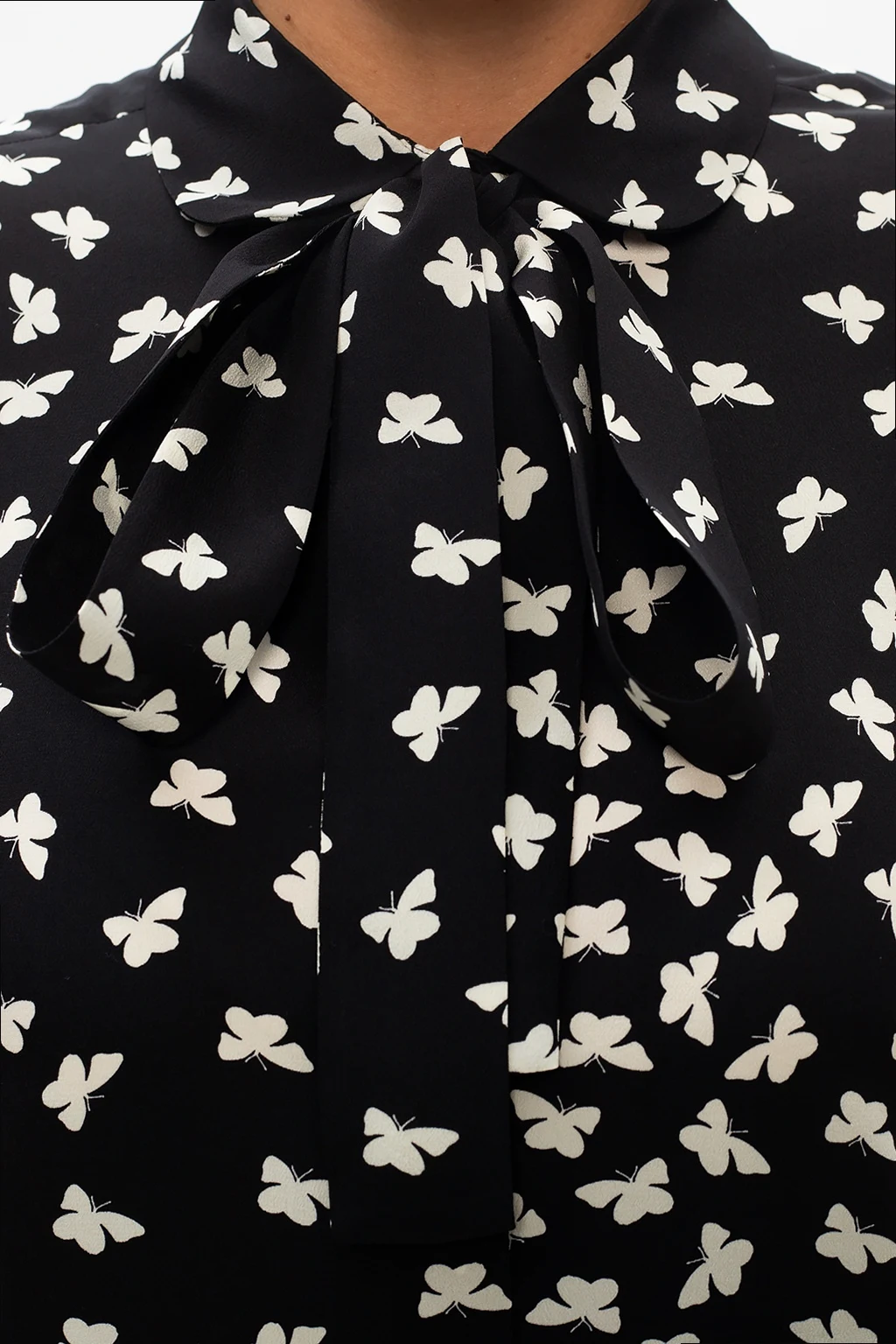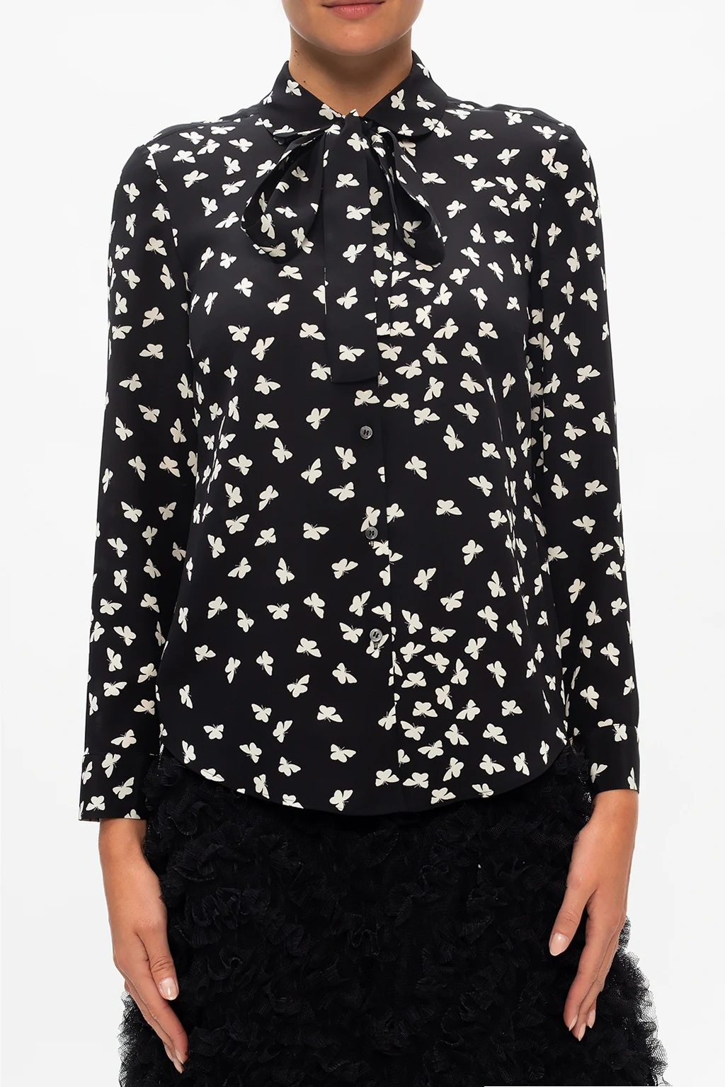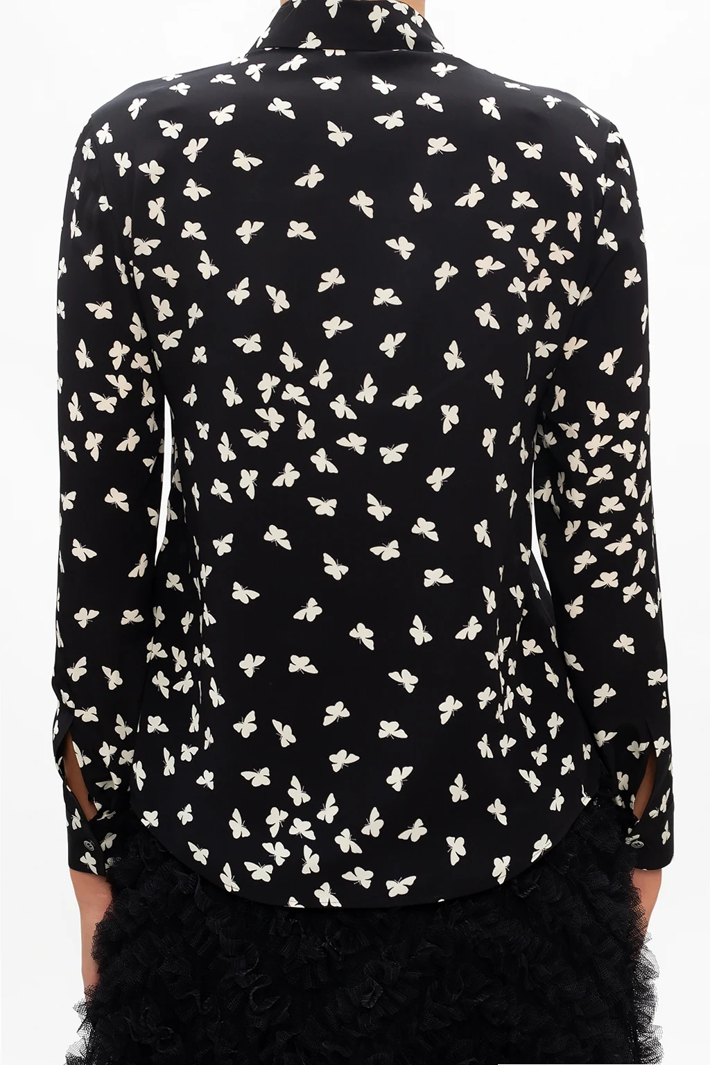 Black shirt from Red Valentino. Illustrated with an all-over butterflies print in cream, this silk-crafted style employs button fastening and long sleeves with button-fastened cuffs.