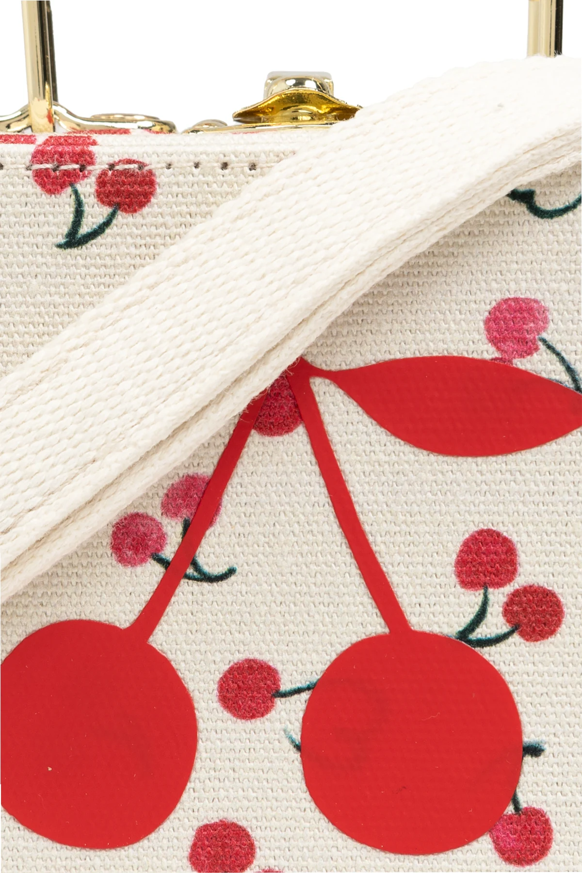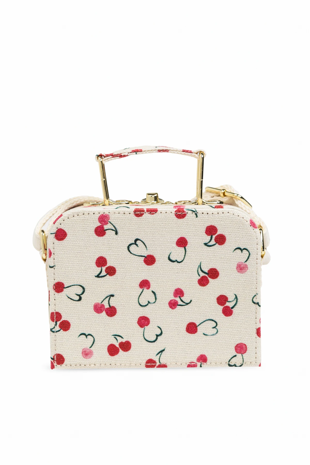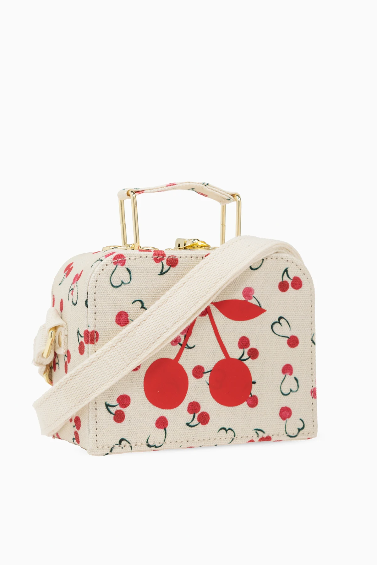 Introducing the Aimane Shoulder Bag from the esteemed children\'s collection by Bonpoint. This exclusive accessory epitomizes the quintessence of luxury and charming sophistication. The bag boasts a rectangular shape with rounded corners, presenting as a mini trunk. Adorned with a delightful pattern of small red cherries evenly distributed across its canvas-like texture, it features a larger print of two cherries with stems on the front. The exterior material is reminiscent of canvas, providing a textured surface, while the interior is lined with rich red fabric. The golden metal elements including the clasp and hinges, add a touch of opulence. The short handle, also adorned with the cherry motif, complements the long, detachable cream strap, allowing for versatile wear on the shoulder. Inside, the bag is marked with the designer\'s logo, accompanied by an additional cherry motif. This meticulous attention to detail and quality is characteristic of Bonpoint\'s heritage. Why Choose This Product? Elegant and charming design perfect for children. High-quality canvas-like material with a textured finish. Luxurious gold metal accents. Versatile carrying options with both a short handle and a long shoulder strap. Exclusive craftsmanship by the renowned Bonpoint brand.