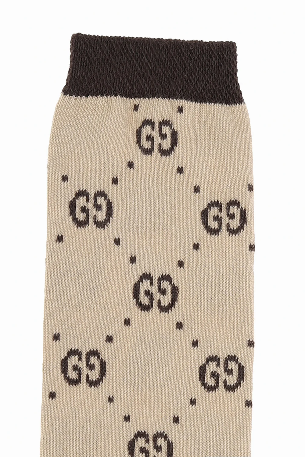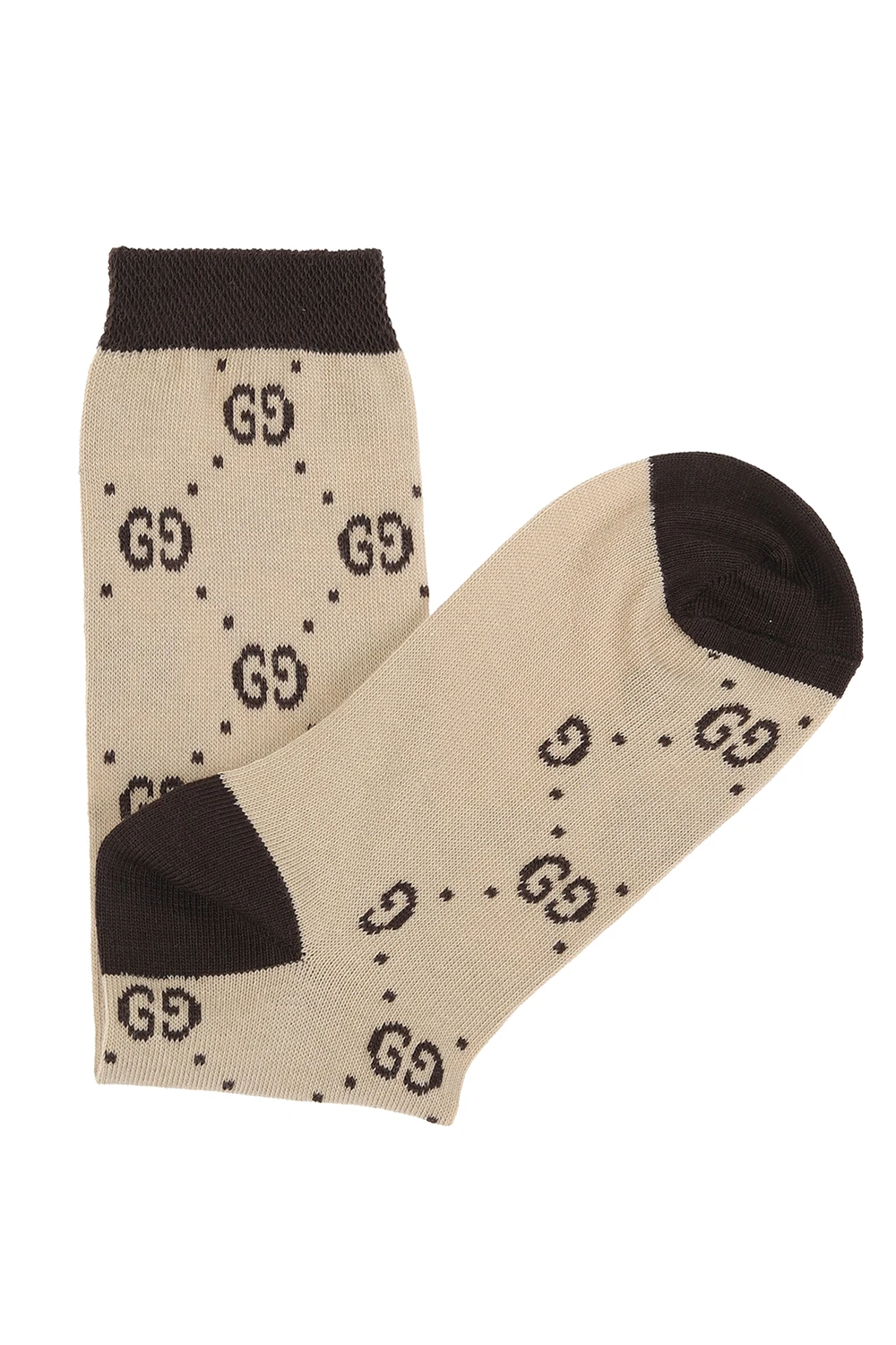Beige and brown socks from Gucci Kids. Crafted from cotton, this design is enriched by a brown logo pattern and ribbed trims.