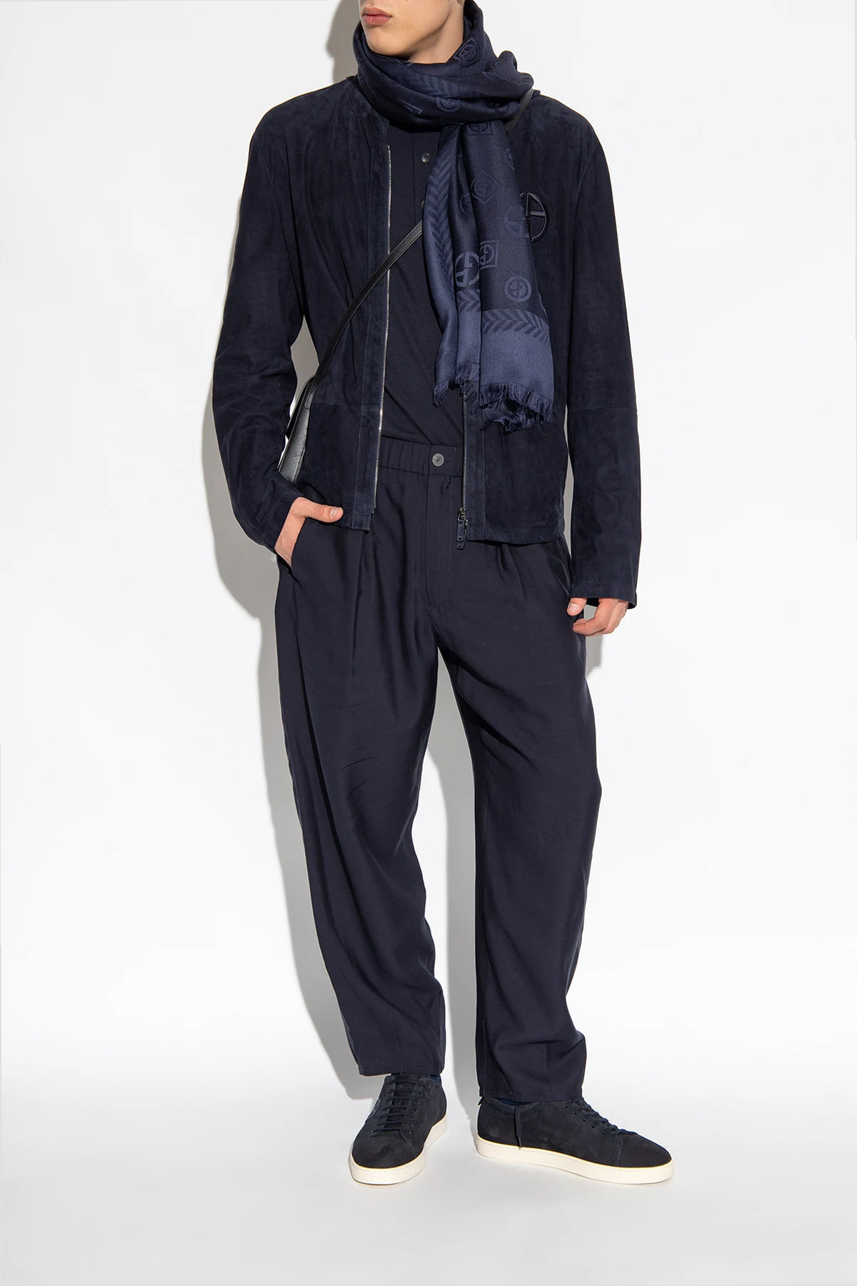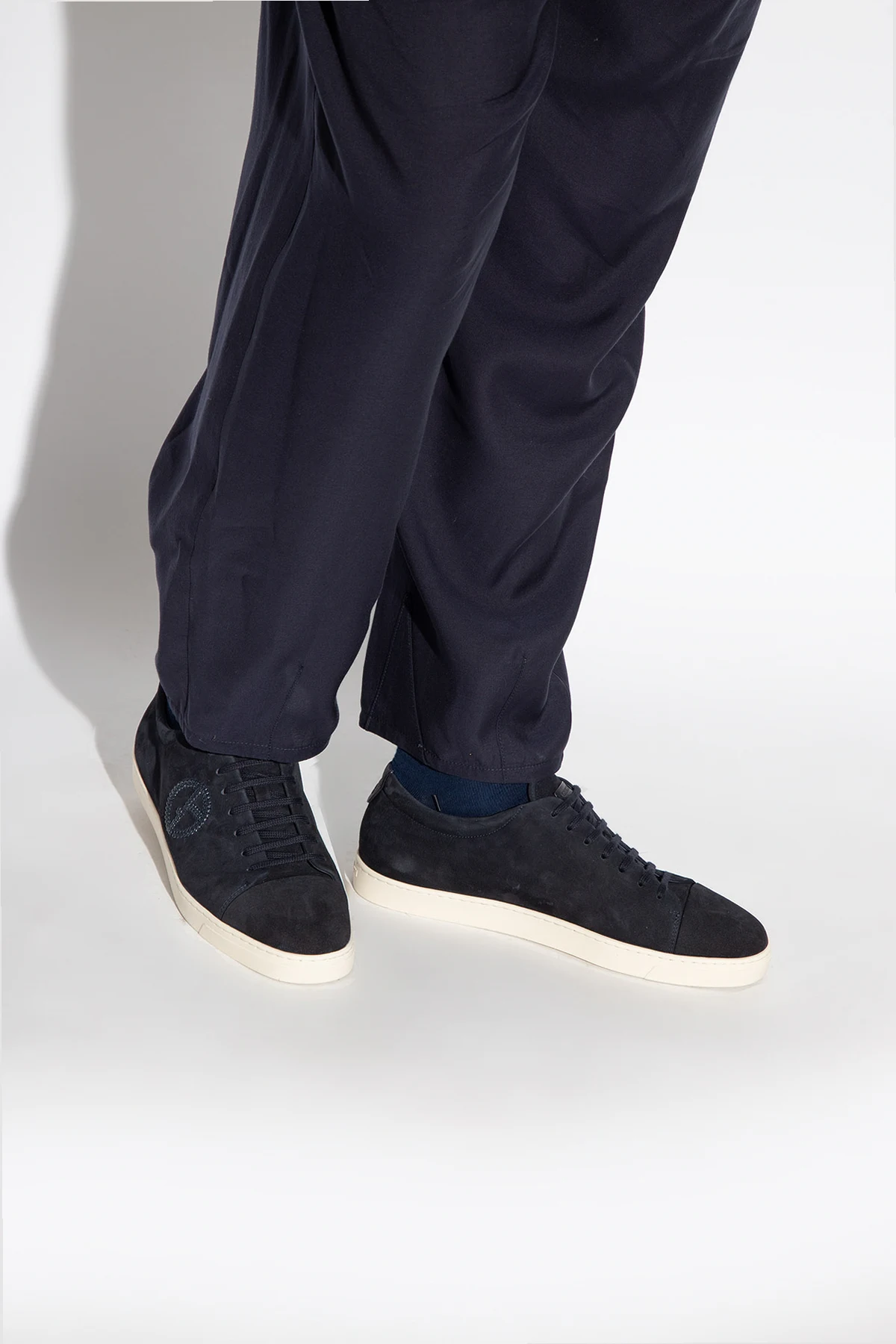 Navy sneakers from Giorgio Armani. Made of suede, this pair features a logo embroidery and cream rubber sole.