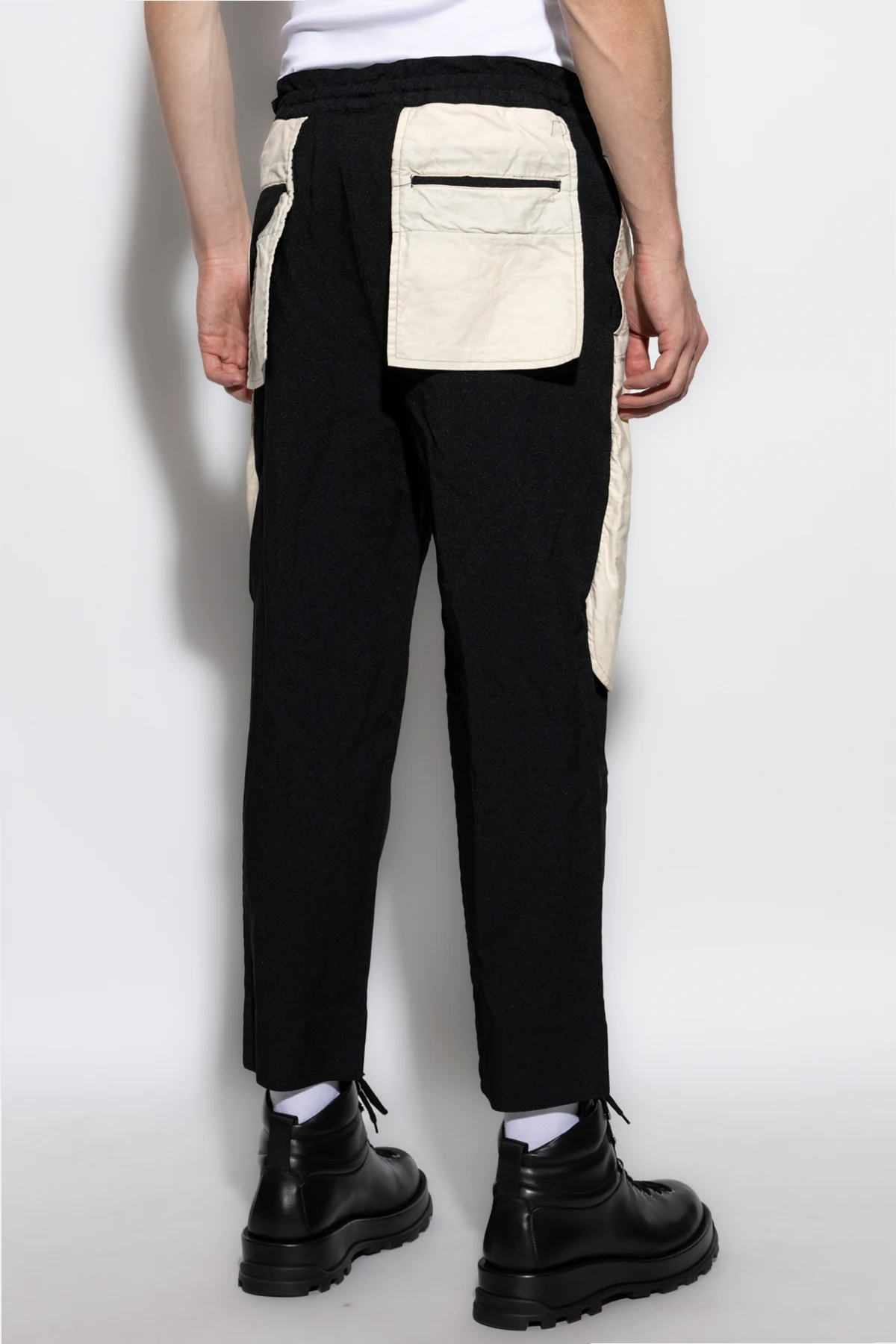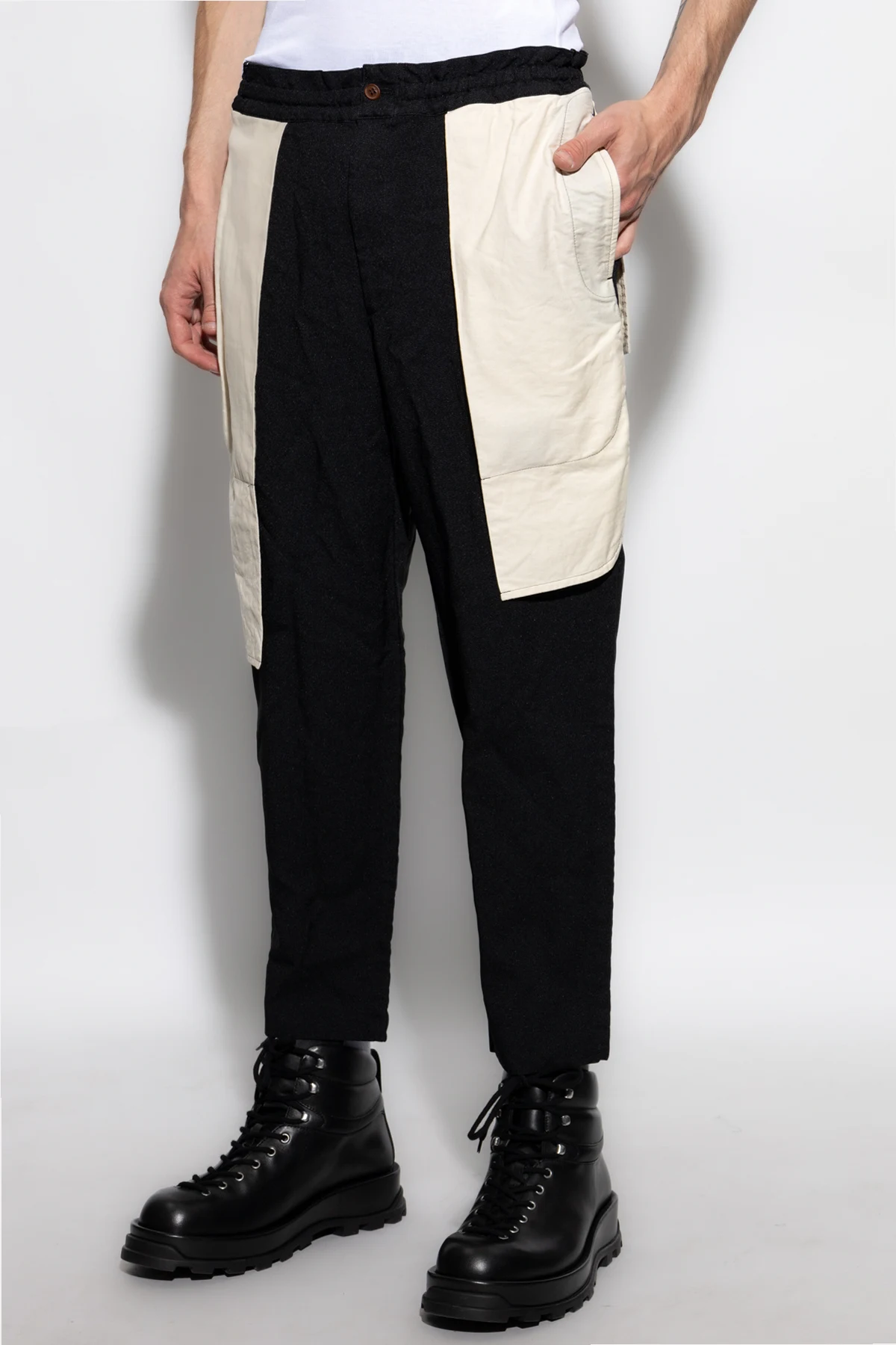 Introducing the Loose-Fit Trousers by the illustrious Comme des Garçons Black, a sophisticated fusion of modernity and casual elegance. These trousers, a testament to the seamless blend of style and functionality, are crafted from premium cotton, ensuring an unmatched comfort. The trousers feature a striking black hue accented with bold white panels on the sides, exuding a dynamic visual appeal. The loose fit coupled with slightly cropped legs lends a contemporary urban flair, perfect for the discerning fashion aficionado. Functionality is paramount with the inclusion of large, side pockets and a practical back pocket with a buttoned flap. An elastic waistband enhances wearability, while the zipper and button closure add a touch of refinement to this modern masterpiece. Why Choose This Product? Expertly crafted in collaboration with Nike for a modern sportswear edge. High-quality cotton material for ultimate comfort. Stylish design with contrasting panels and functional pockets. Elastic waistband for a perfect fit.