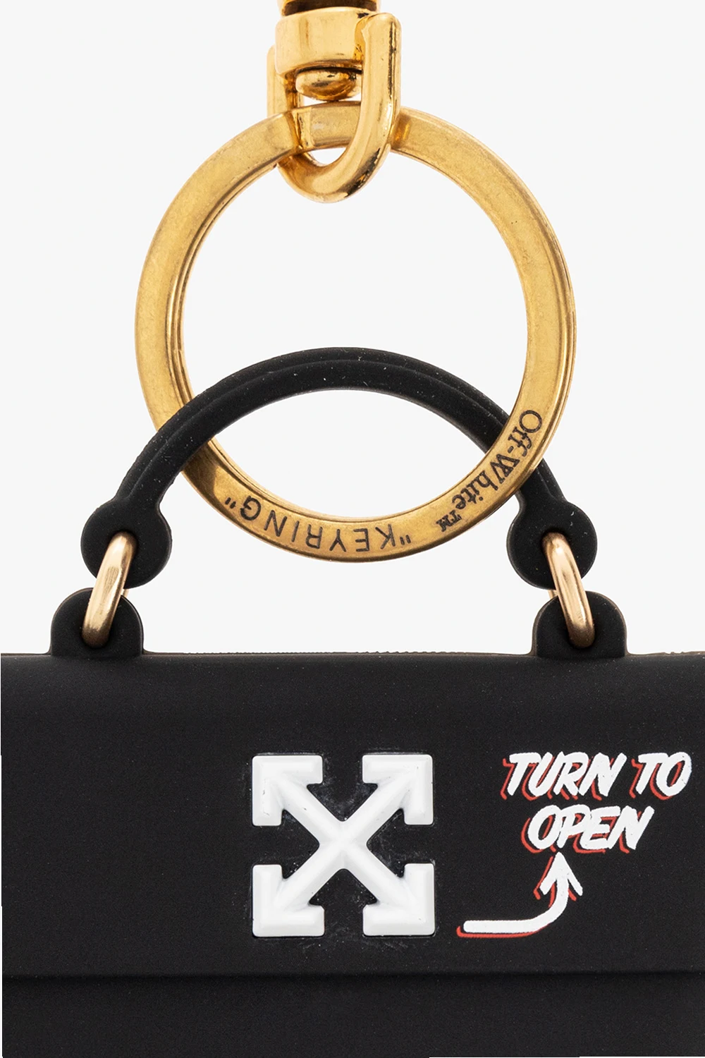 Black micro bag keyring from Off-White. Decorated with the brand’s signature white arrows and print in white and red, this item is complete with a keyring and carabiner hook in antique gold-tone.