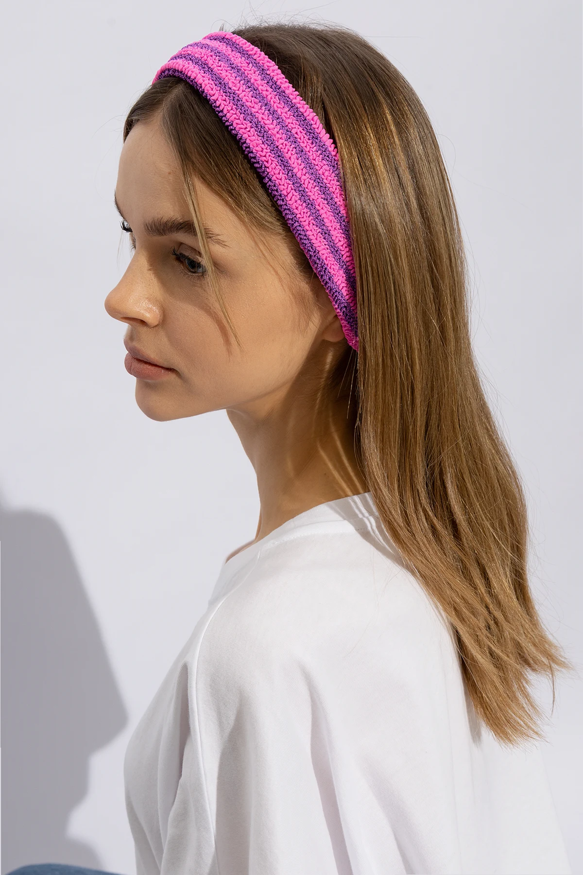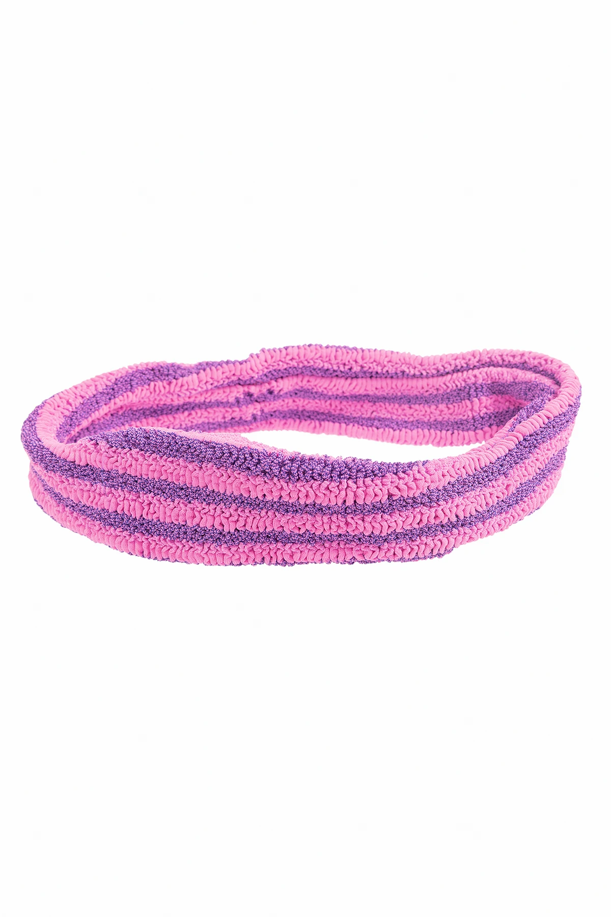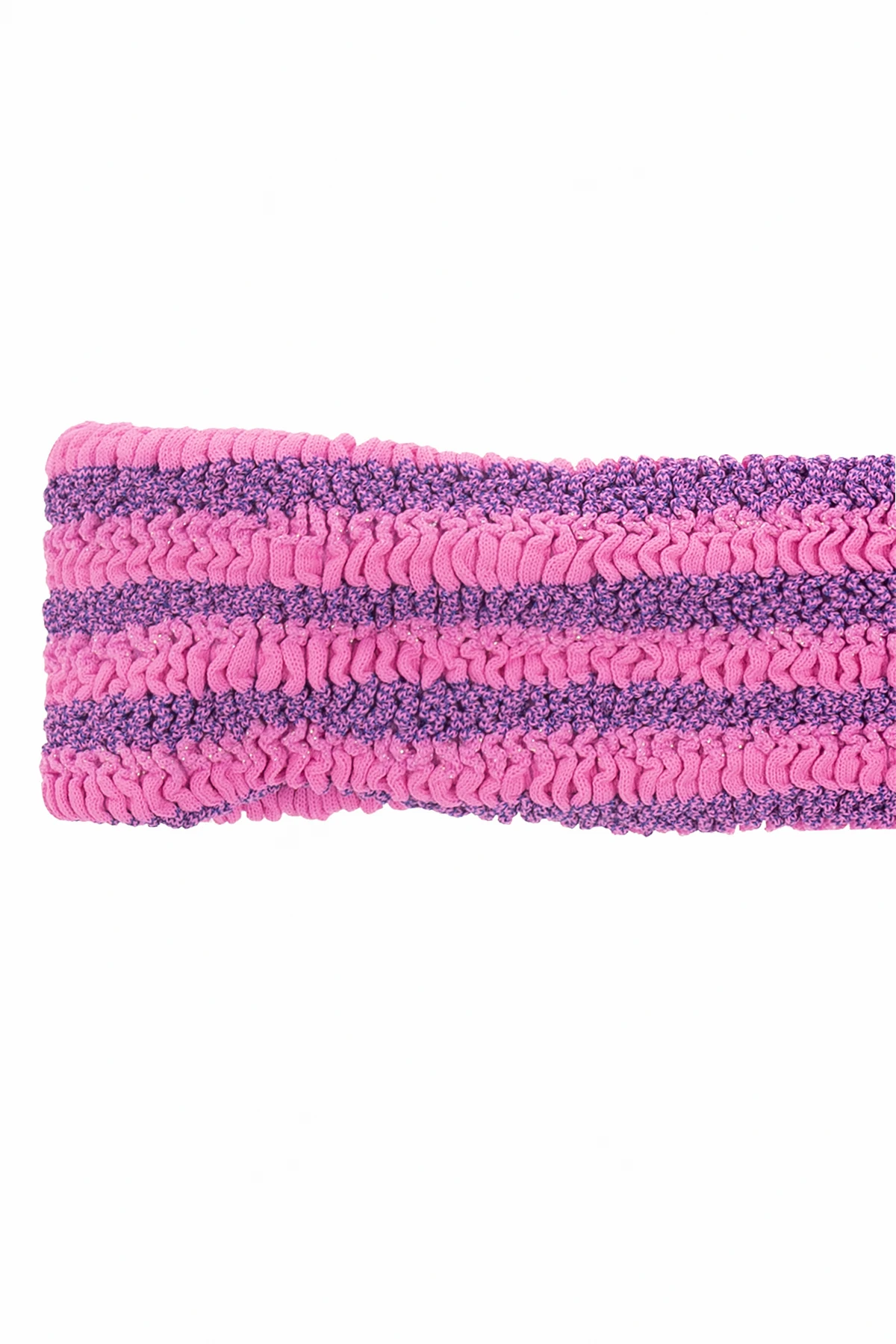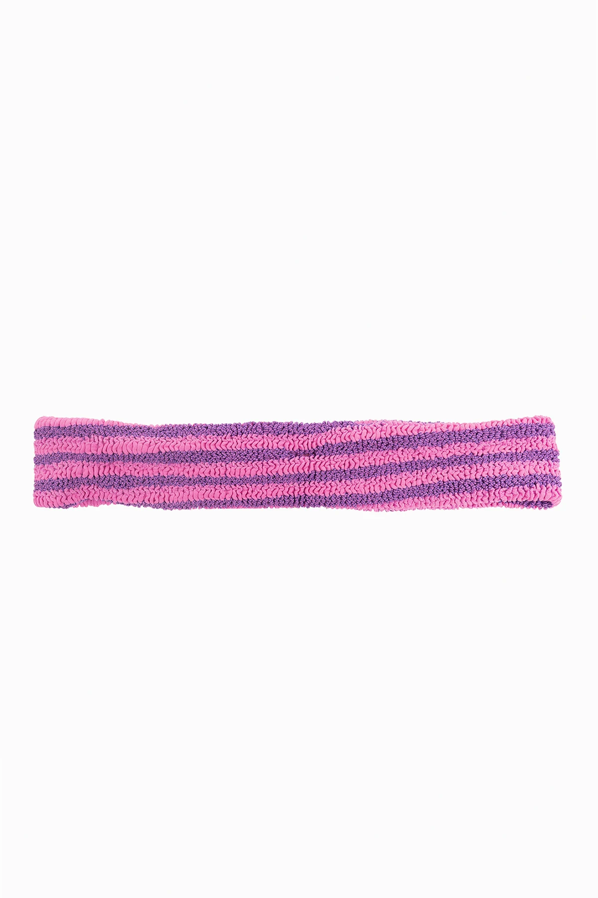 Pink and purple headband from Bond-Eye. Crafted from textured materials, this item features a stripe pattern and silver-tone lurex yarn trimming.
