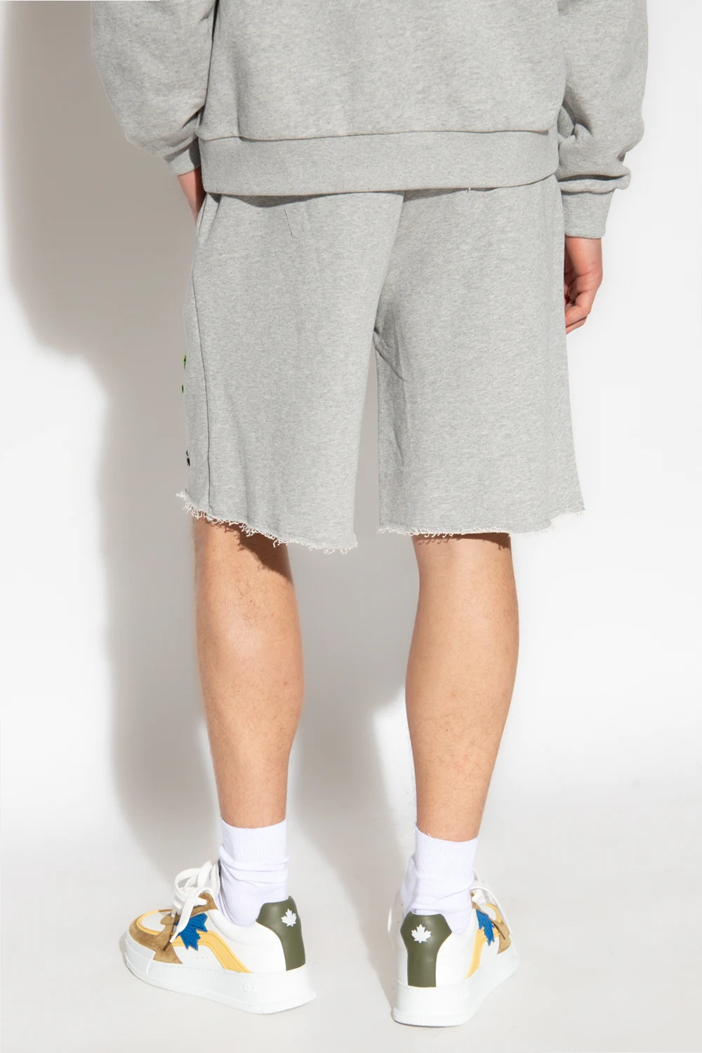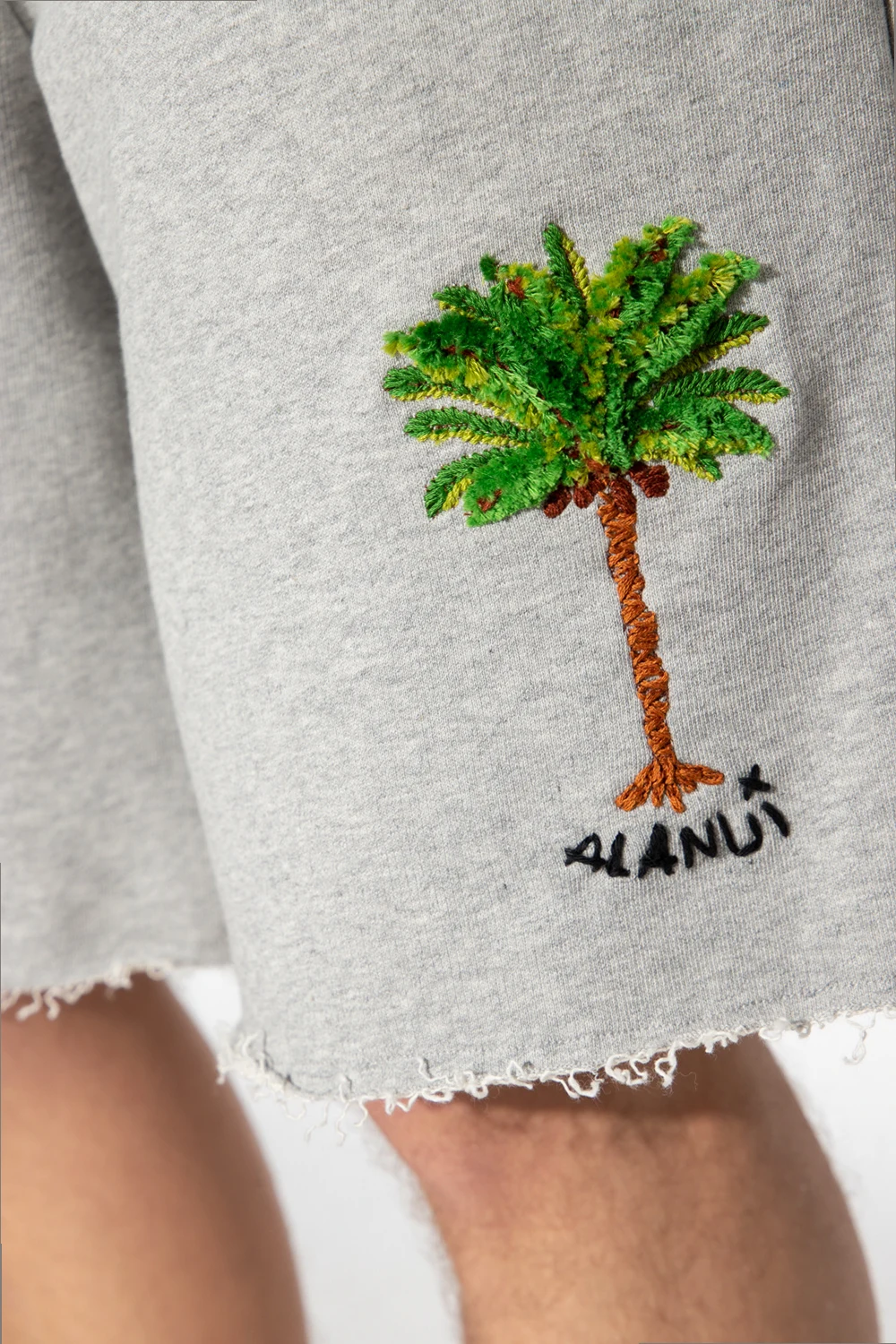 Grey shorts from Alanui. Made of cotton, this pair features an elastic drawstring waistband, embroidered logo pattern, elastic drawstring waistband, two slip pockets and raw cut edges.