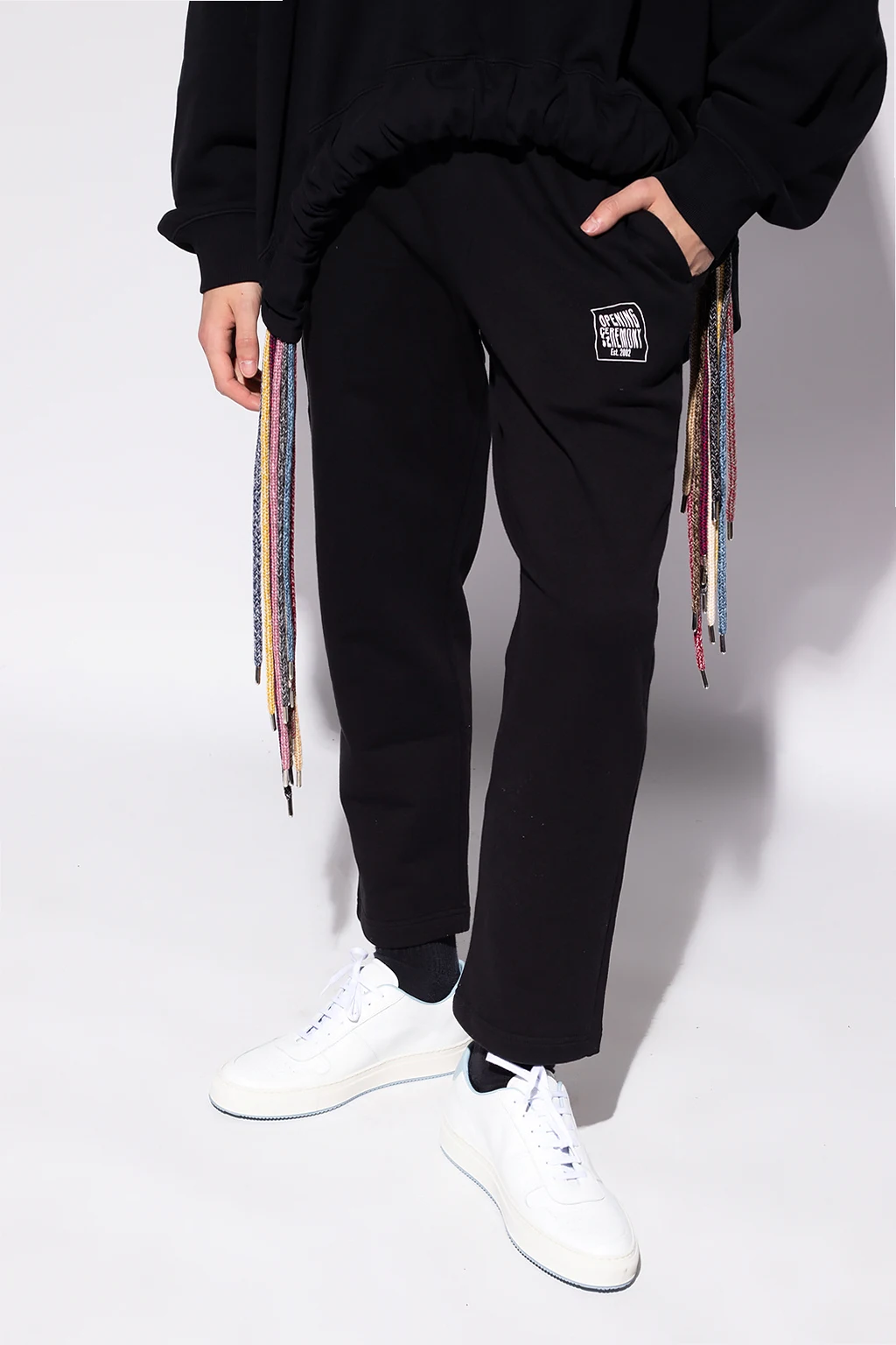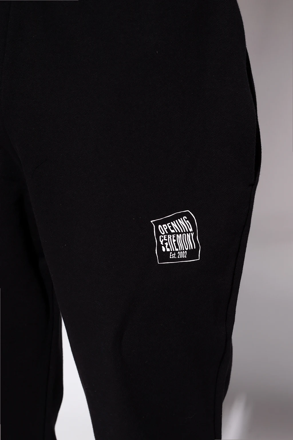 Black sweatpants from Opening Ceremony. Flaunting a white graphic print with the brand\'s logo, this cotton-crafted pair features an elasticated waistband and ribbed cuffs.