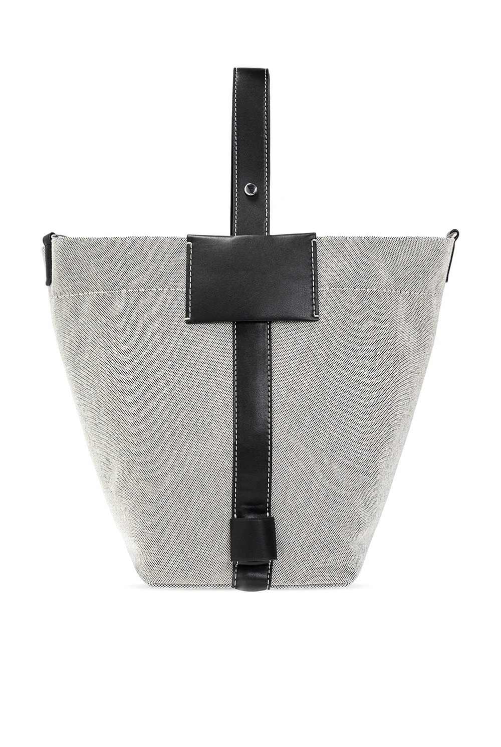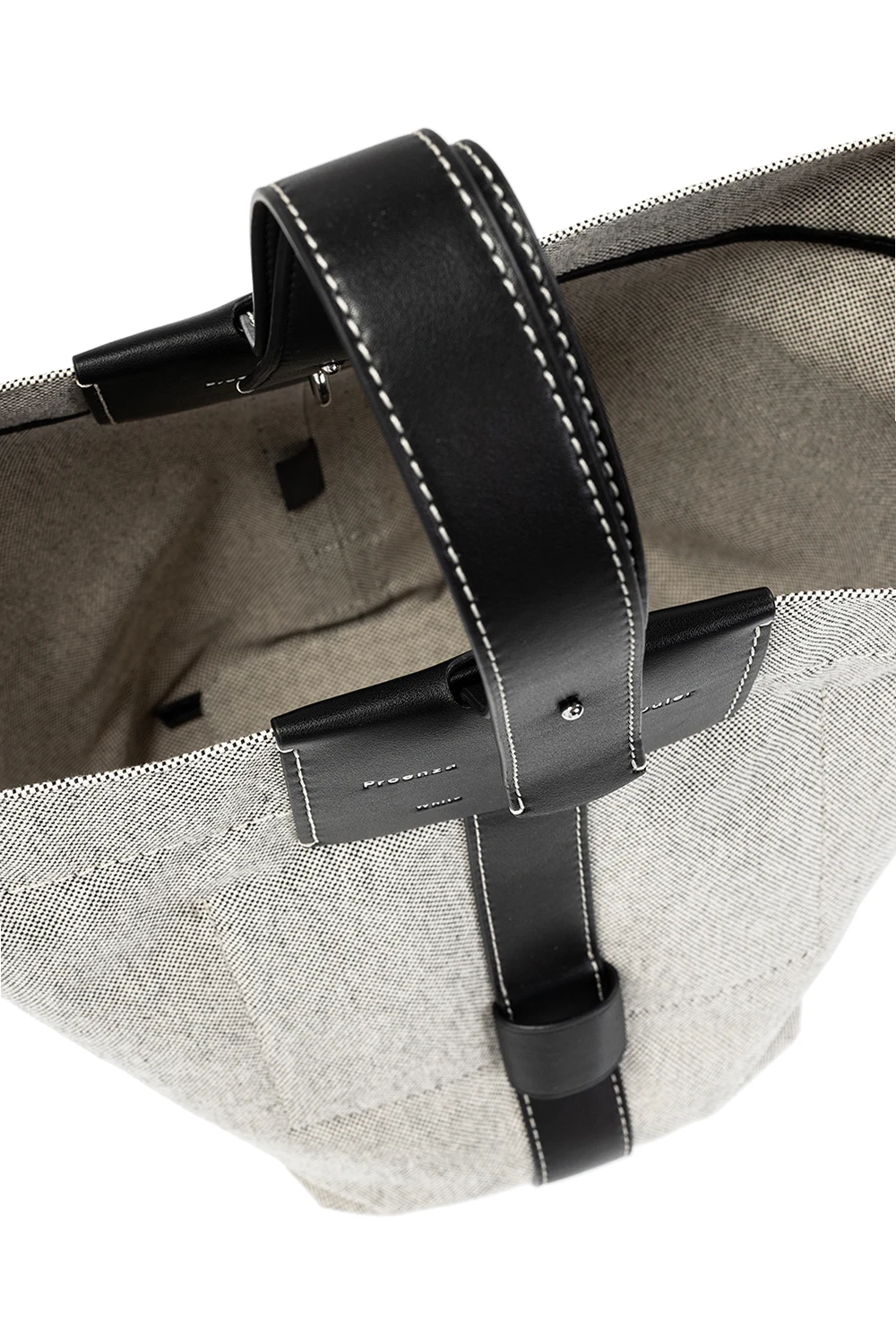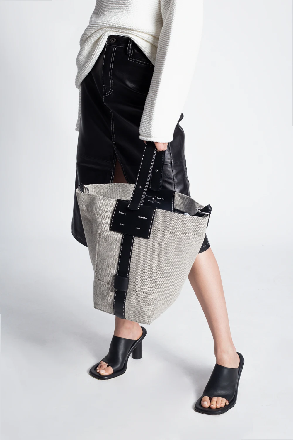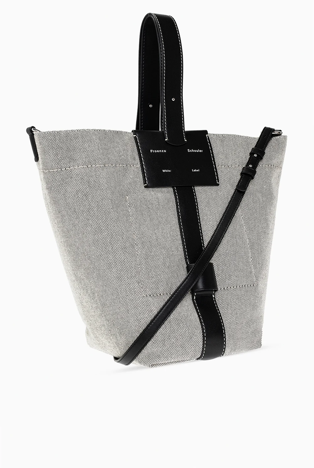 Cream and black \'Sullivan\' shopper bag from Proenza Schouler White Label. Finished with leather, this design secures with a lobster clasp and showcases an embossed white logo on the front, a half-round handle, a detachable and adjustable shoulder strap, silver-tone metal hardware and one internal compartment with one slip pocket and one zip pocket.