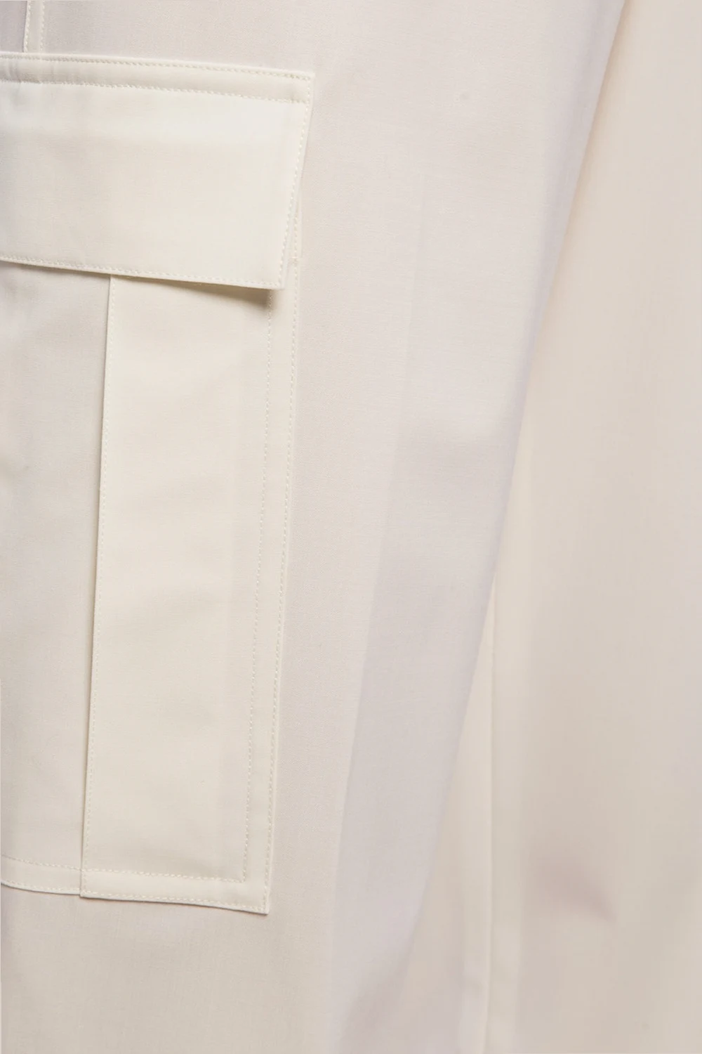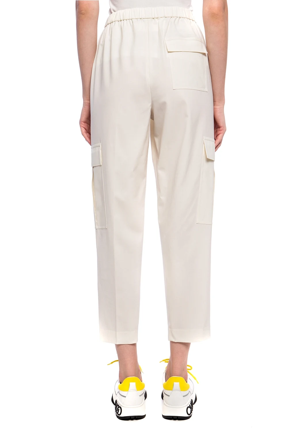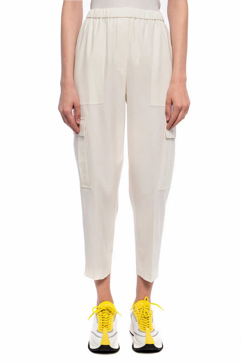 Cream loose-fitting trousers from Theory. Made of wool. Feature two slip pockets and three flap pockets. Drawstring waist. Tapered legs.