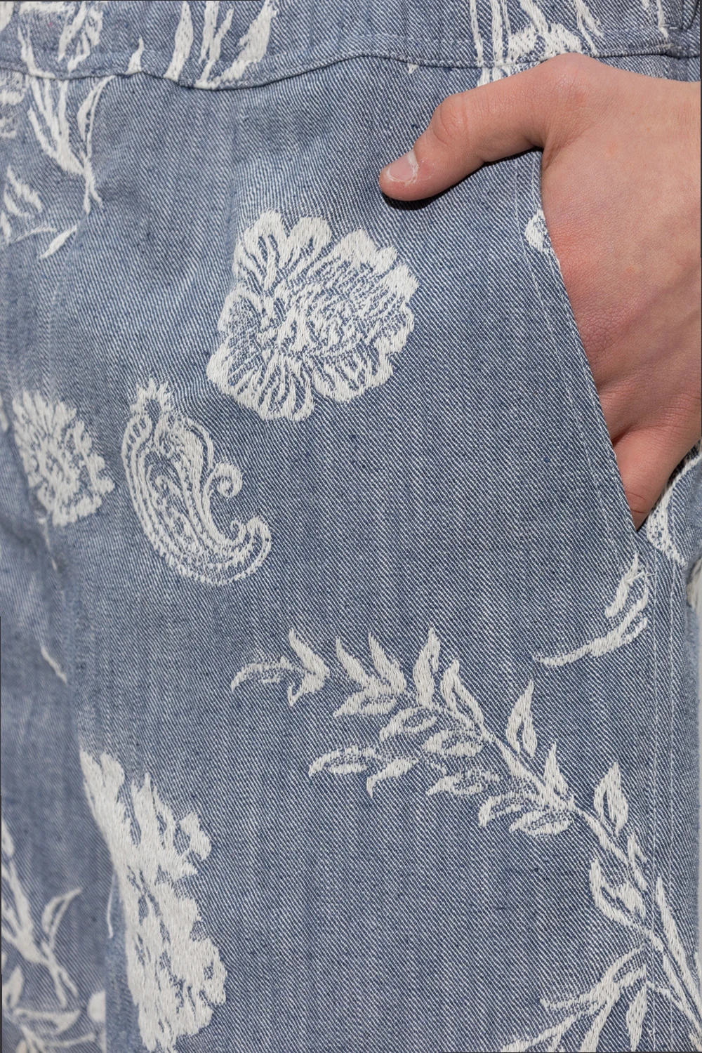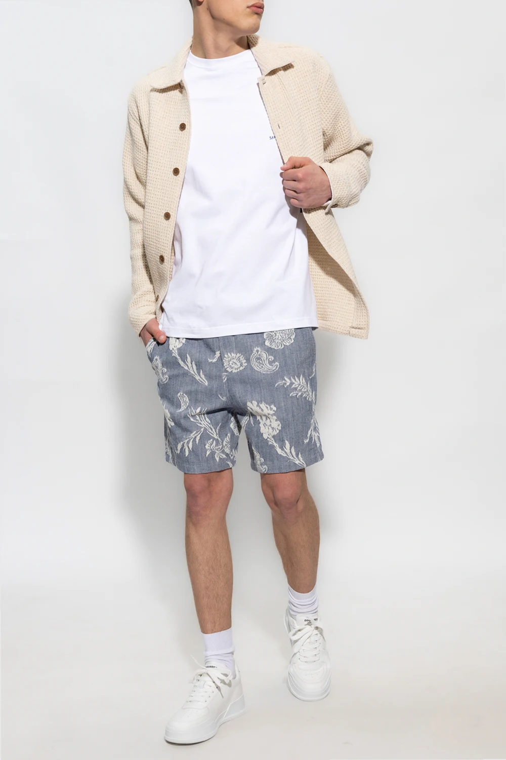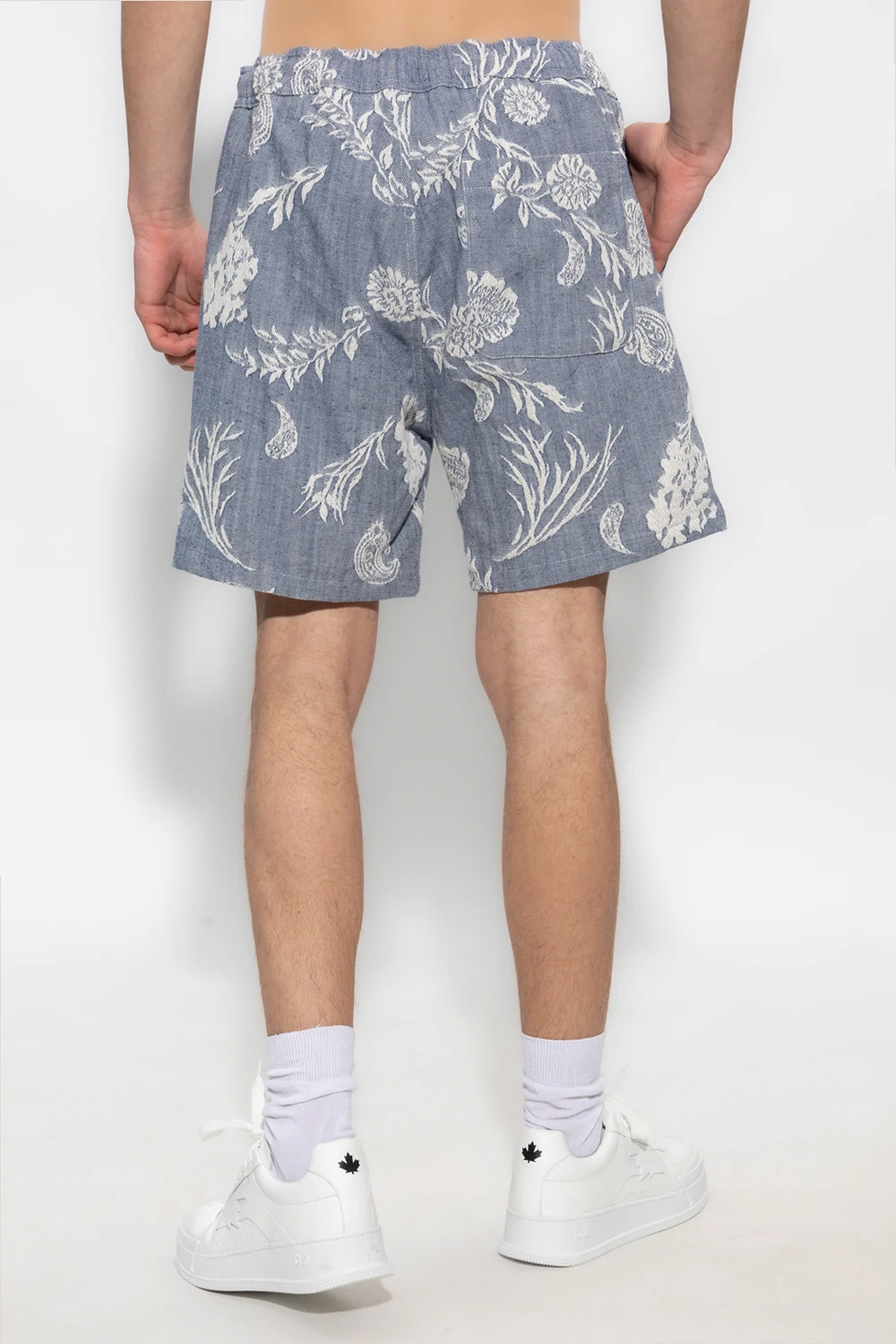 Blue and white ‘Jabari’ shorts from Samsoe Samsoe. Crafted from cotton, this pair features an elastic drawstring waistband, floral pattern and three slip pockets.