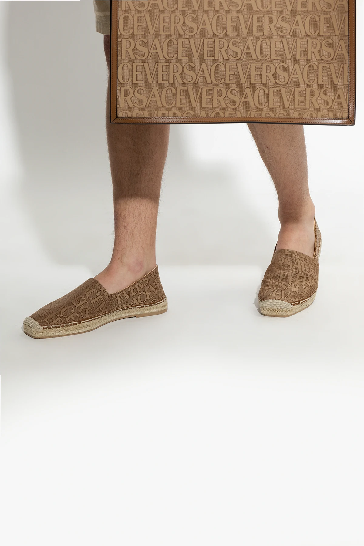 Beige and brown espadrilles from Versace. Resting on a beige jute-trimmed rubber sole, this pair is decorated with a jacquard logo pattern.