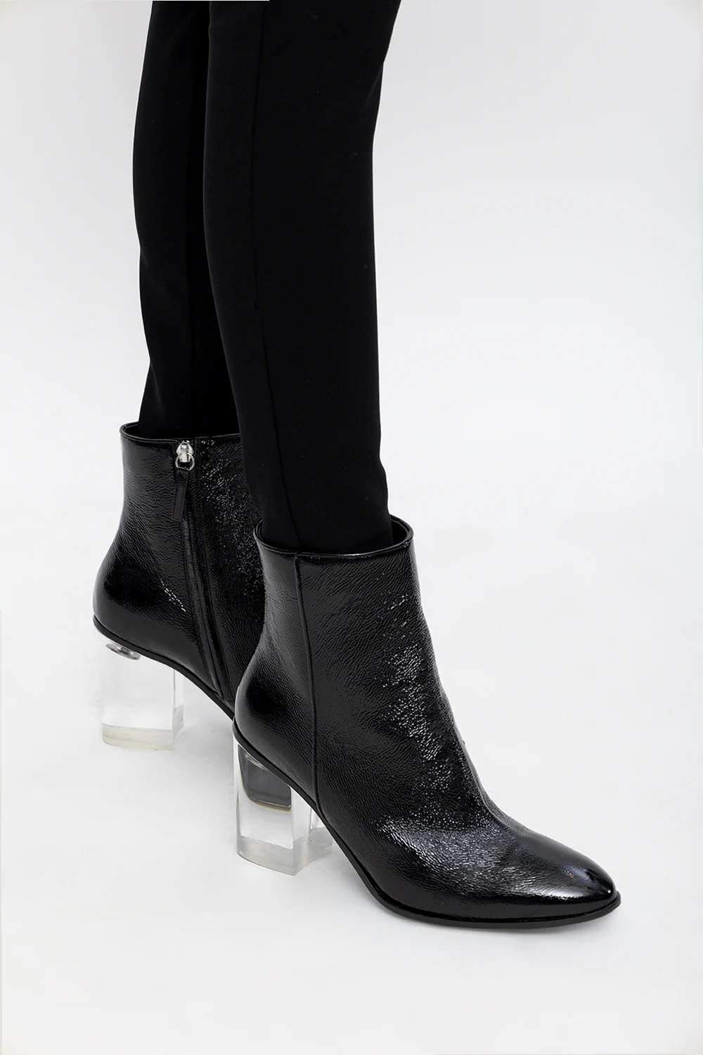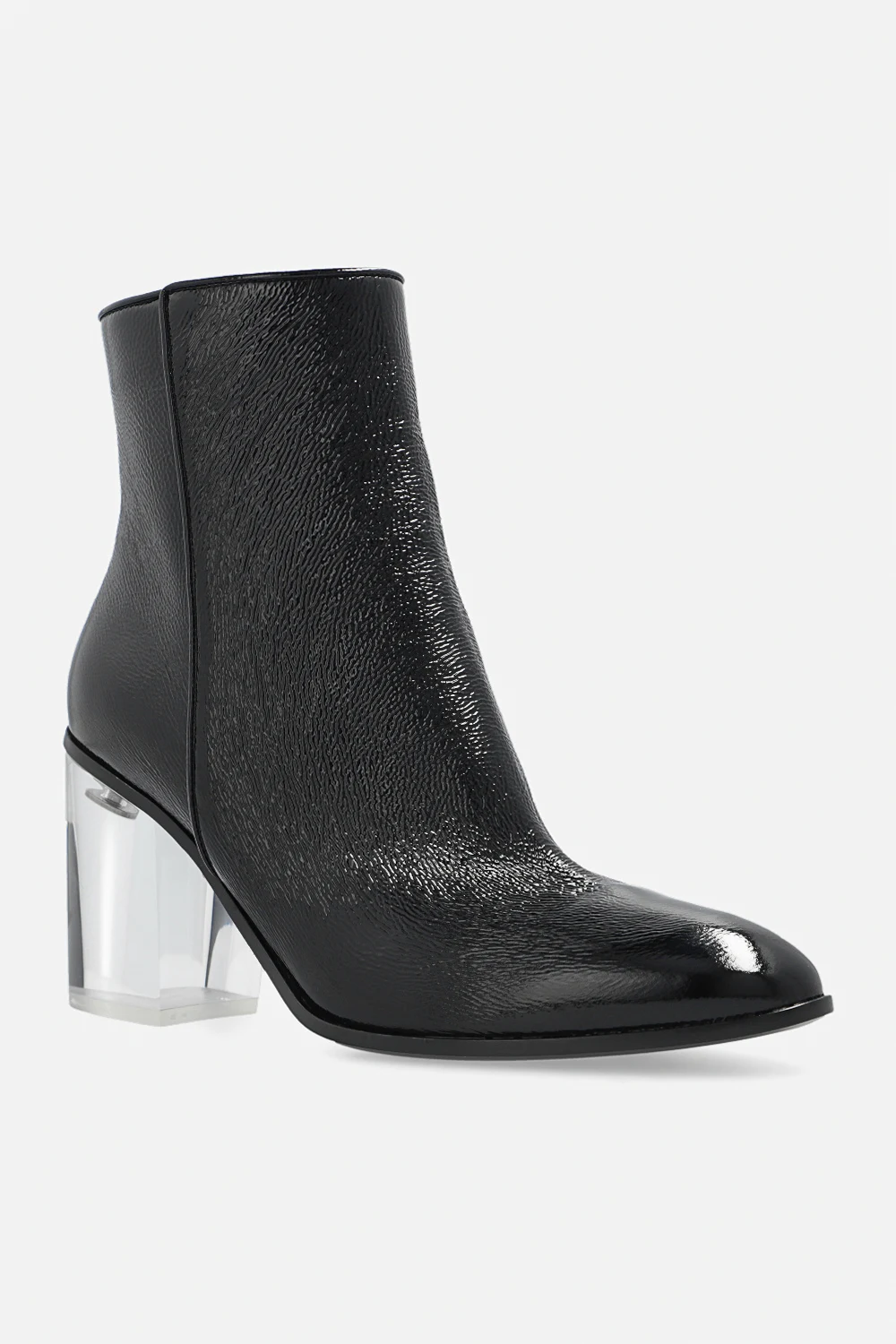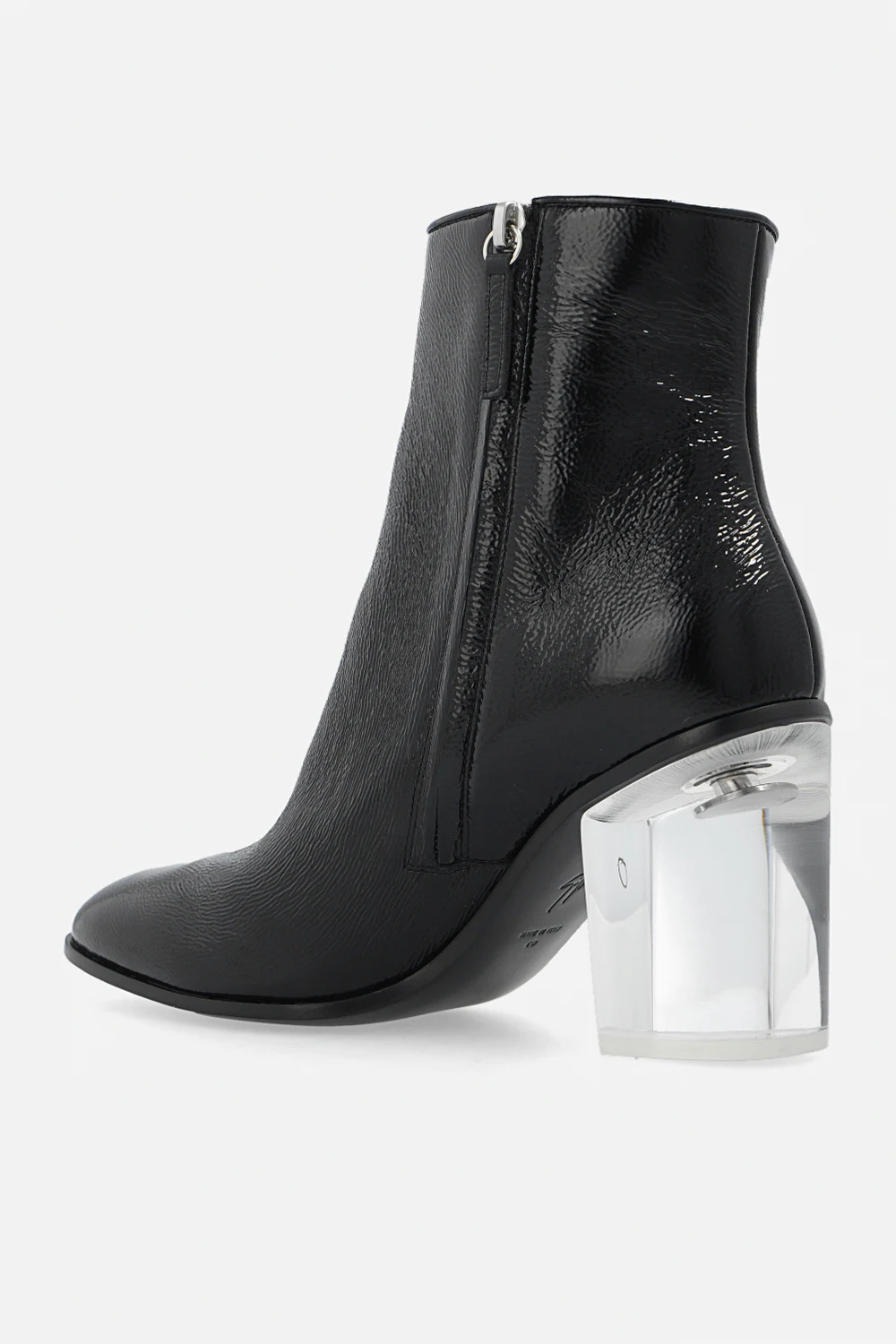 Black heeled ankle boots from Giuseppe Zanotti. Made of textured leather, this pair features a side zip, almond toe, decorative transparent heel and black leather sole with rubber trims.