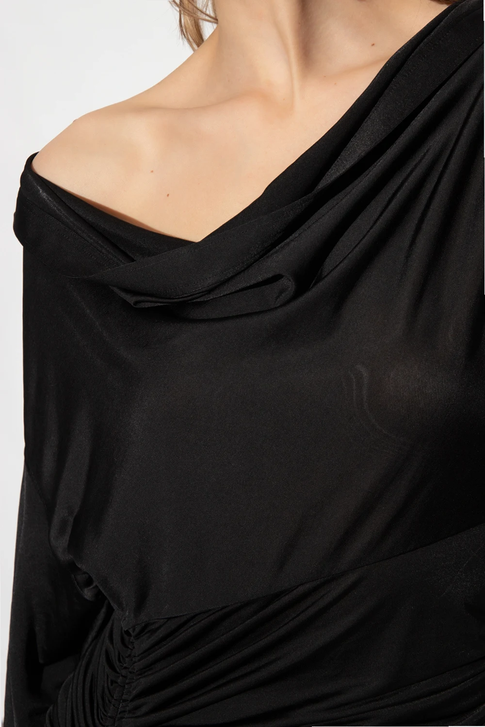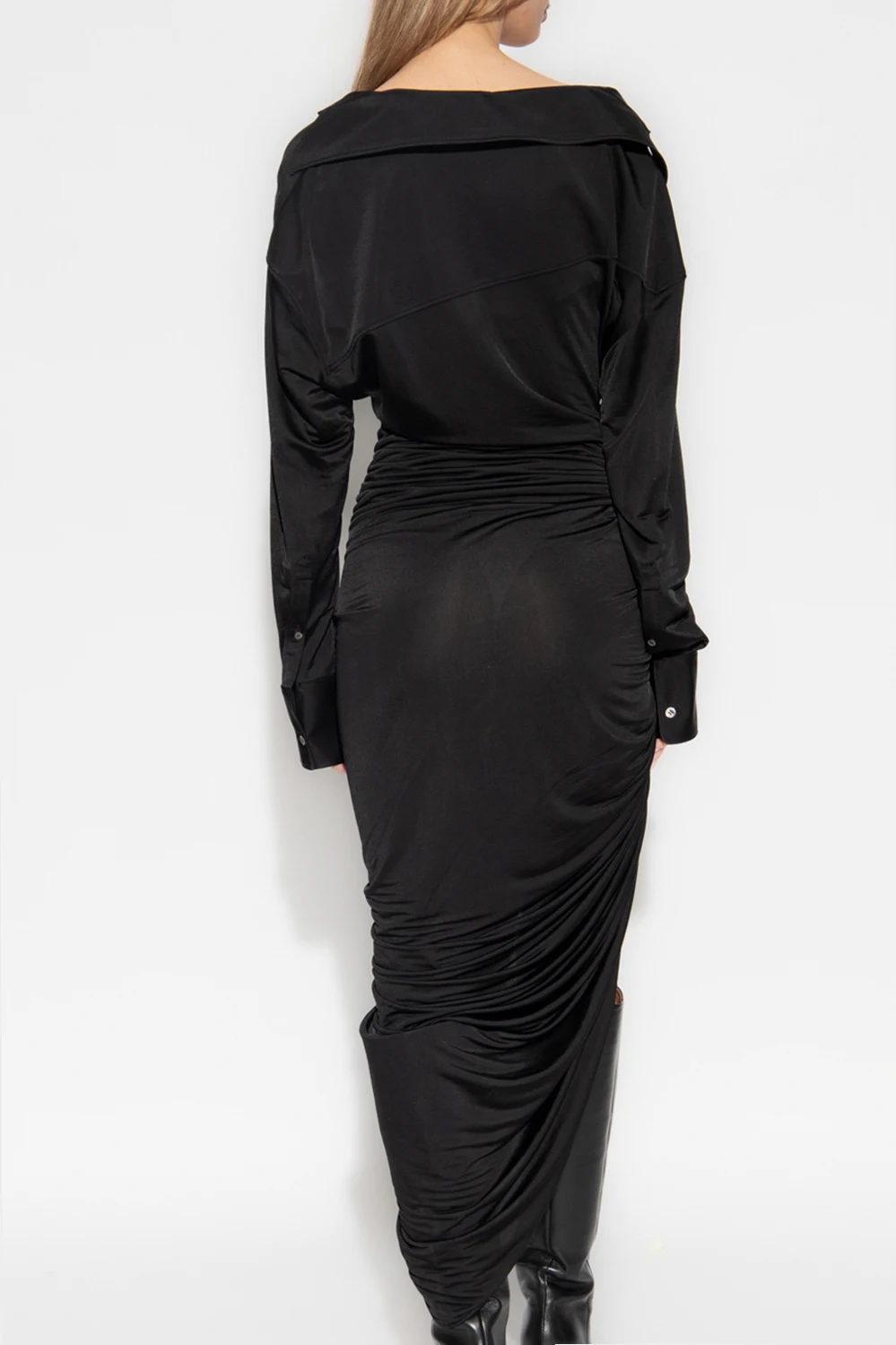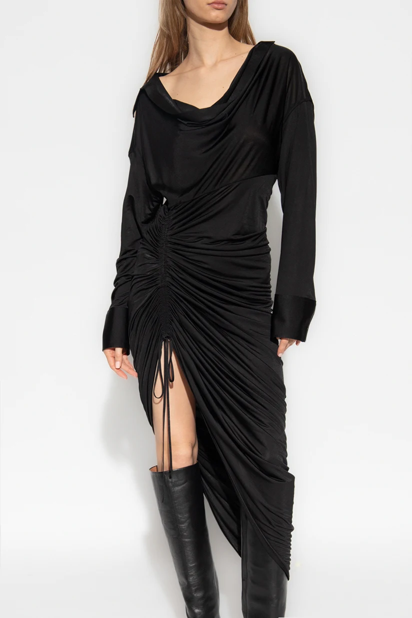 Black asymmetric dress from Alexander Wang. Fastened with a concealed zip and drawstrings, this design features a draped neck with a collar and long sleeves with buttoned cuffs.