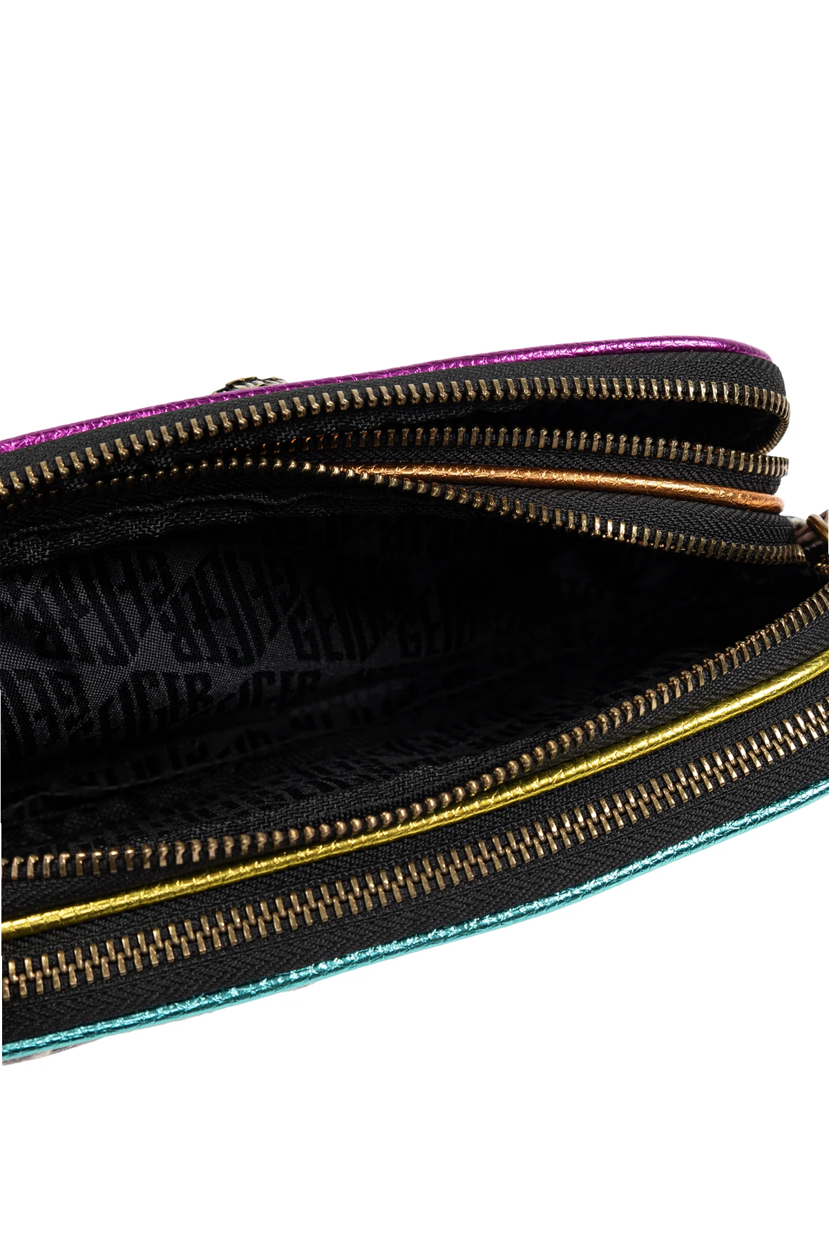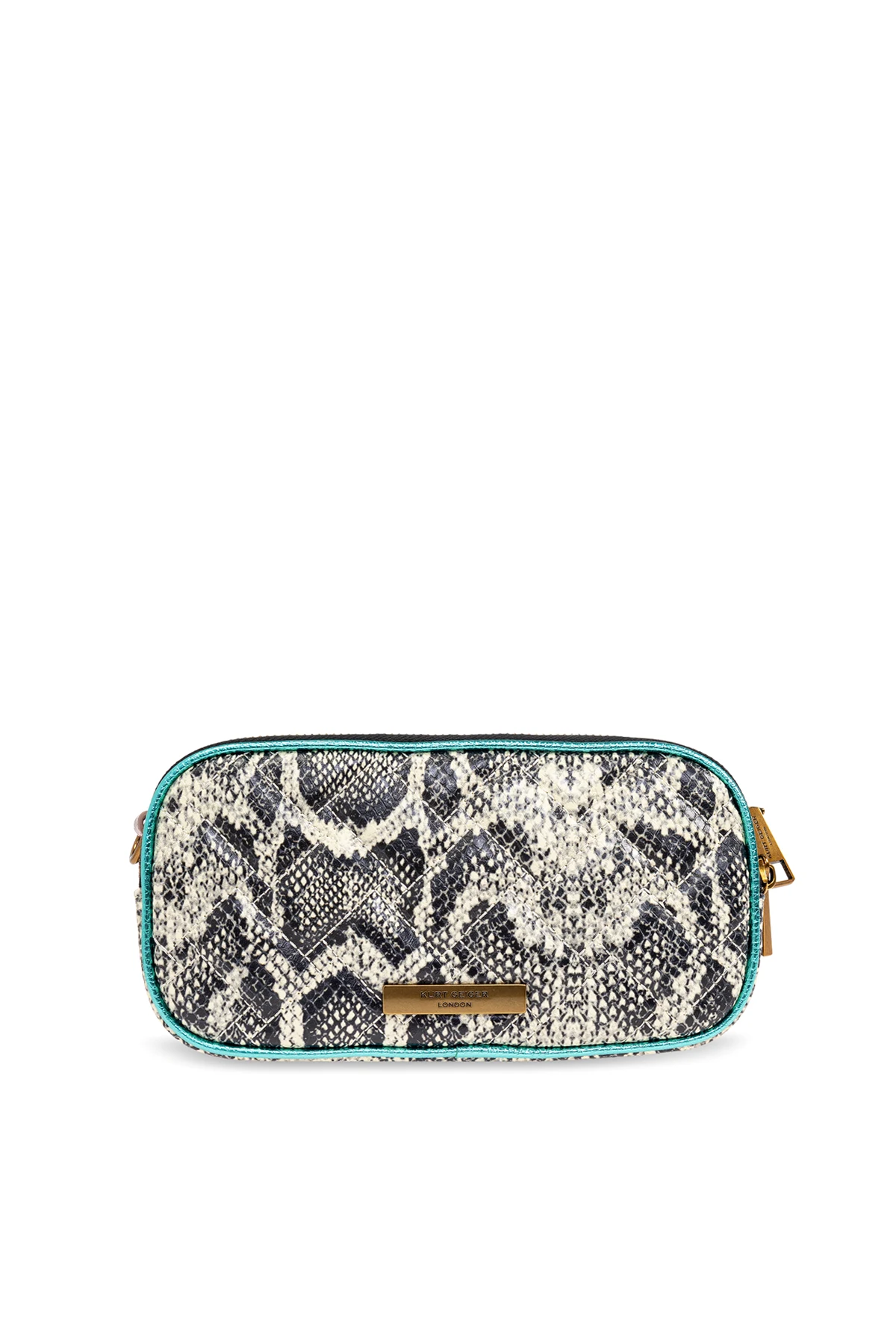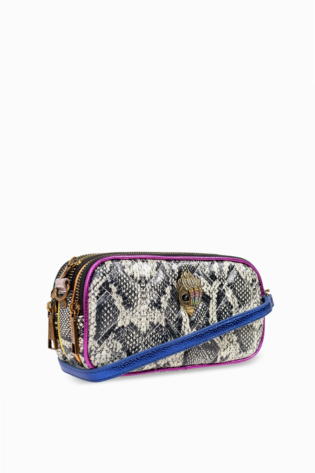 Introducing the Kensington Quilted Shoulder Bag from the illustrious Kurt Geiger collection, a masterpiece of luxury and individuality. This exquisite bag showcases a captivating snake-skin pattern in shades of black and white, accentuated by a striking metal embellishment shaped like an animal head, adorned with vibrant crystals. Crafted from premium leather on the exterior and lined with high-quality polyester, this bag is both durable and refined. The contrasting pink piping and textured blue shoulder strap offer a playful contrast, while the back proudly displays the designer\'s metal logo. Inside, the bag reveals a signature logo print lining, accessible via dual zippers with colorful accents. Why Choose This Product? Unique snake-skin pattern with luxurious crystal embellishments. Contrasting details for a bold fashion statement. Designed by the renowned British brand, Kurt Geiger. High-quality leather exterior and polyester lining for longevity.