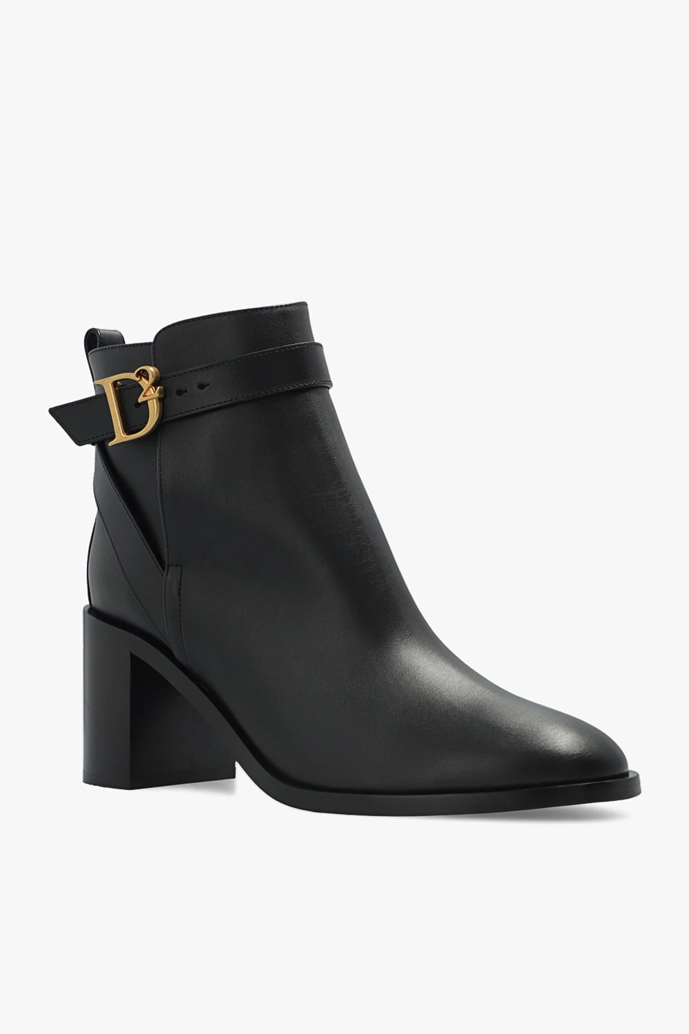 Black ‘Statement’ heeled ankle boots Dsquared2. Crafted from leather, this model sits on a black rubber sole and features an almond-shaped toe and a buckle strap fastening at the ankle.