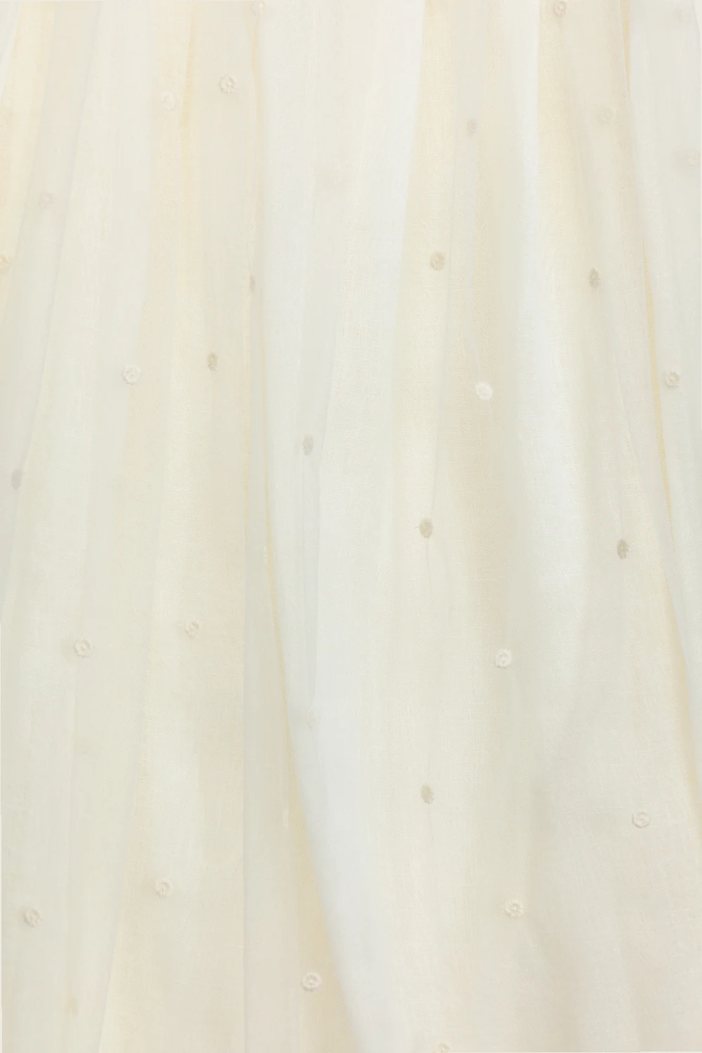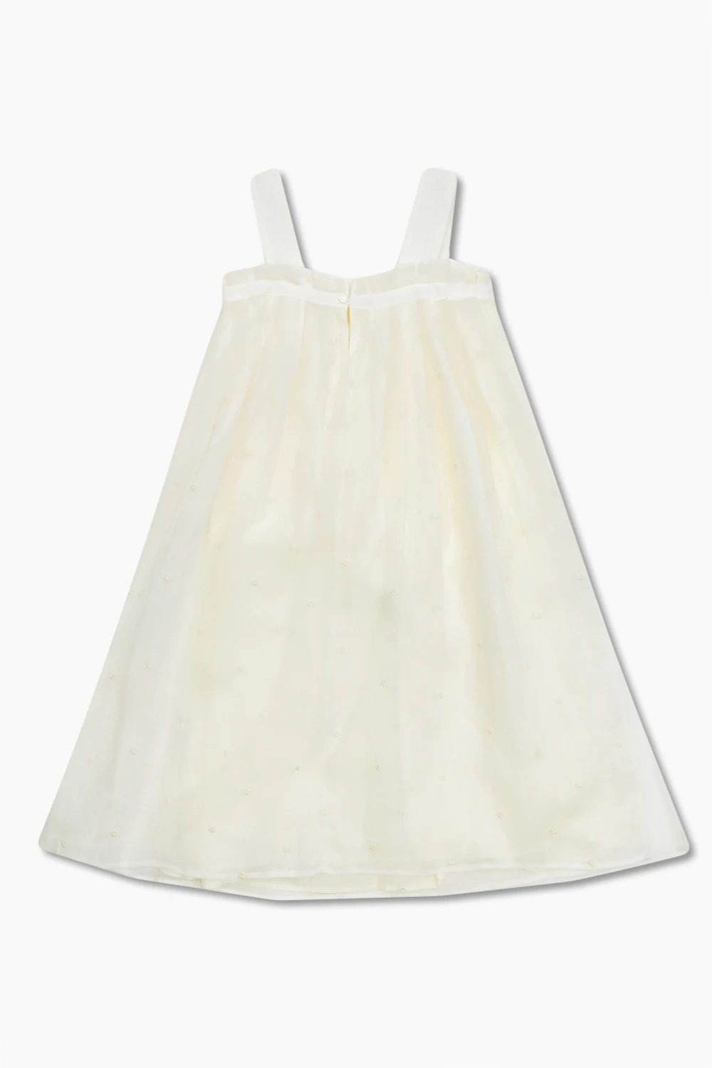 White slip dress from Bonpoint. Made from tulle, this style features a flared silhouette and a floral pattern.
