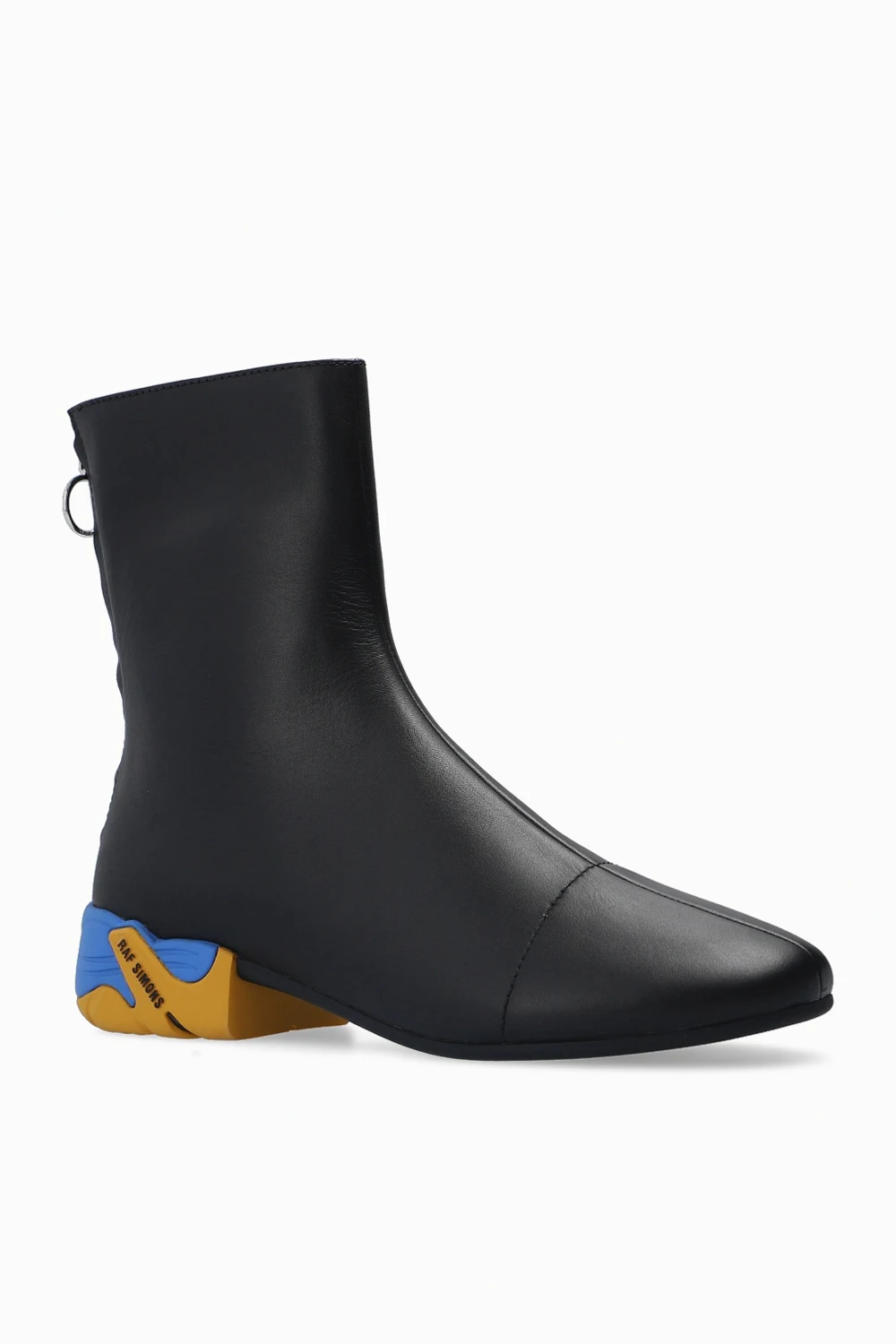 Black ‘Solaris-2’ heeled ankle boots from Raf Simons. Crafted from leather, this model fastens at the back with a zip and features elastic side panels, a decorative heel in yellow and blue with a raised logo as well as a black rubber sole.