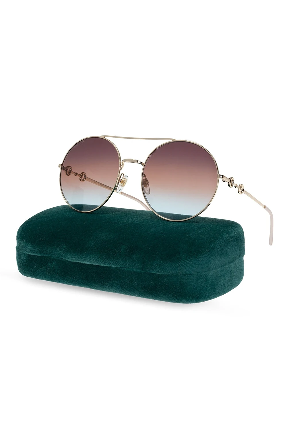 Gold-tone round sunglasses from Gucci. This model features the iconic horsebit on the temples and brown, purple and blue shaded lenses with 100% UVA/UVB protection.