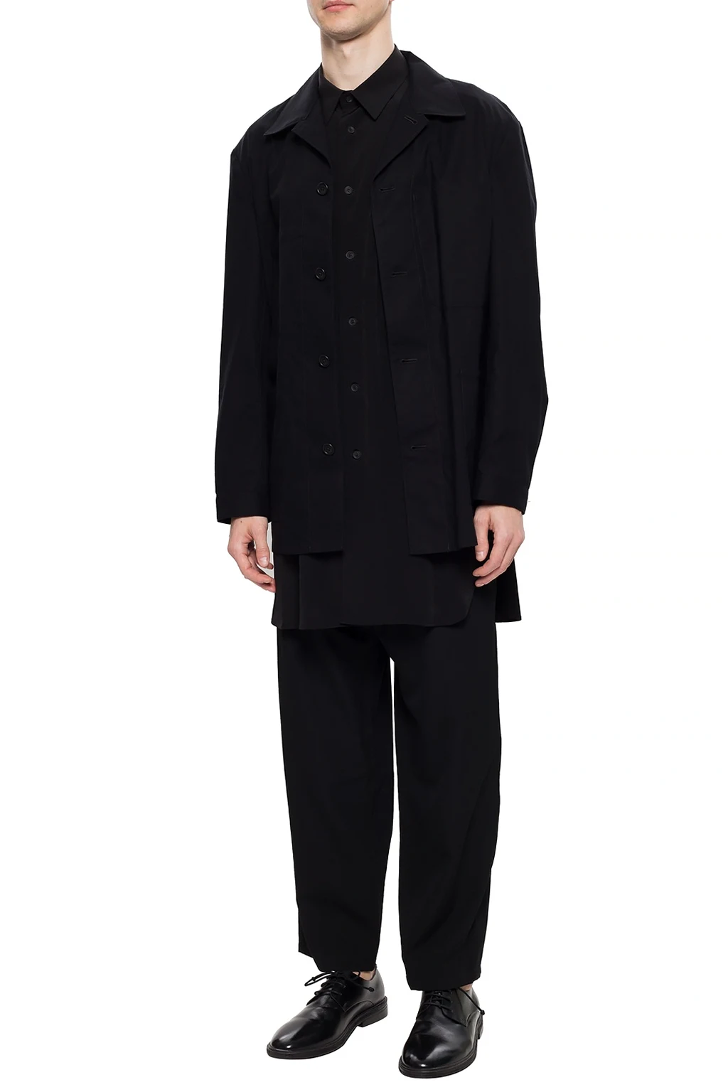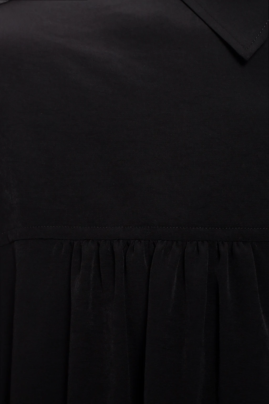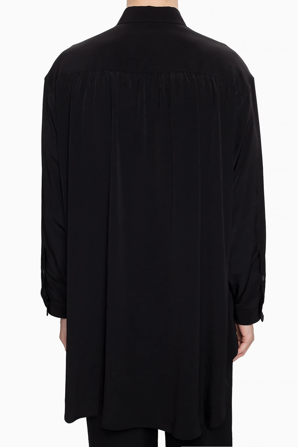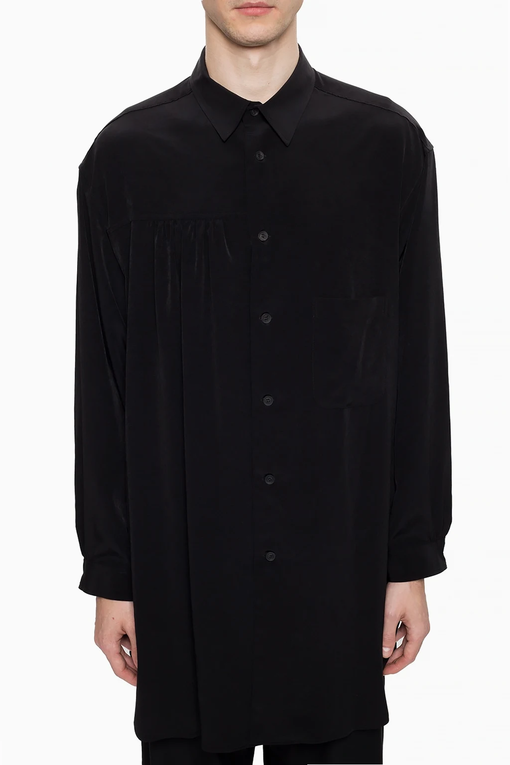 Black shirt with gathers from Yohji Yamamoto. Fastened with buttons. Slip pocket on the front. Long sleeves with button cuffs.